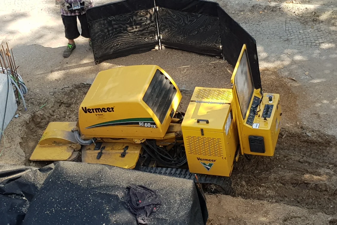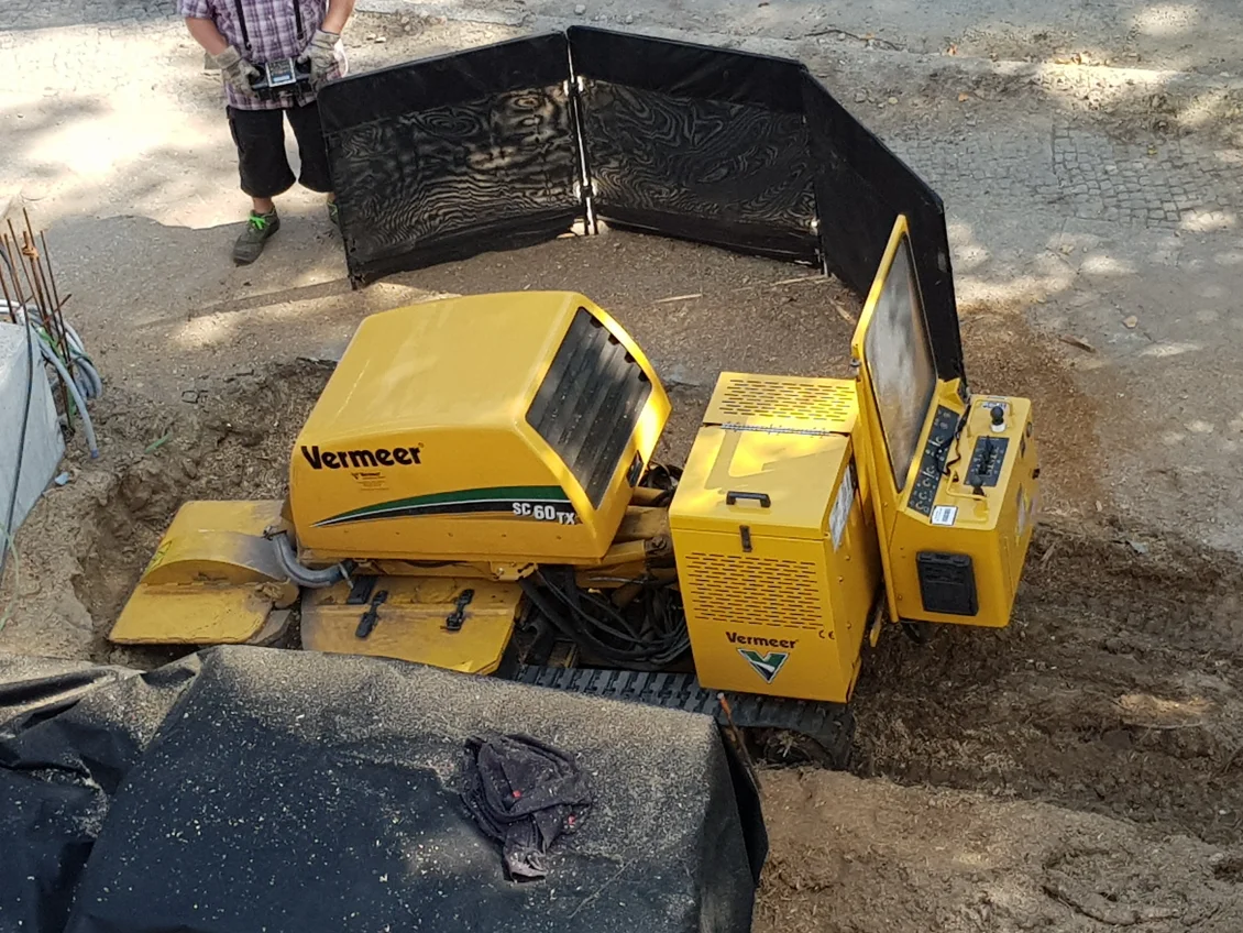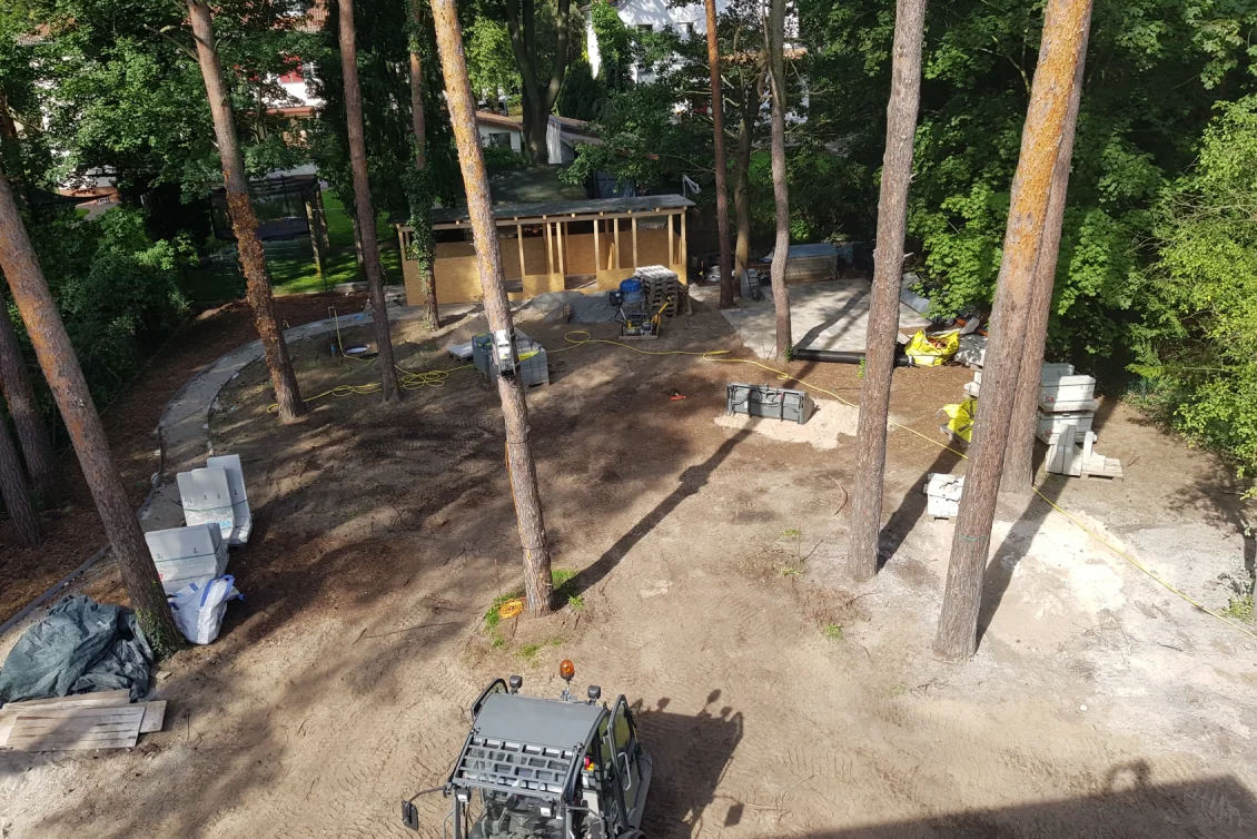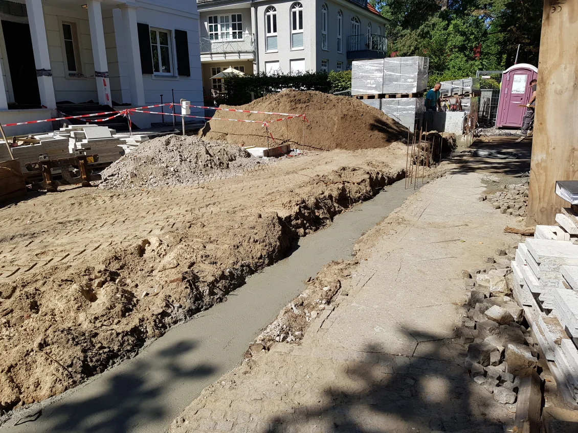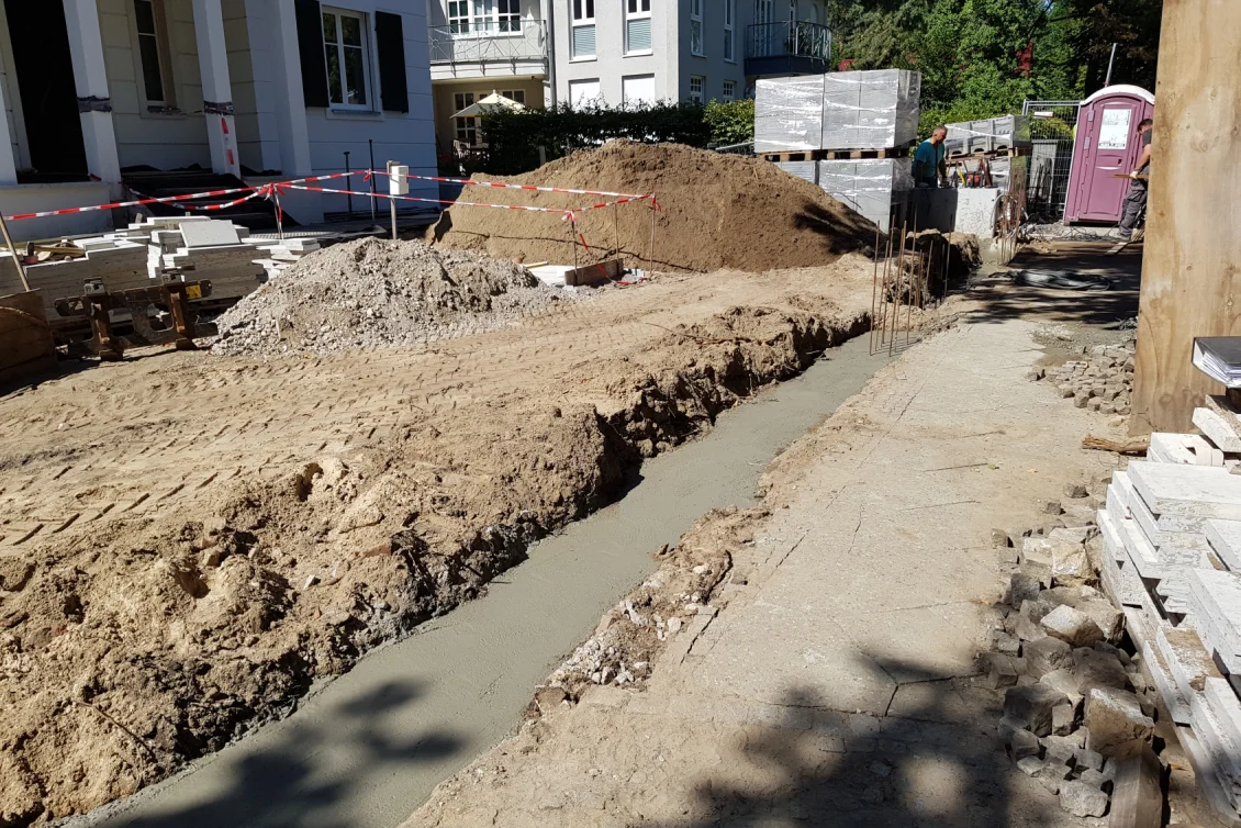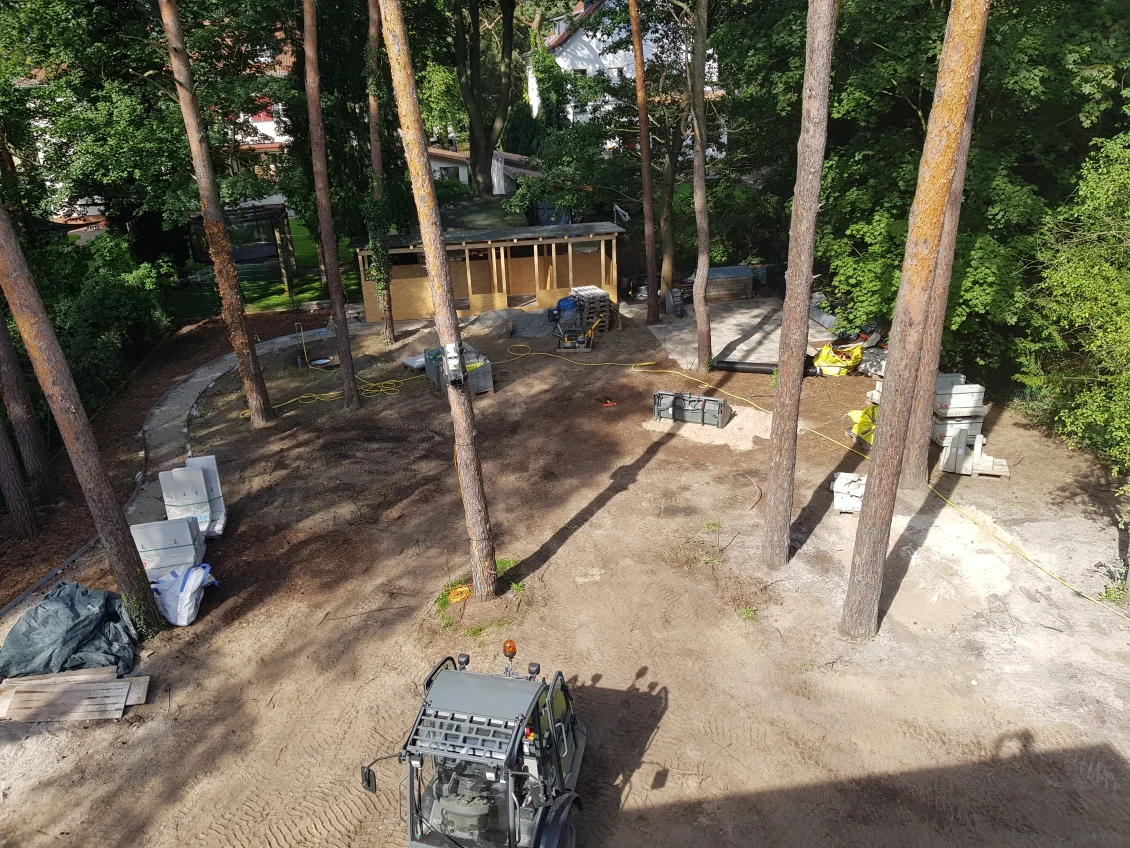 Zur Herstellung des Zaunfundaments musste noch ein Baumstubben weichen, die große Fräse gräbt sich tief in den Boden ein. In der Tiefgarage werden die ersten Bodenbeschichtungen aufgetragen. Sobald die Einbauten und Leuchten montiert sind, können die ersten Wohnungen bereits bezogen werden.