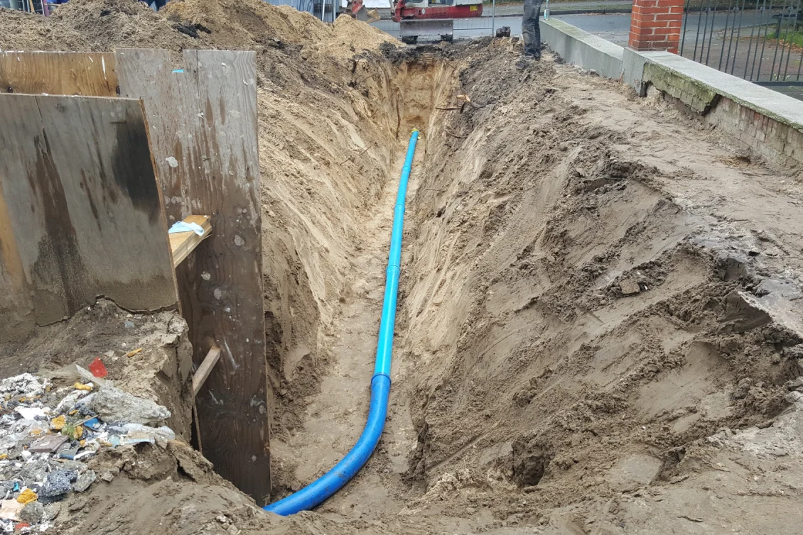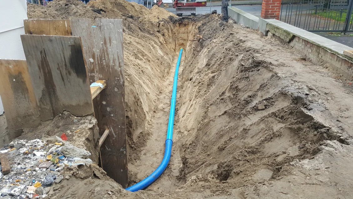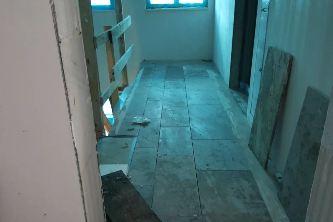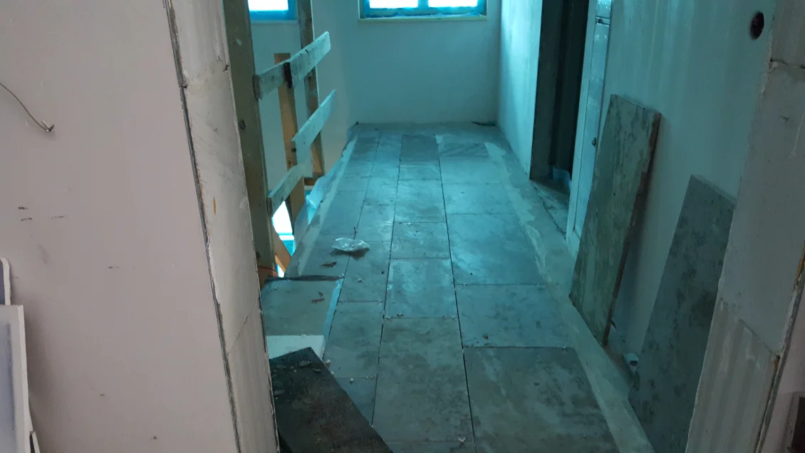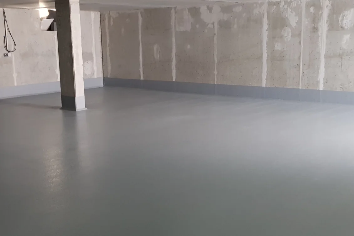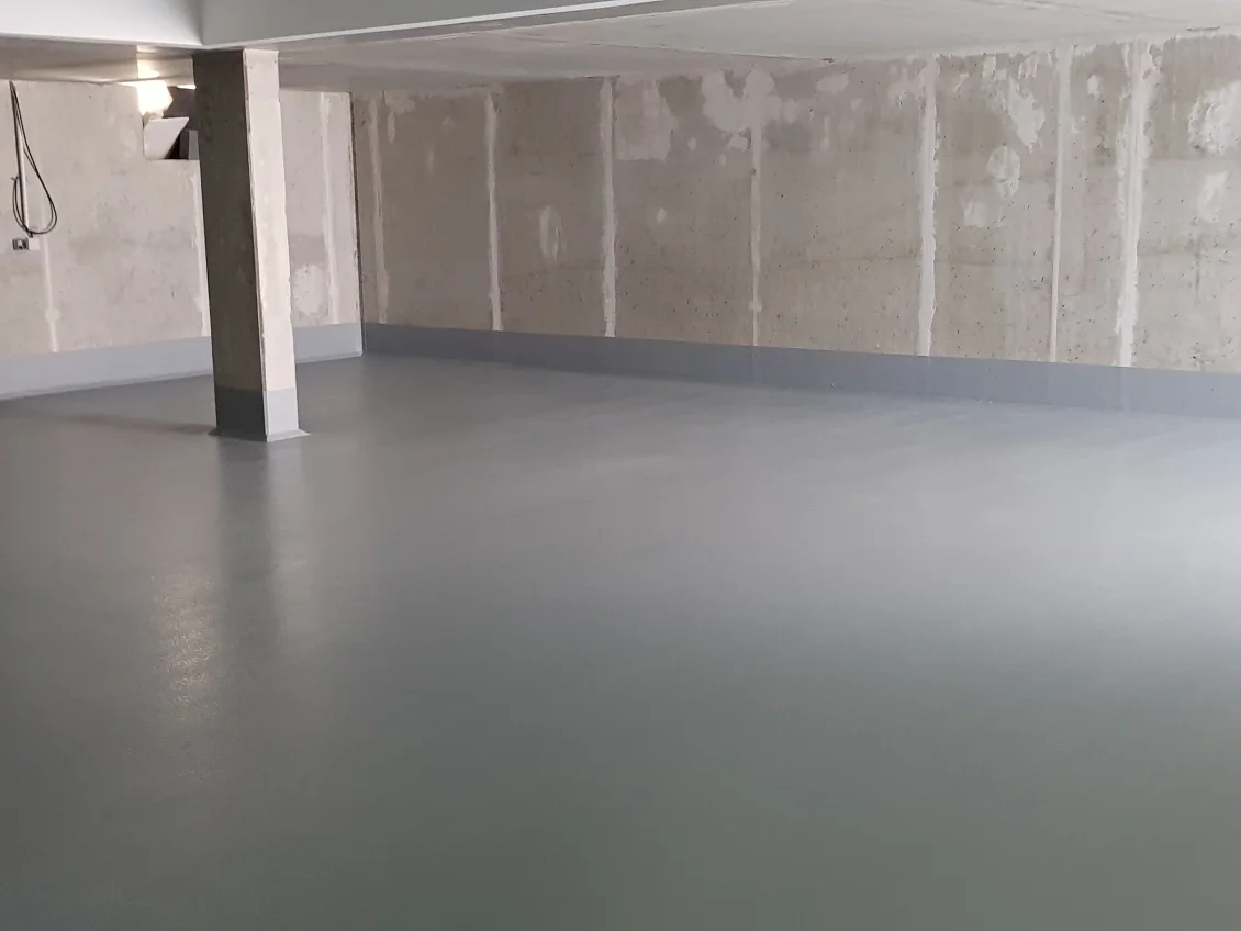 Zur Herstellung des Zaunfundaments musste noch ein Baumstubben weichen, die große Fräse gräbt sich tief in den Boden ein. In der Tiefgarage werden die ersten Bodenbeschichtungen aufgetragen. Sobald die Einbauten und Leuchten montiert sind, können die ersten Wohnungen bereits bezogen werden.