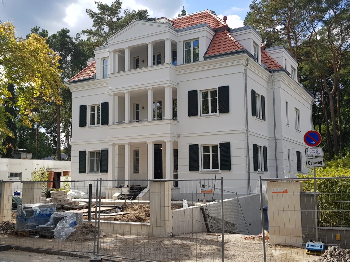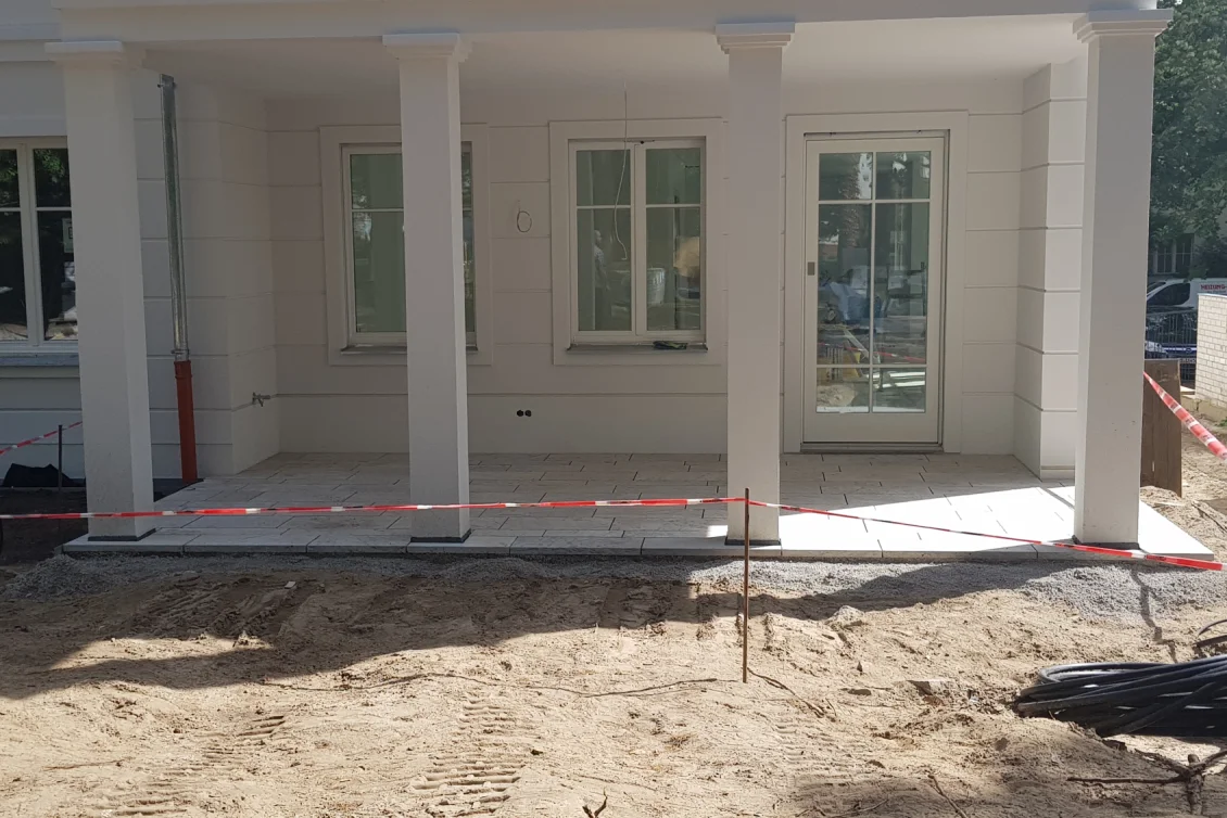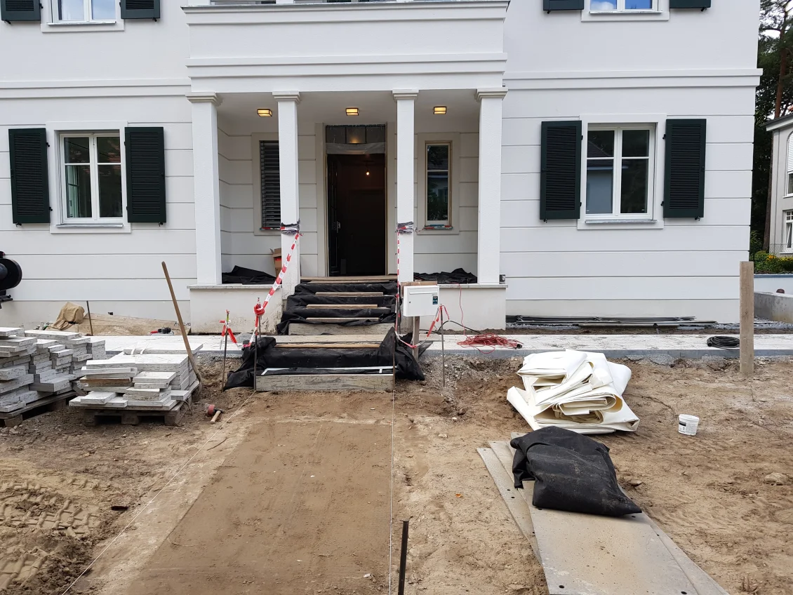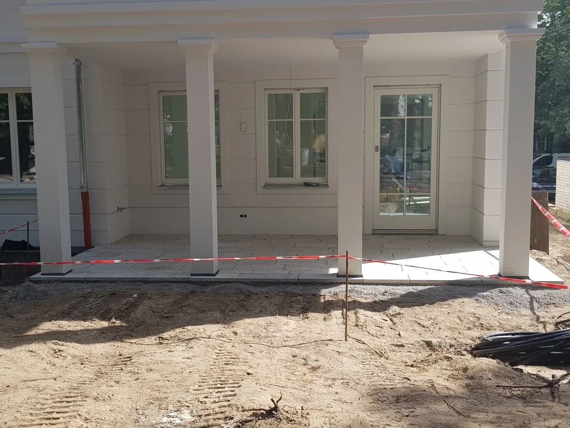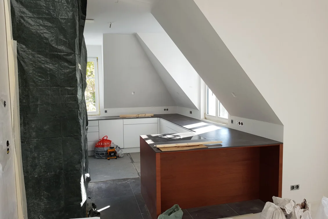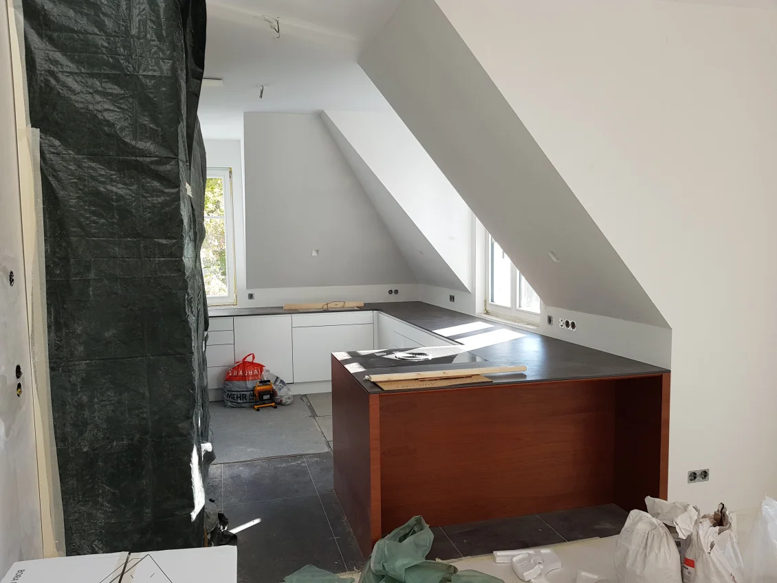 Unser parkähnlich angelegter Garten ist fertiggestellt und erstrahlt in sattem Grün. Auf der Eingangsseite sind die Zauneinfassungen armiert und mit Naturstein abgedeckt. Die Küche im Dachgeschoss steht. Jetzt werden noch individuelle Einbauten montiert, um die letzte Wohnung fertigzustellen.