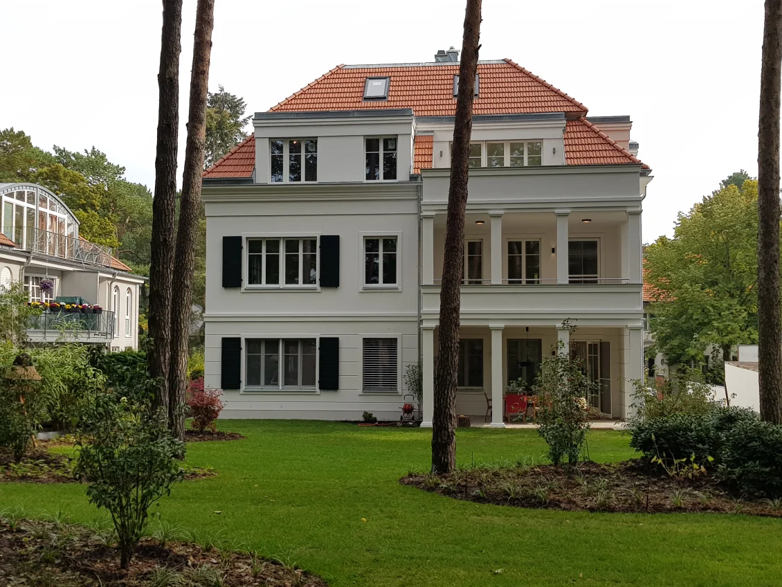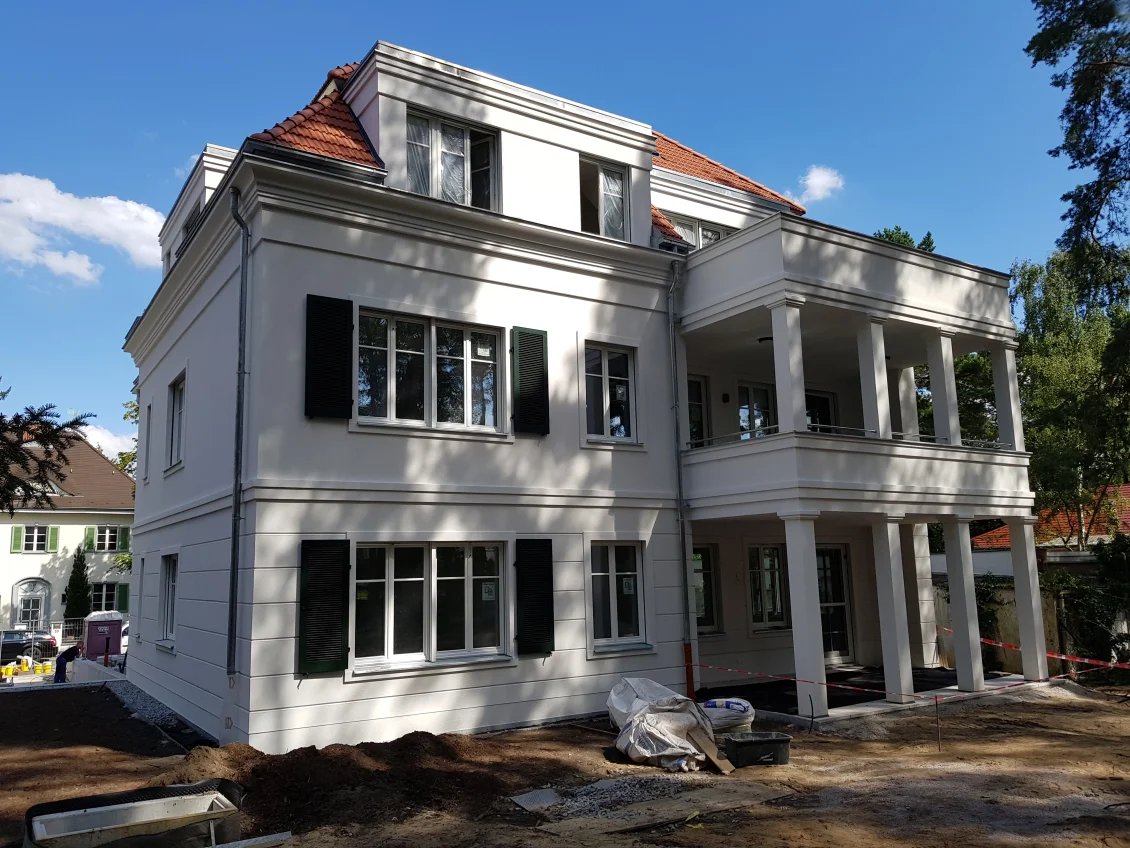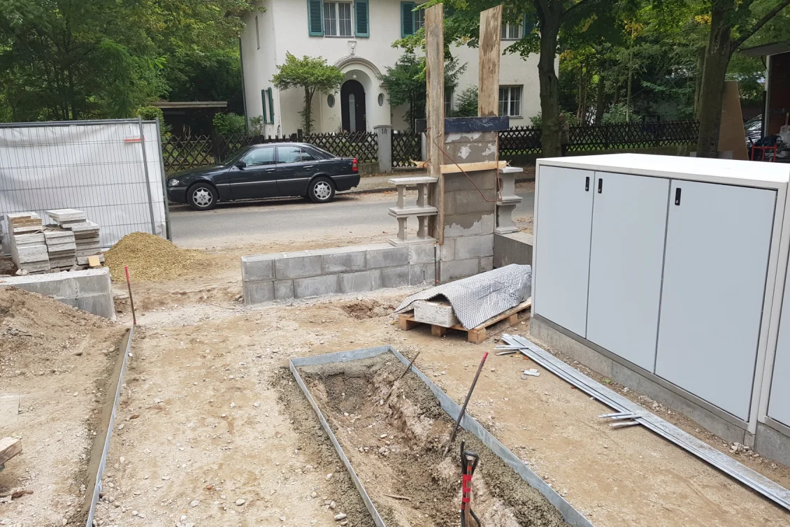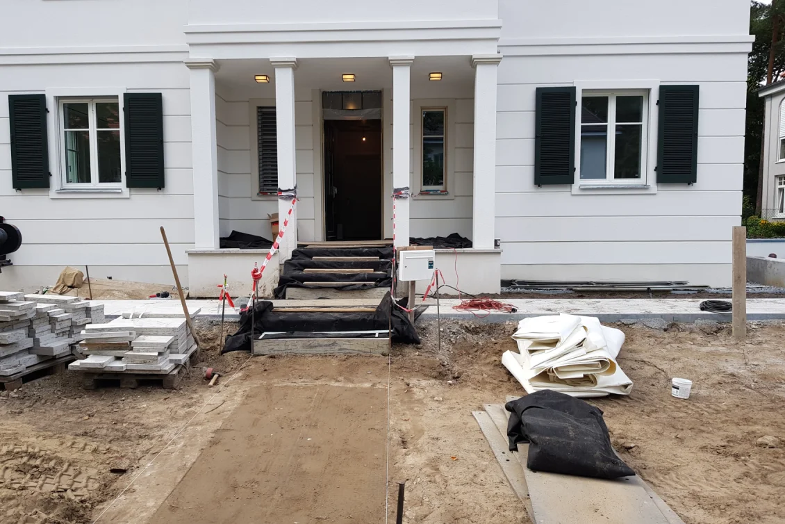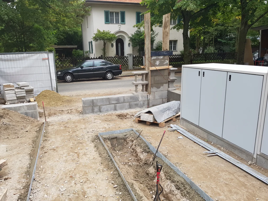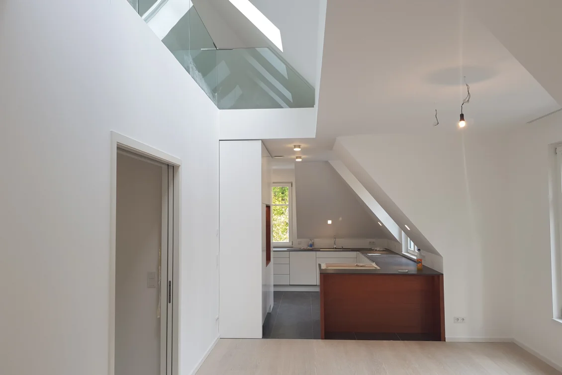 Unser parkähnlich angelegter Garten ist fertiggestellt und erstrahlt in sattem Grün. Auf der Eingangsseite sind die Zauneinfassungen armiert und mit Naturstein abgedeckt. Die Küche im Dachgeschoss steht. Jetzt werden noch individuelle Einbauten montiert, um die letzte Wohnung fertigzustellen.