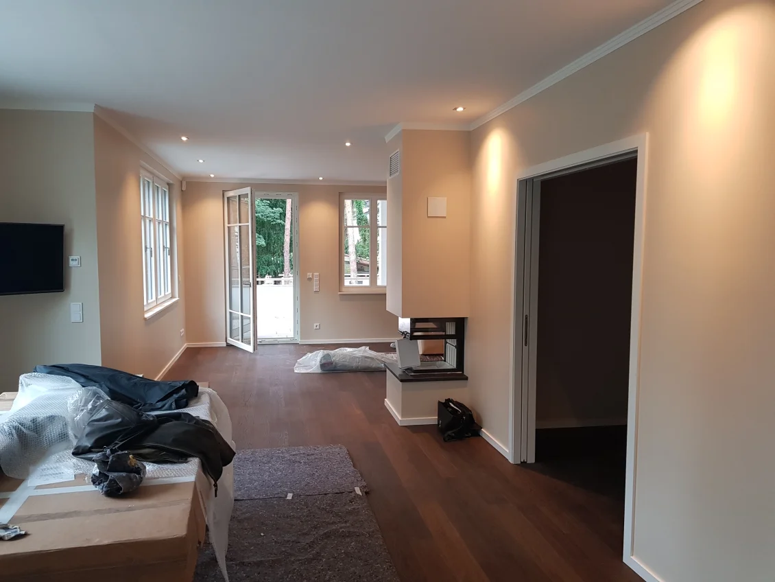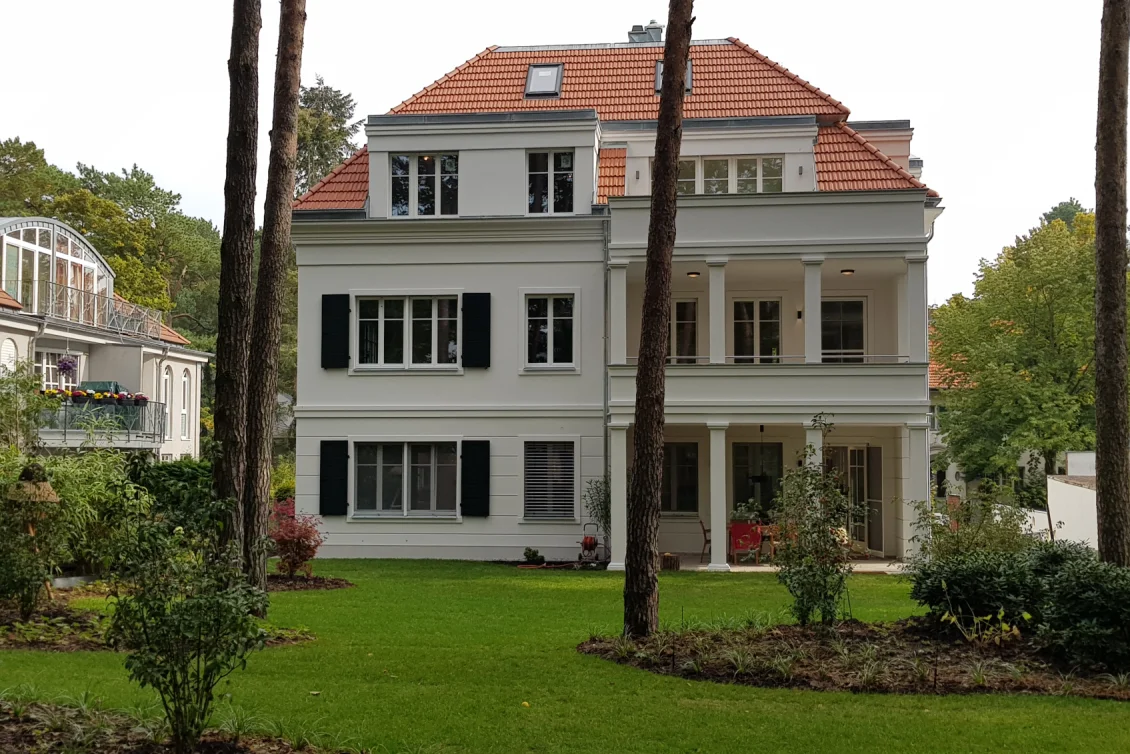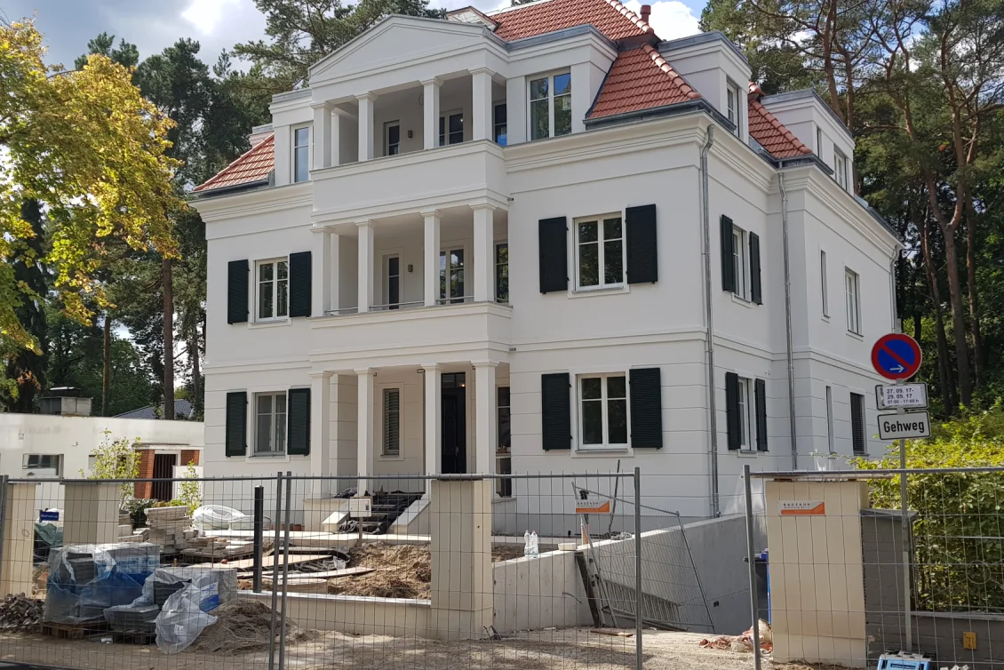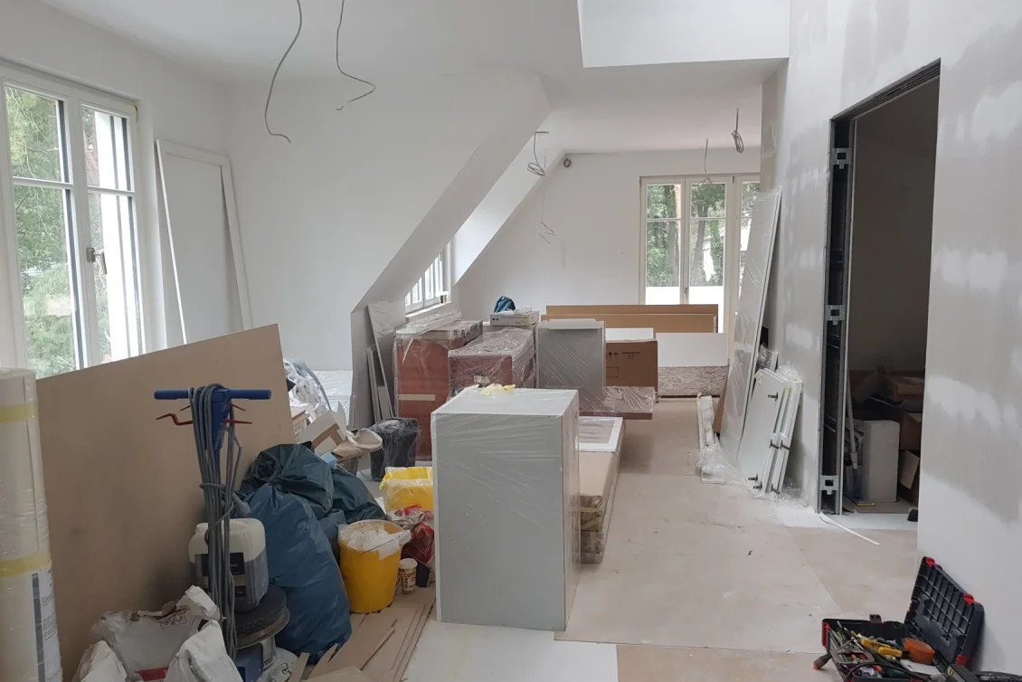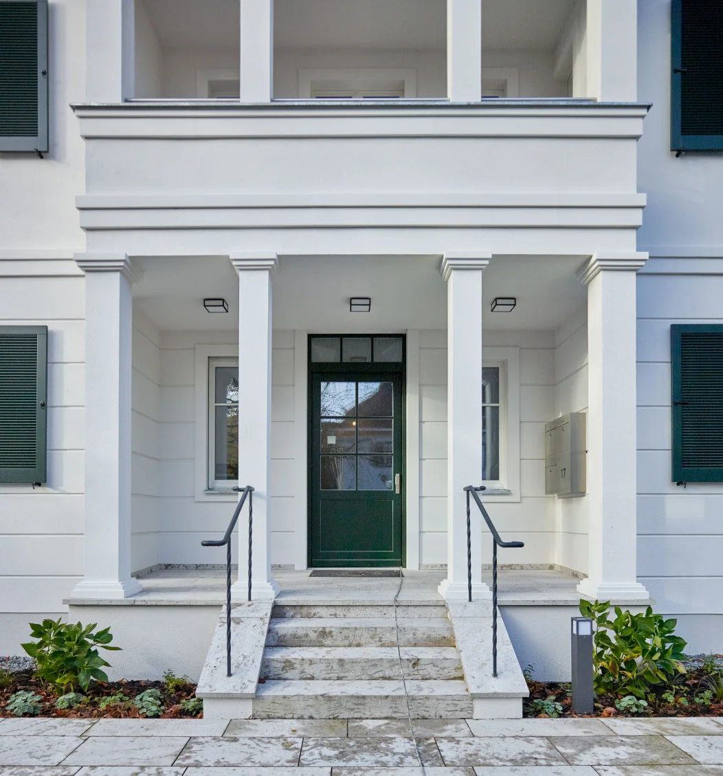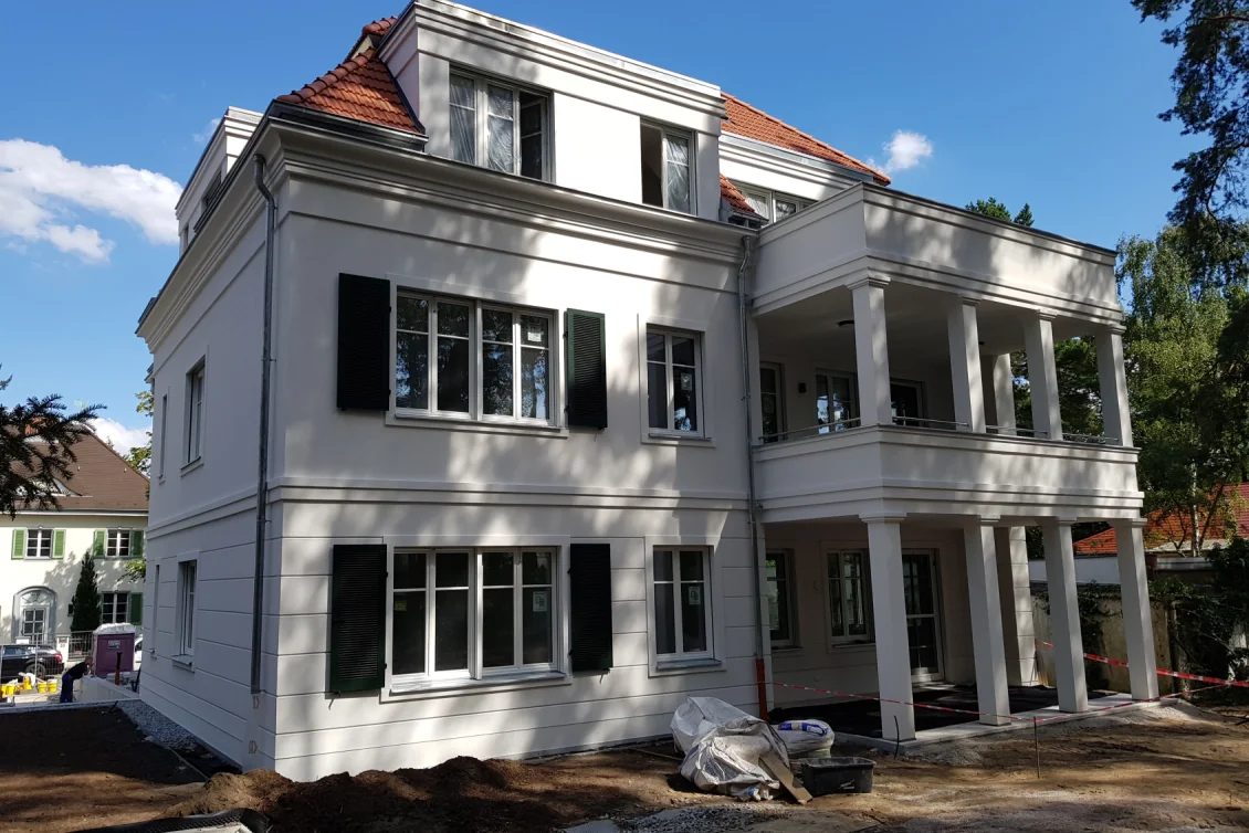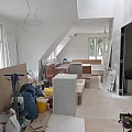 Unser parkähnlich angelegter Garten ist fertiggestellt und erstrahlt in sattem Grün. Auf der Eingangsseite sind die Zauneinfassungen armiert und mit Naturstein abgedeckt. Die Küche im Dachgeschoss steht. Jetzt werden noch individuelle Einbauten montiert, um die letzte Wohnung fertigzustellen.