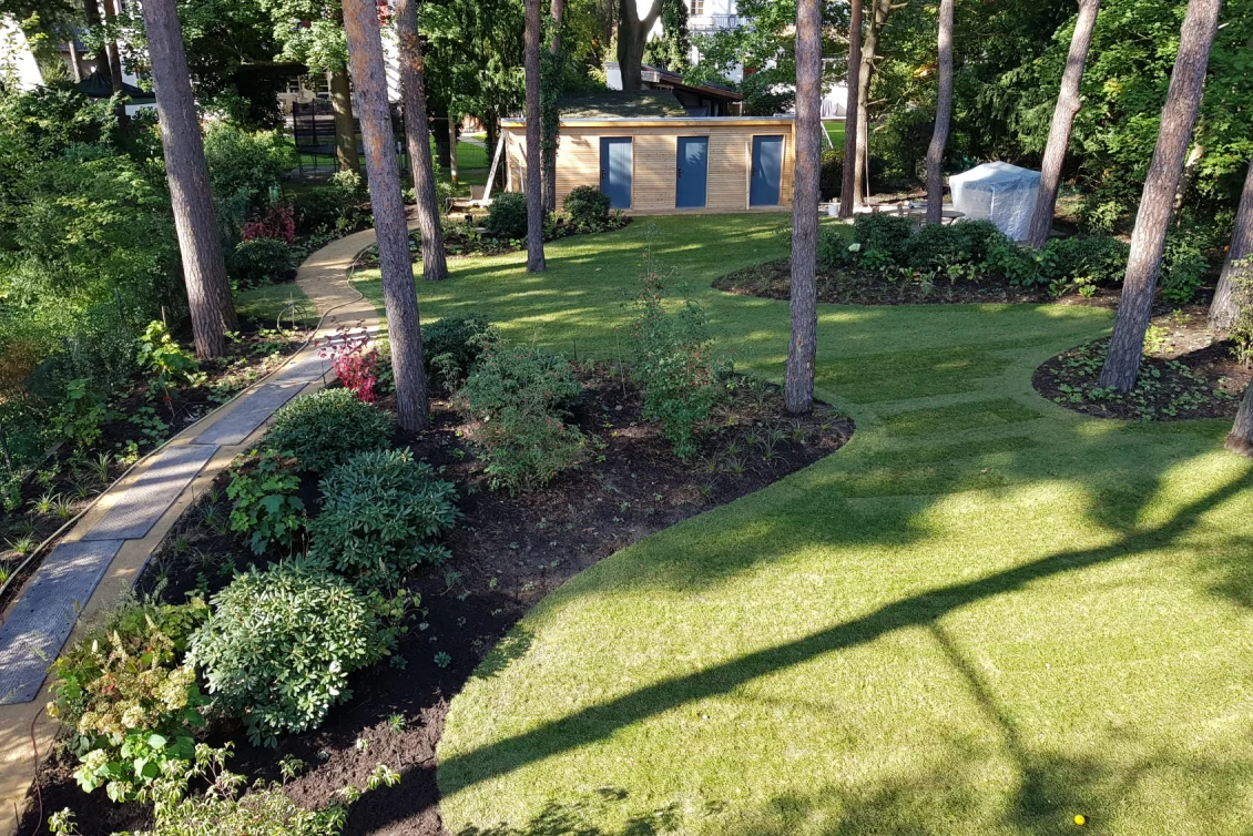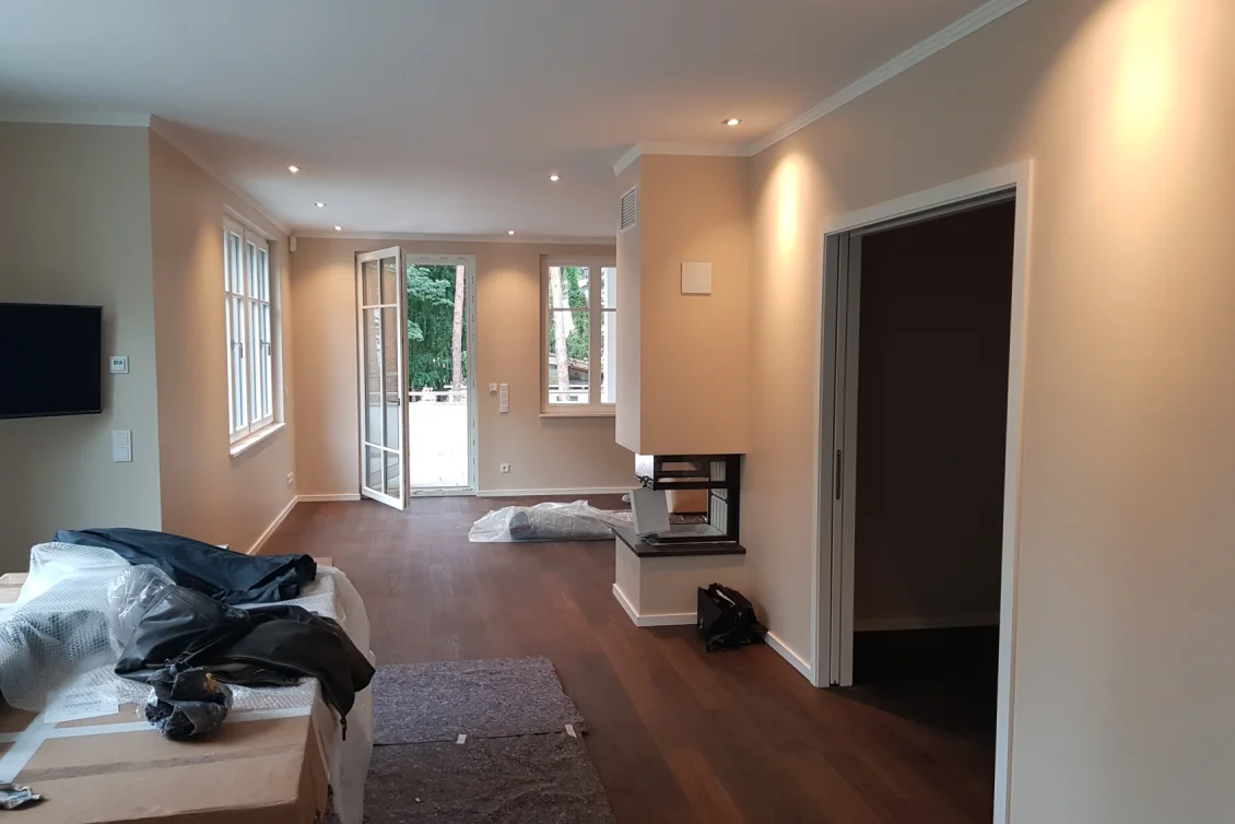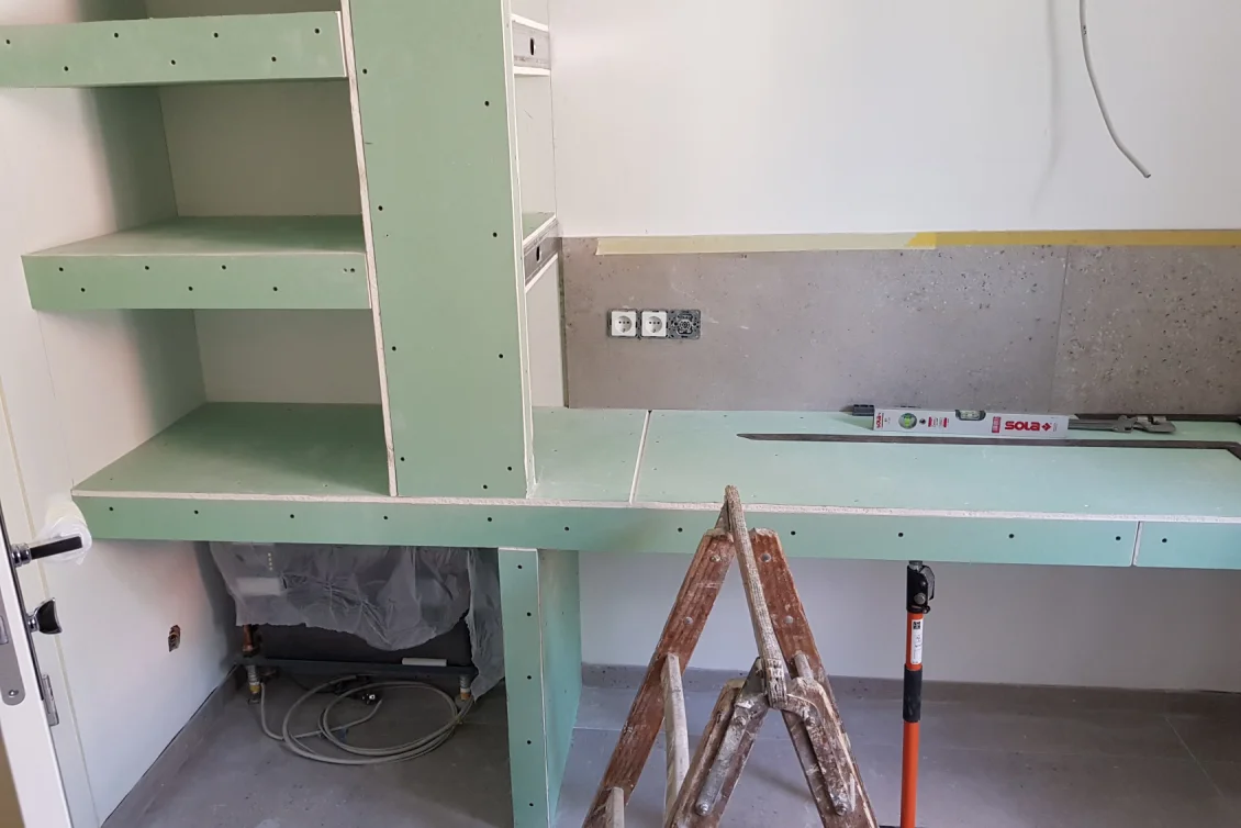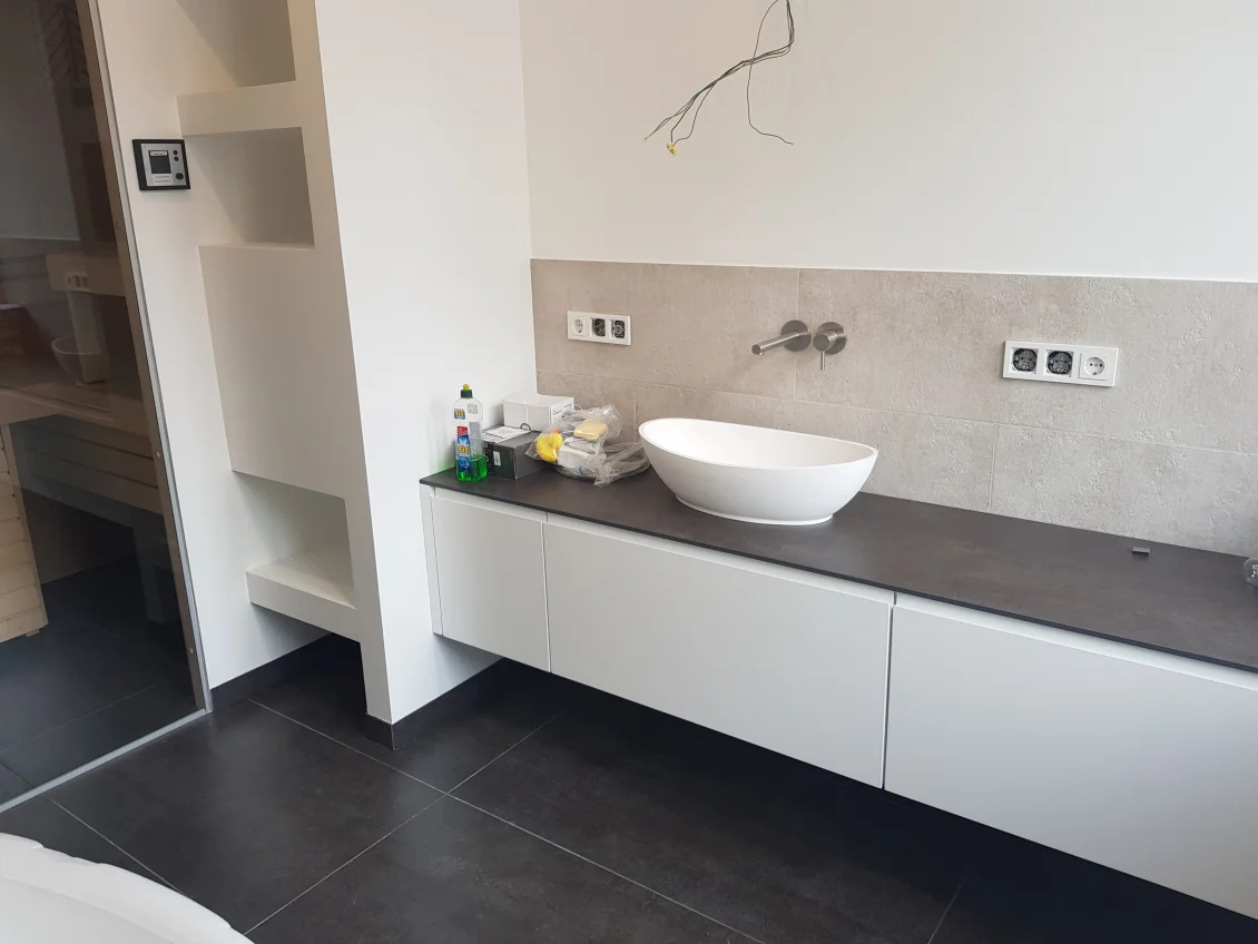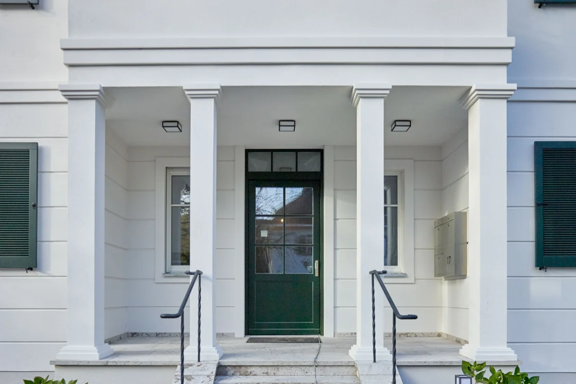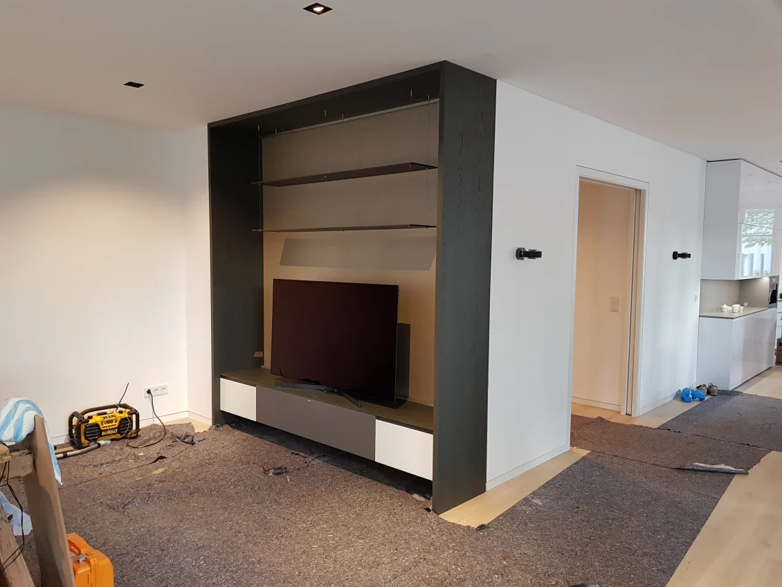 Unser parkähnlich angelegter Garten ist fertiggestellt und erstrahlt in sattem Grün. Auf der Eingangsseite sind die Zauneinfassungen armiert und mit Naturstein abgedeckt. Die Küche im Dachgeschoss steht. Jetzt werden noch individuelle Einbauten montiert, um die letzte Wohnung fertigzustellen.