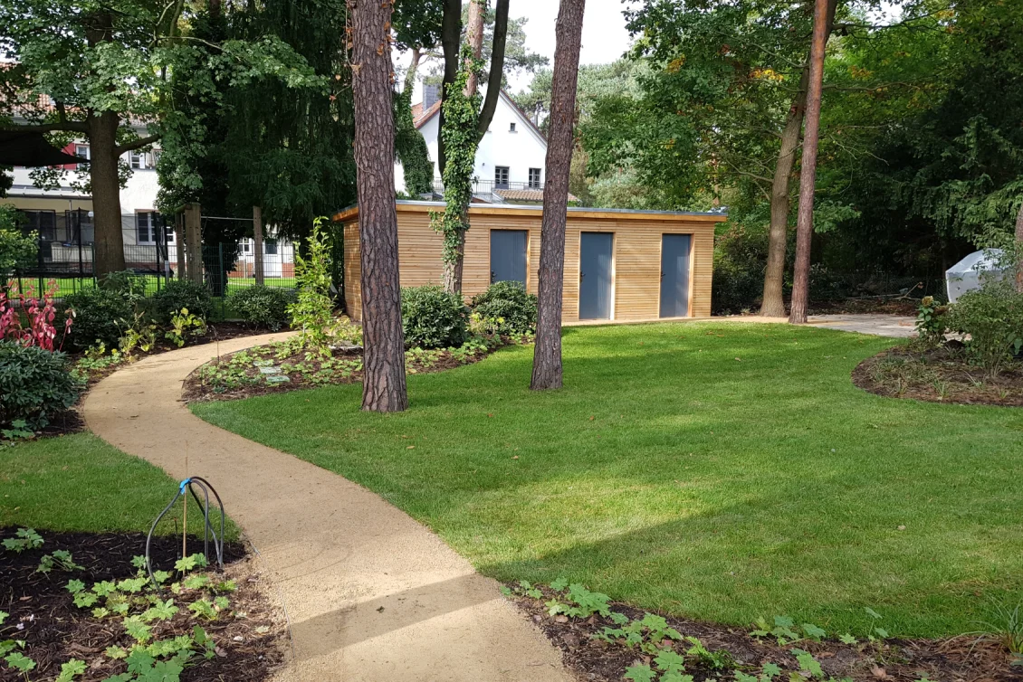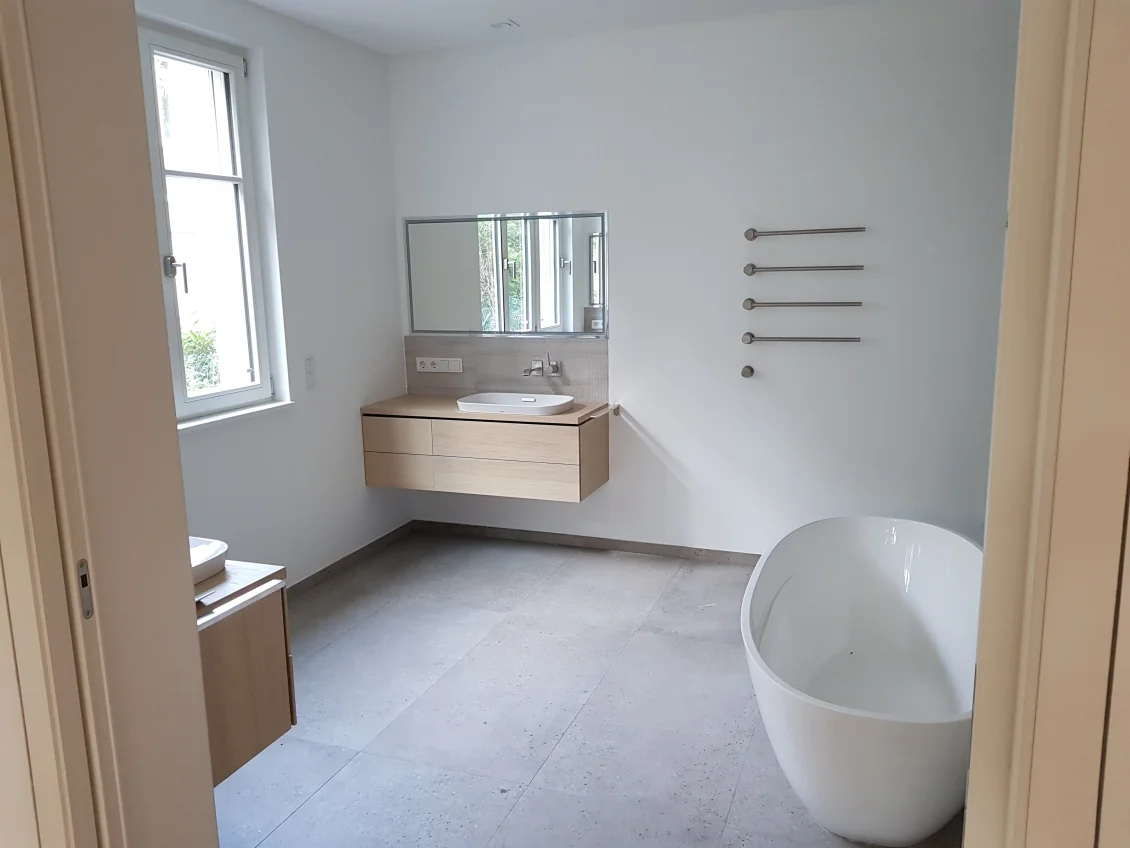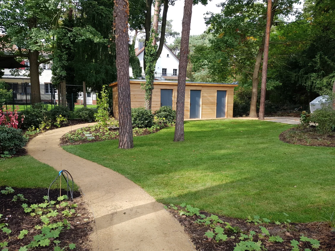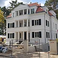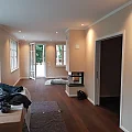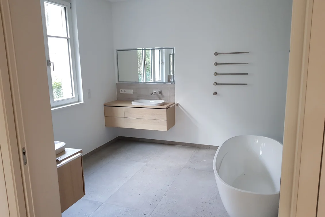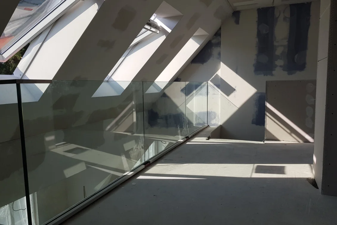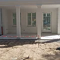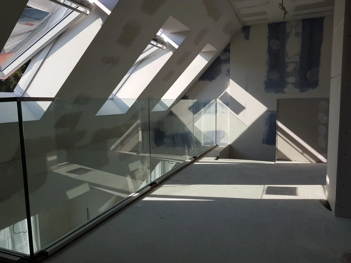 Unser parkähnlich angelegter Garten ist fertiggestellt und erstrahlt in sattem Grün. Auf der Eingangsseite sind die Zauneinfassungen armiert und mit Naturstein abgedeckt. Die Küche im Dachgeschoss steht. Jetzt werden noch individuelle Einbauten montiert, um die letzte Wohnung fertigzustellen.