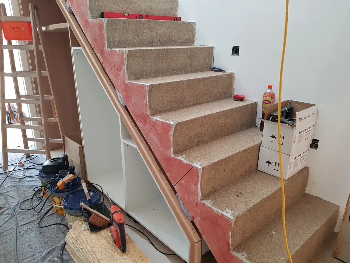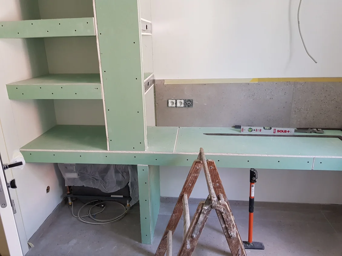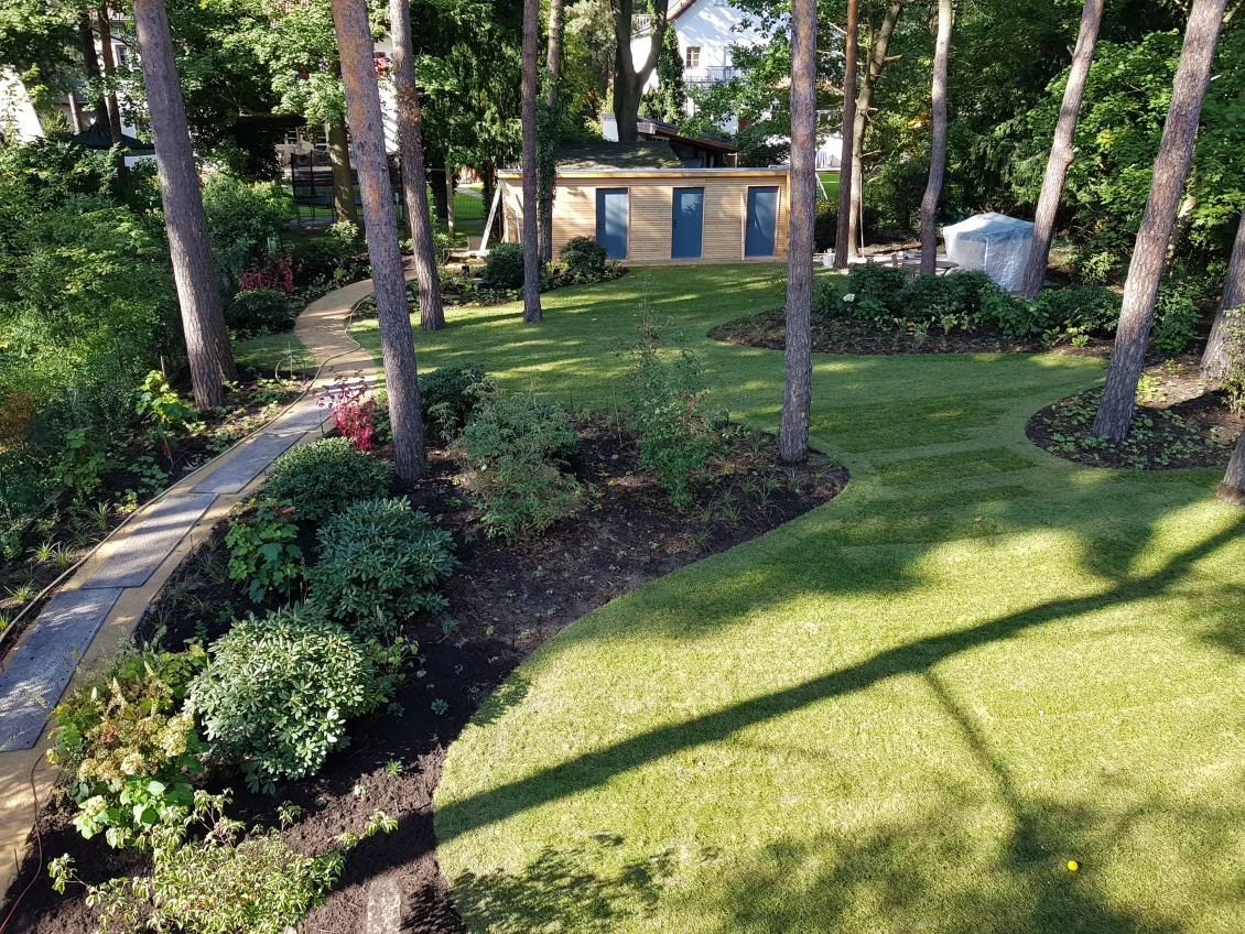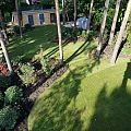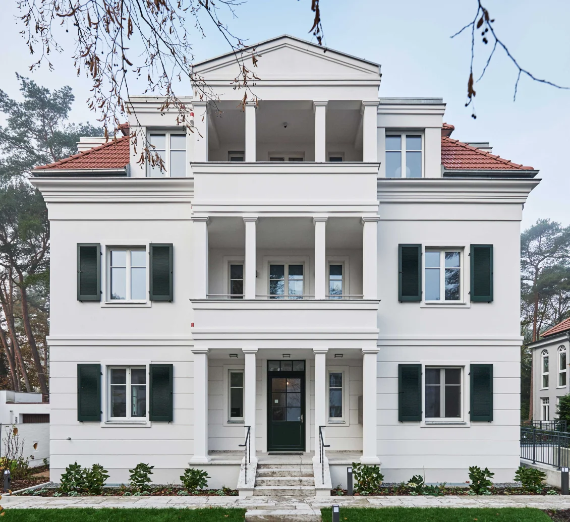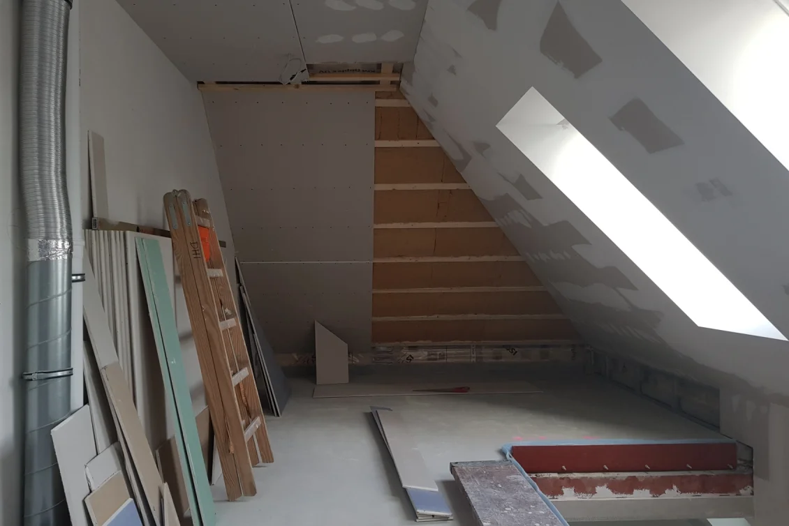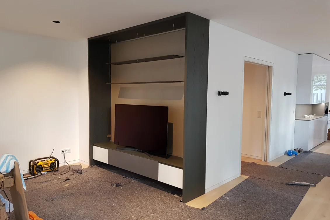 Unser parkähnlich angelegter Garten ist fertiggestellt und erstrahlt in sattem Grün. Auf der Eingangsseite sind die Zauneinfassungen armiert und mit Naturstein abgedeckt. Die Küche im Dachgeschoss steht. Jetzt werden noch individuelle Einbauten montiert, um die letzte Wohnung fertigzustellen.