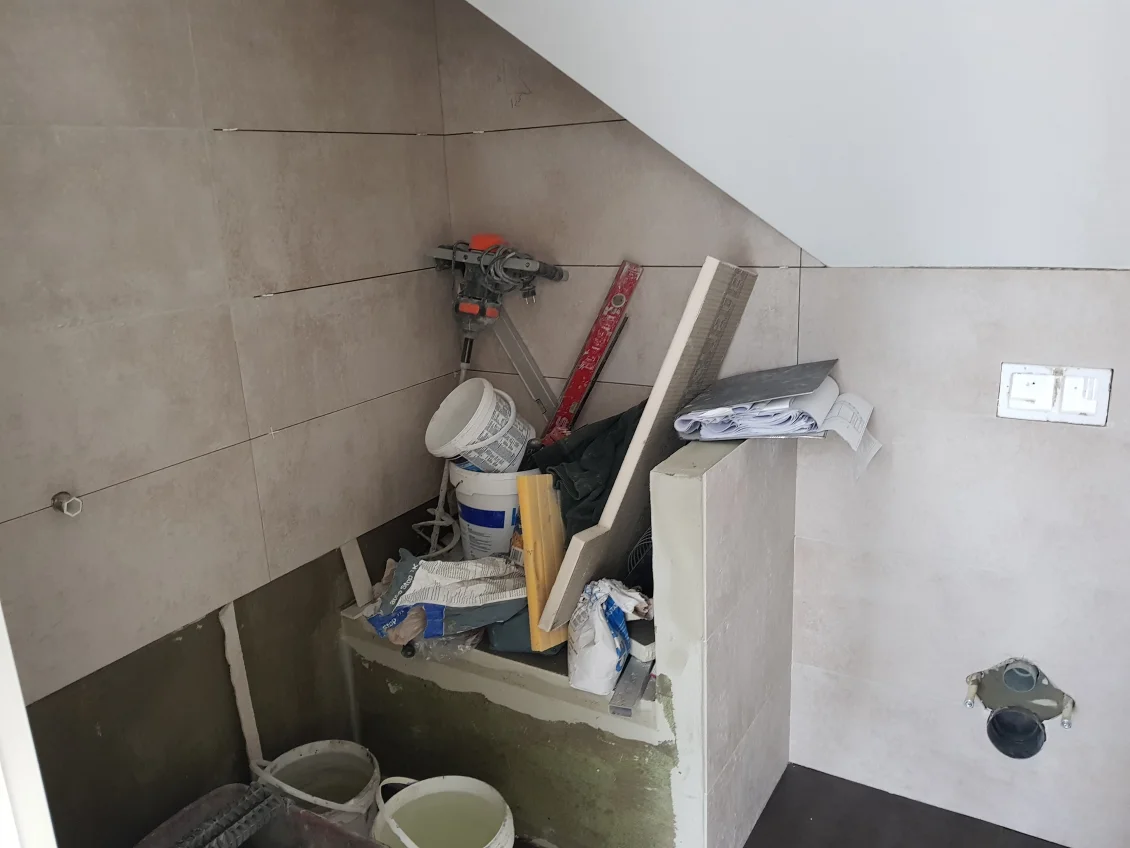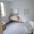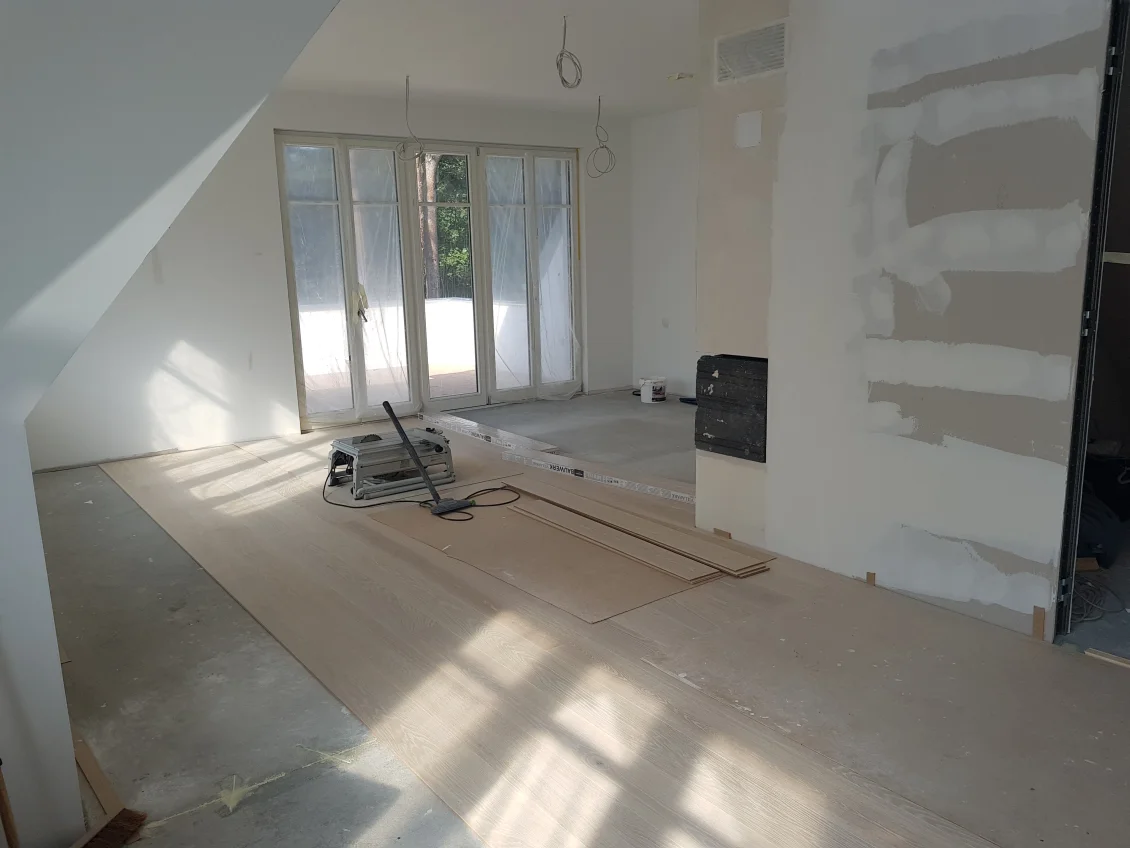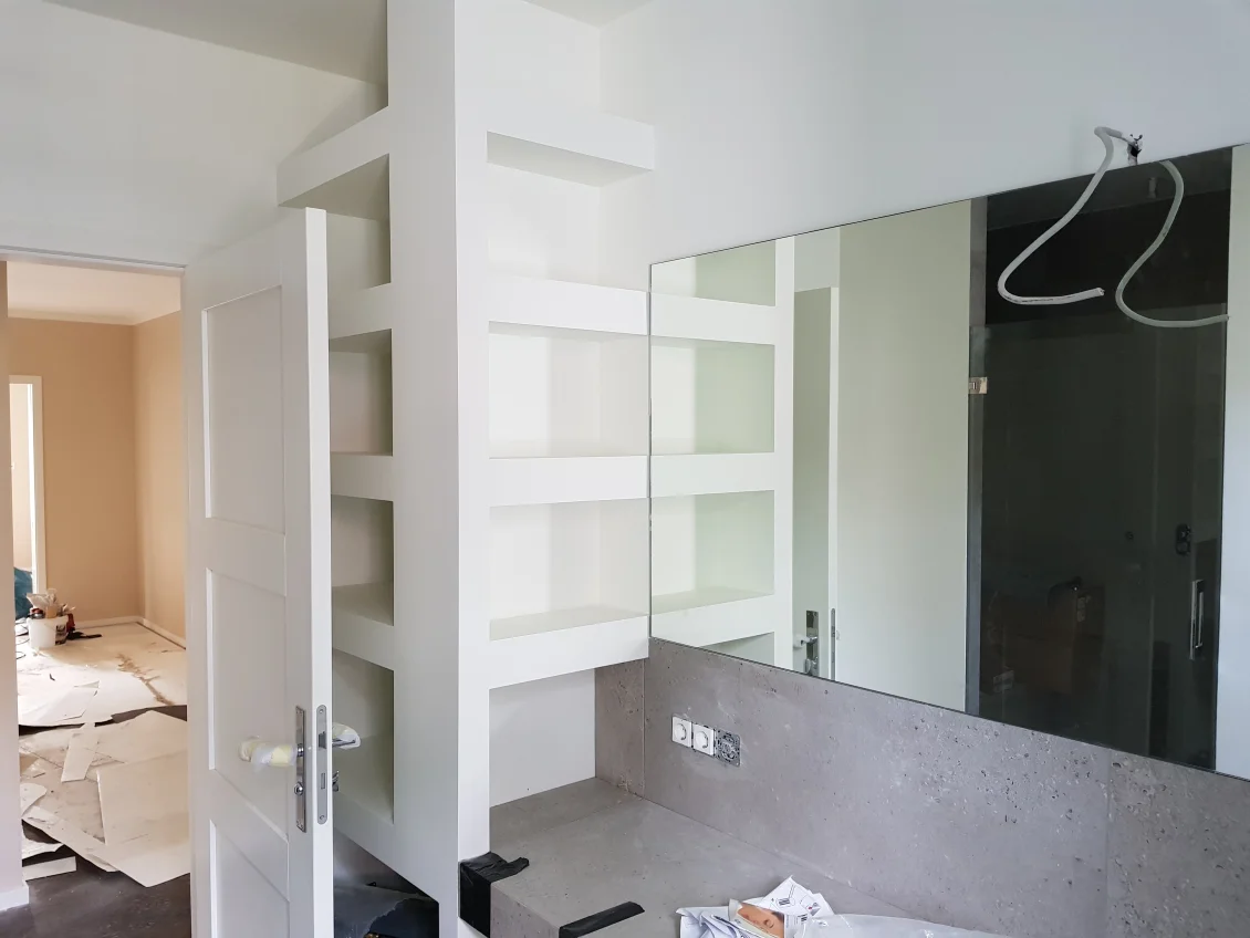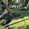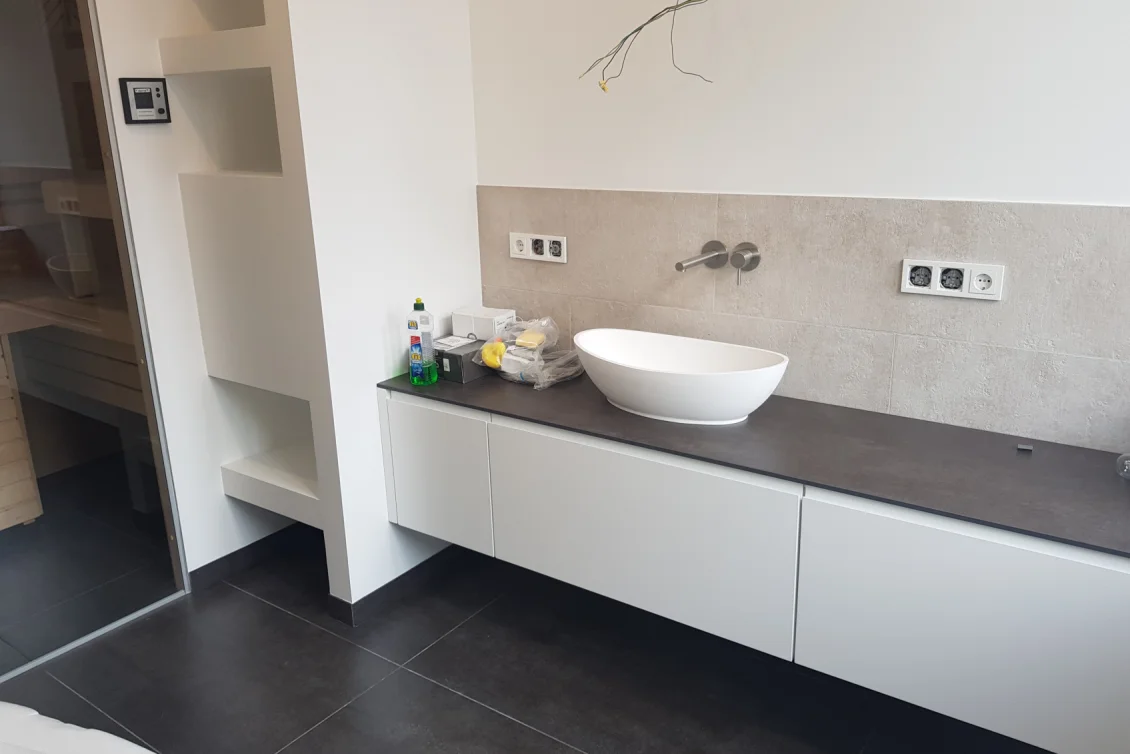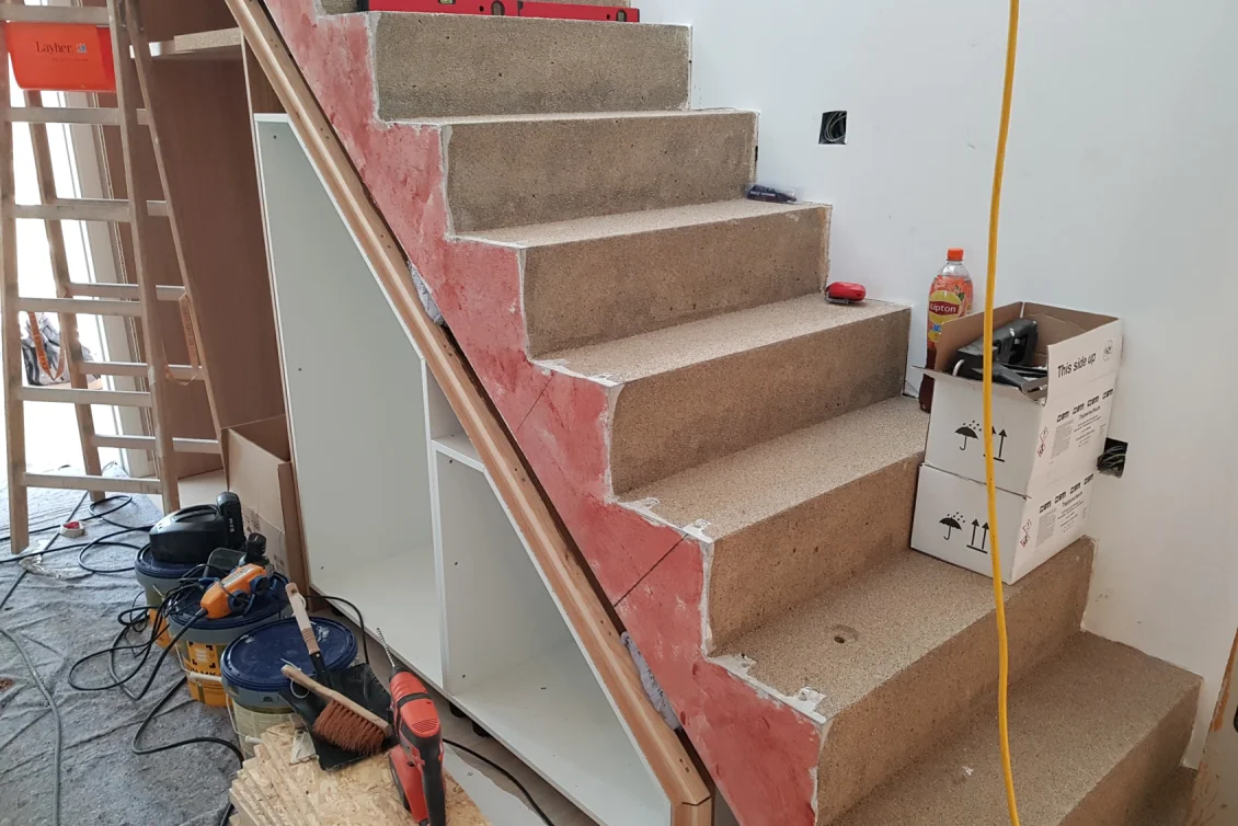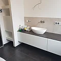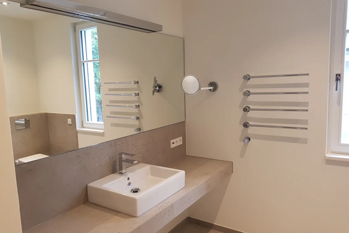 Unser parkähnlich angelegter Garten ist fertiggestellt und erstrahlt in sattem Grün. Auf der Eingangsseite sind die Zauneinfassungen armiert und mit Naturstein abgedeckt. Die Küche im Dachgeschoss steht. Jetzt werden noch individuelle Einbauten montiert, um die letzte Wohnung fertigzustellen.