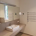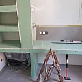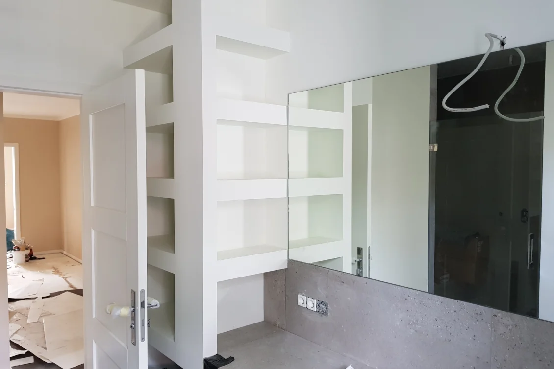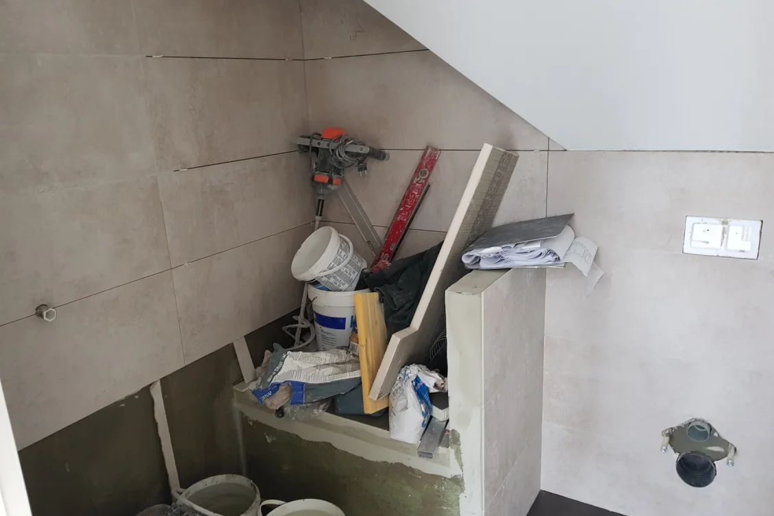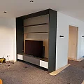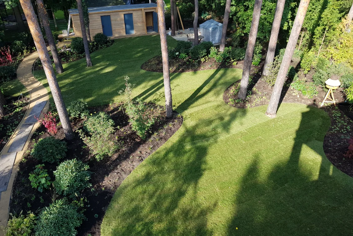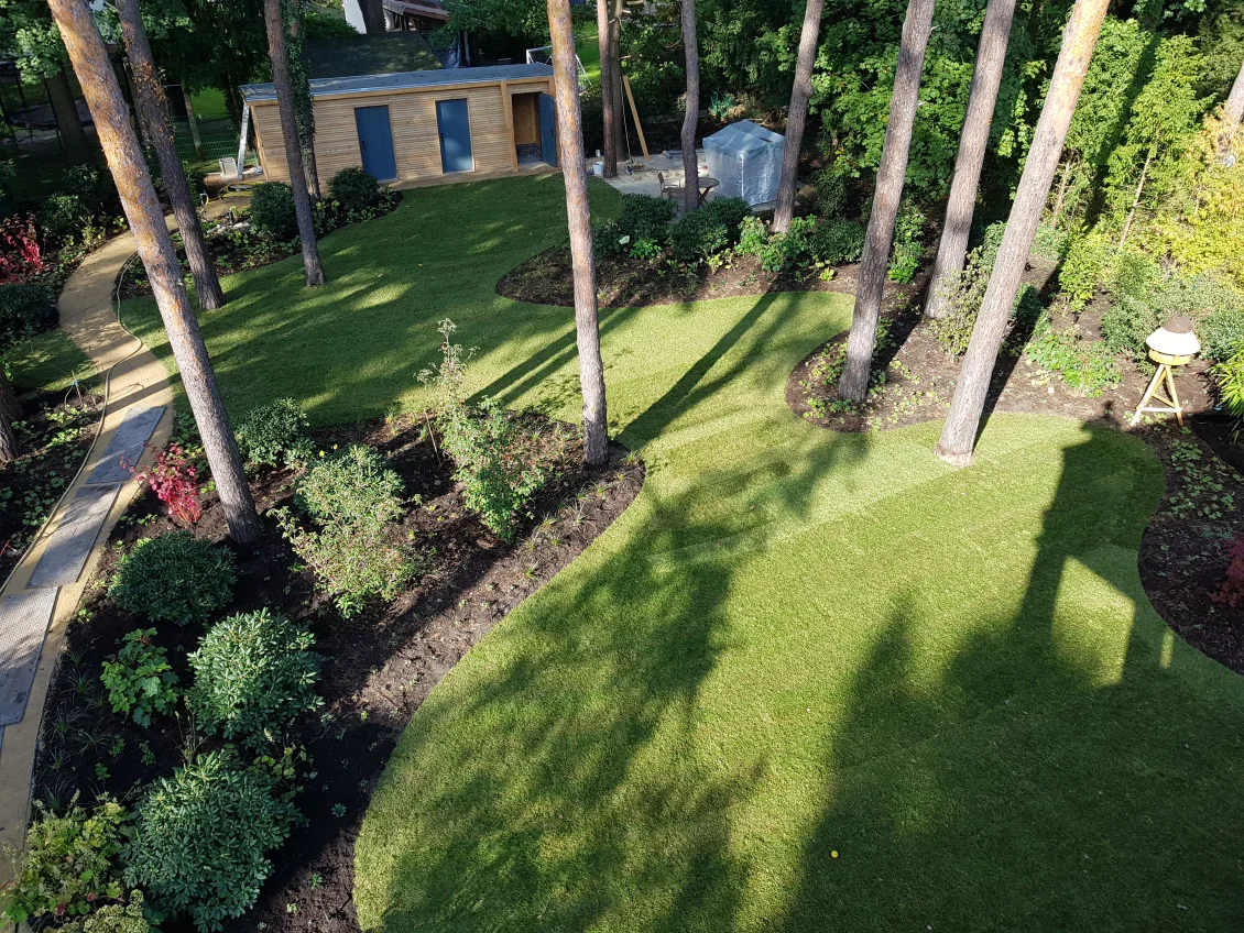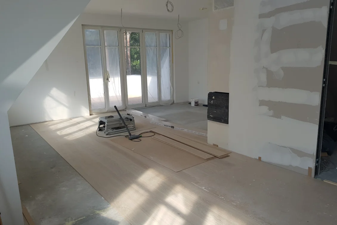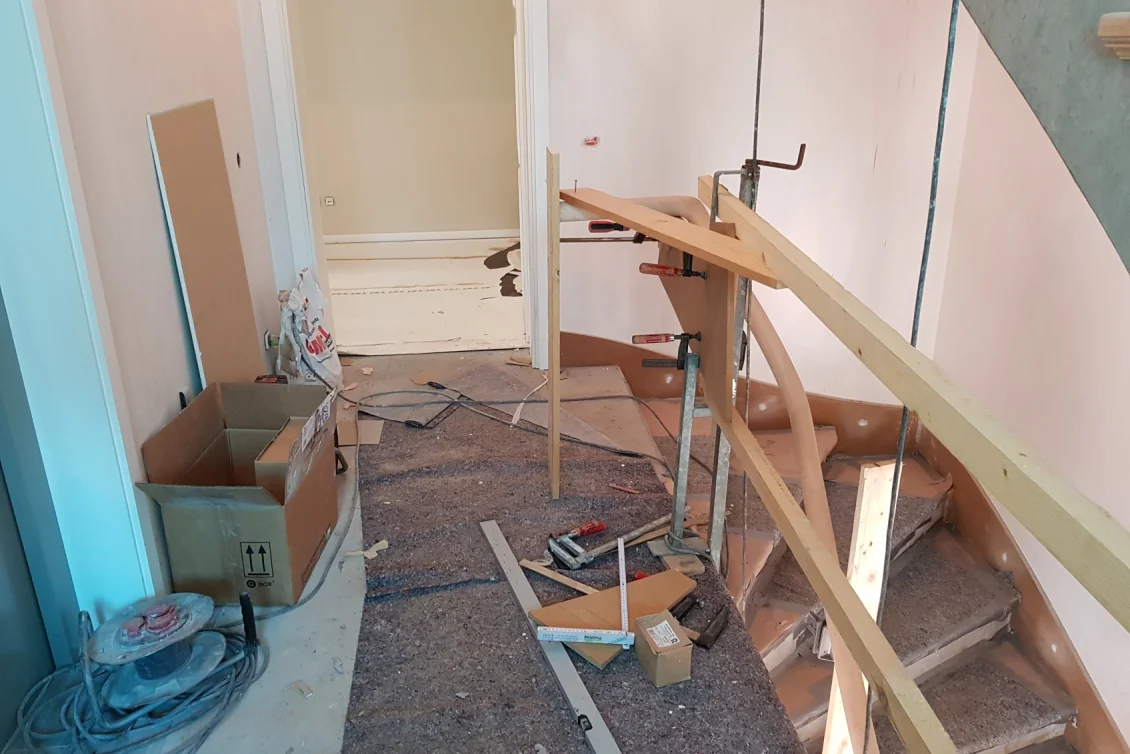 Unser parkähnlich angelegter Garten ist fertiggestellt und erstrahlt in sattem Grün. Auf der Eingangsseite sind die Zauneinfassungen armiert und mit Naturstein abgedeckt. Die Küche im Dachgeschoss steht. Jetzt werden noch individuelle Einbauten montiert, um die letzte Wohnung fertigzustellen.