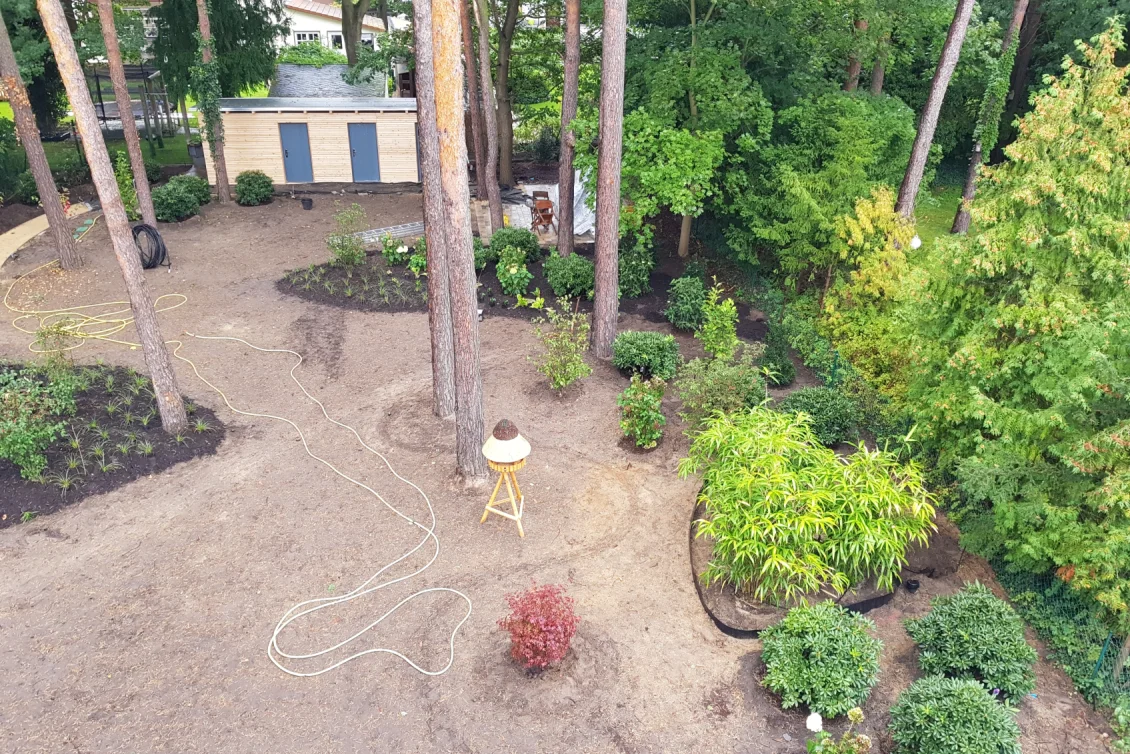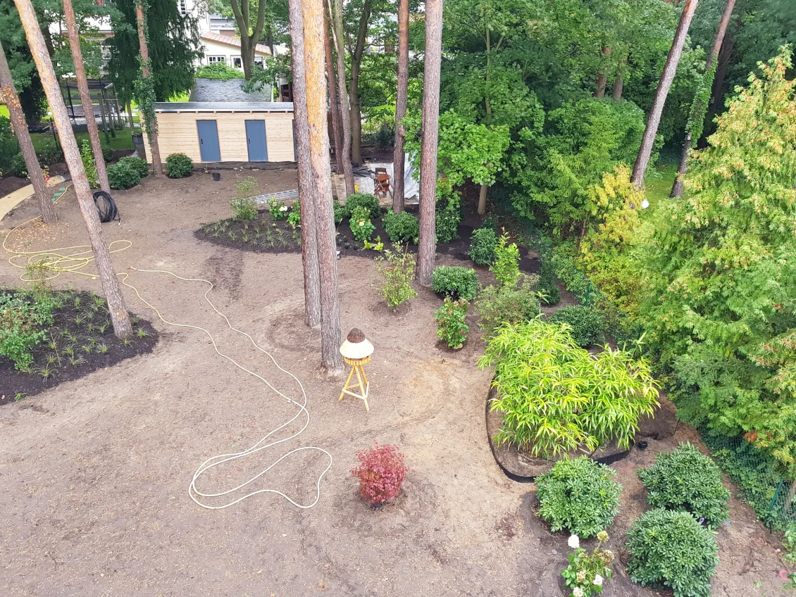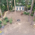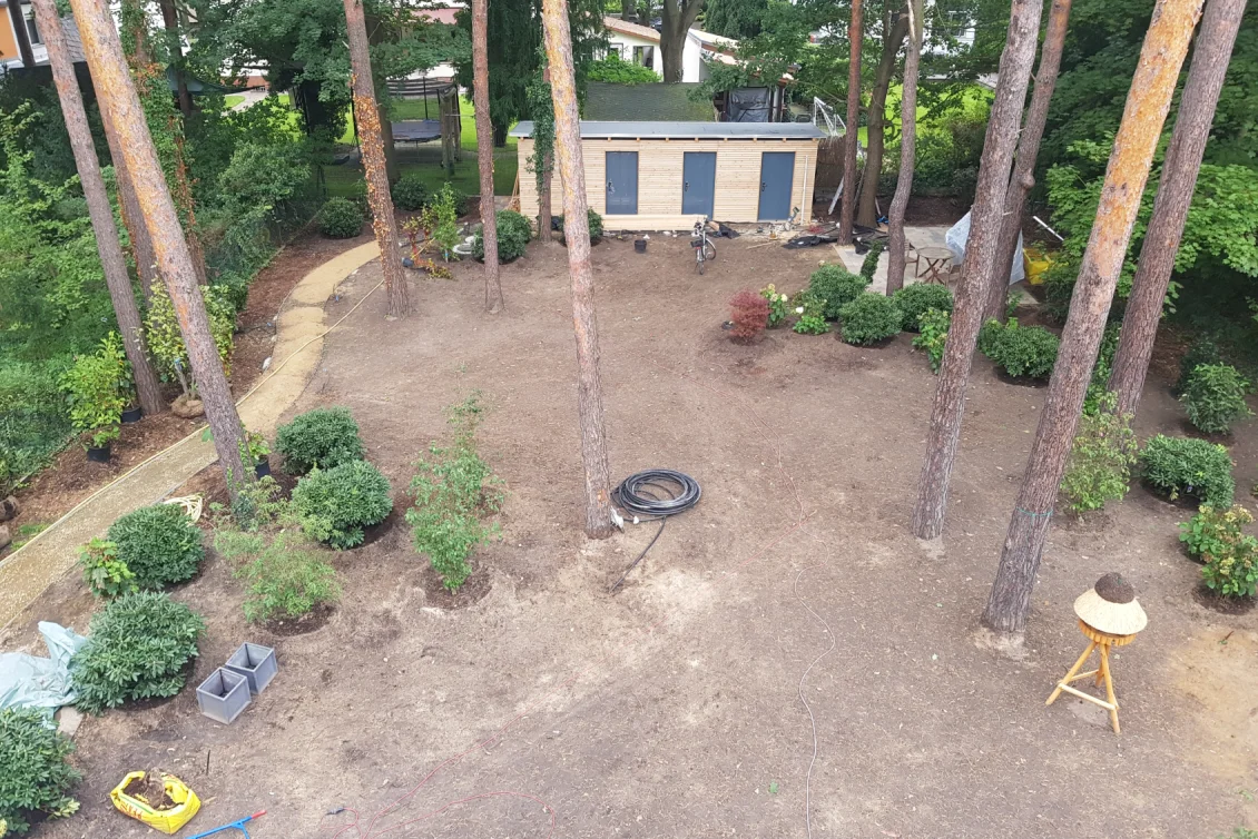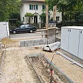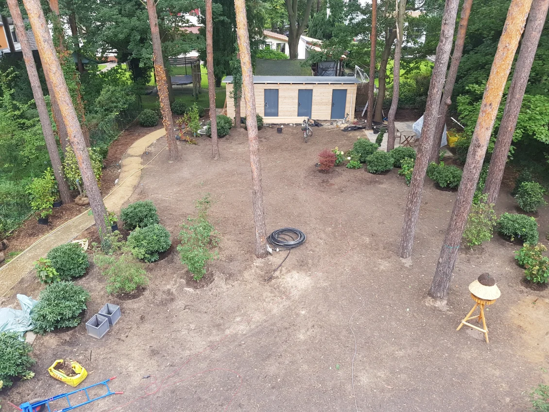 Im Garten wird weiter fleißig gepflanzt. Im Vorgarten sind Sockel und Pfeiler für die Zaunanlage gestellt sowie Wege- und Beeteinfassungen gesetzt. Im Dachgeschoss wird es eng, Küchenbauer, Parkett- und Fliesenleger, Maler, Tischler, Elektro- und Sanitärinstalltion arbeiten Seite an Seite.