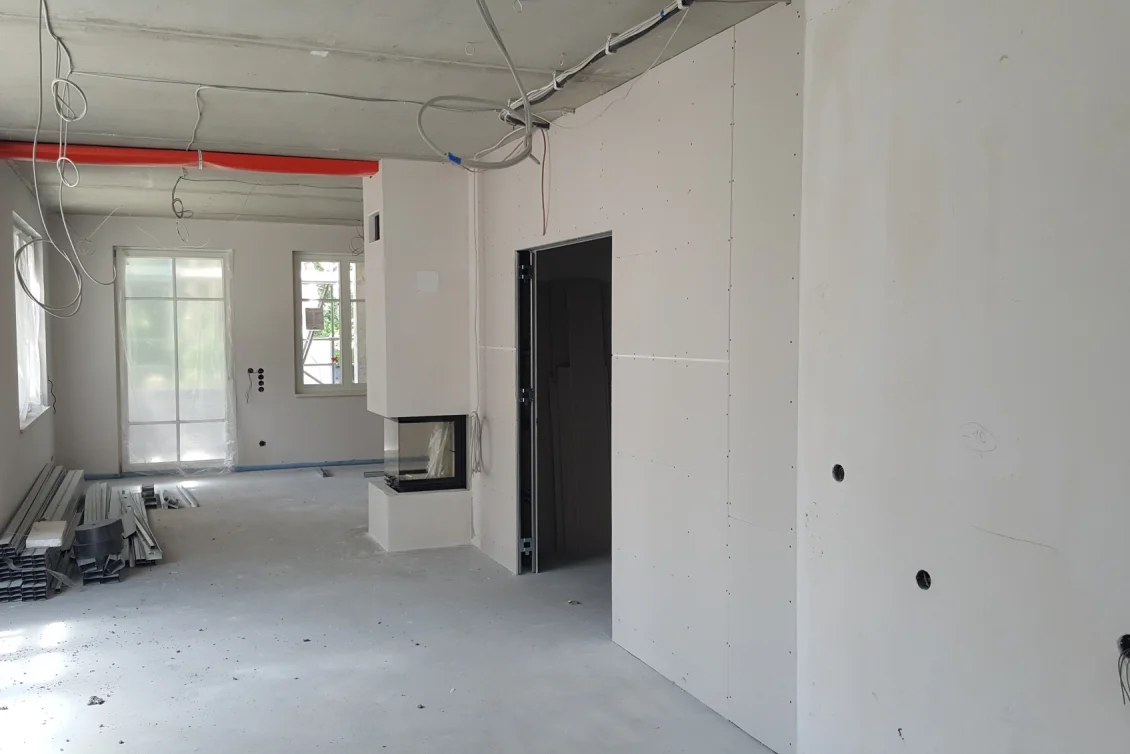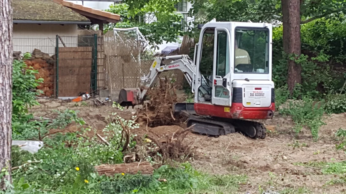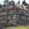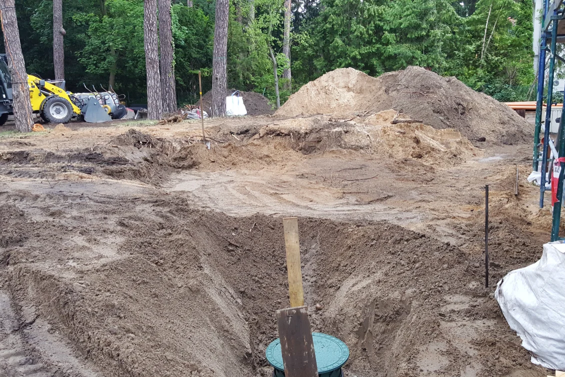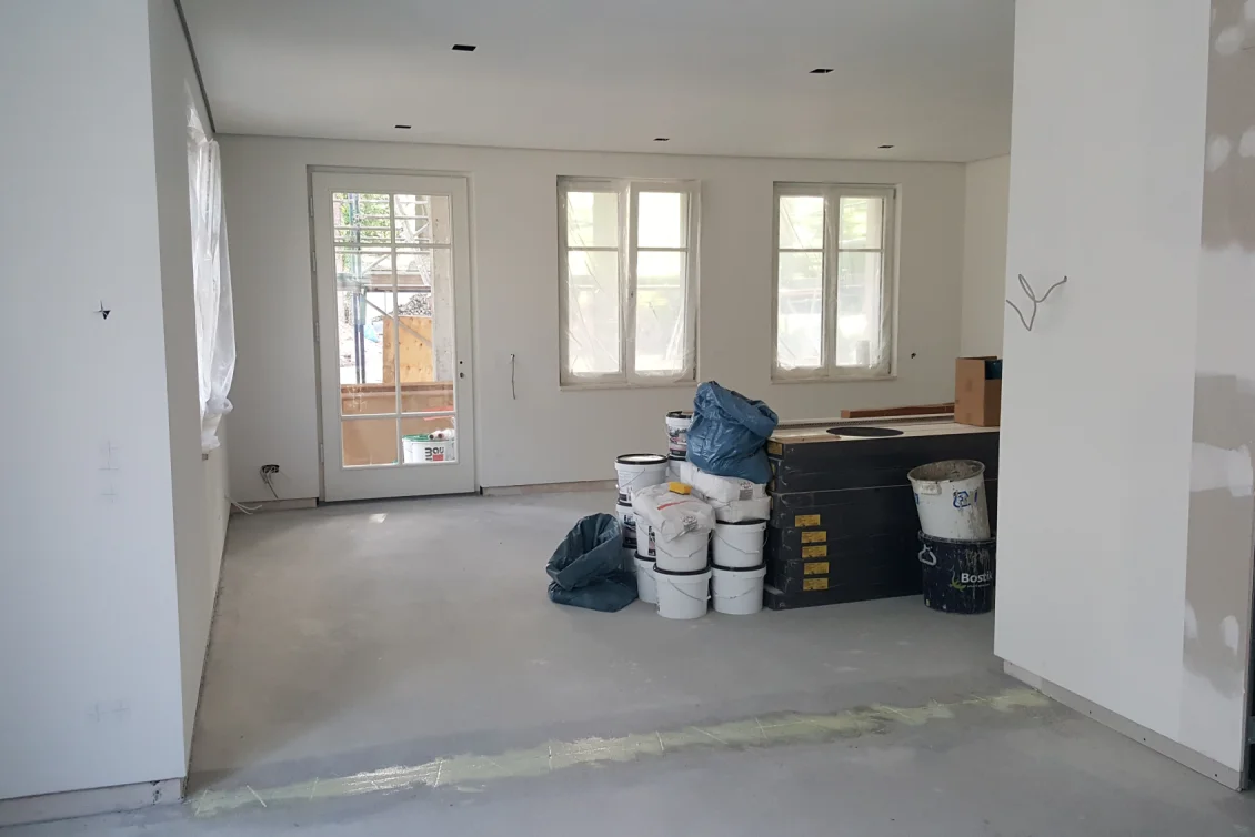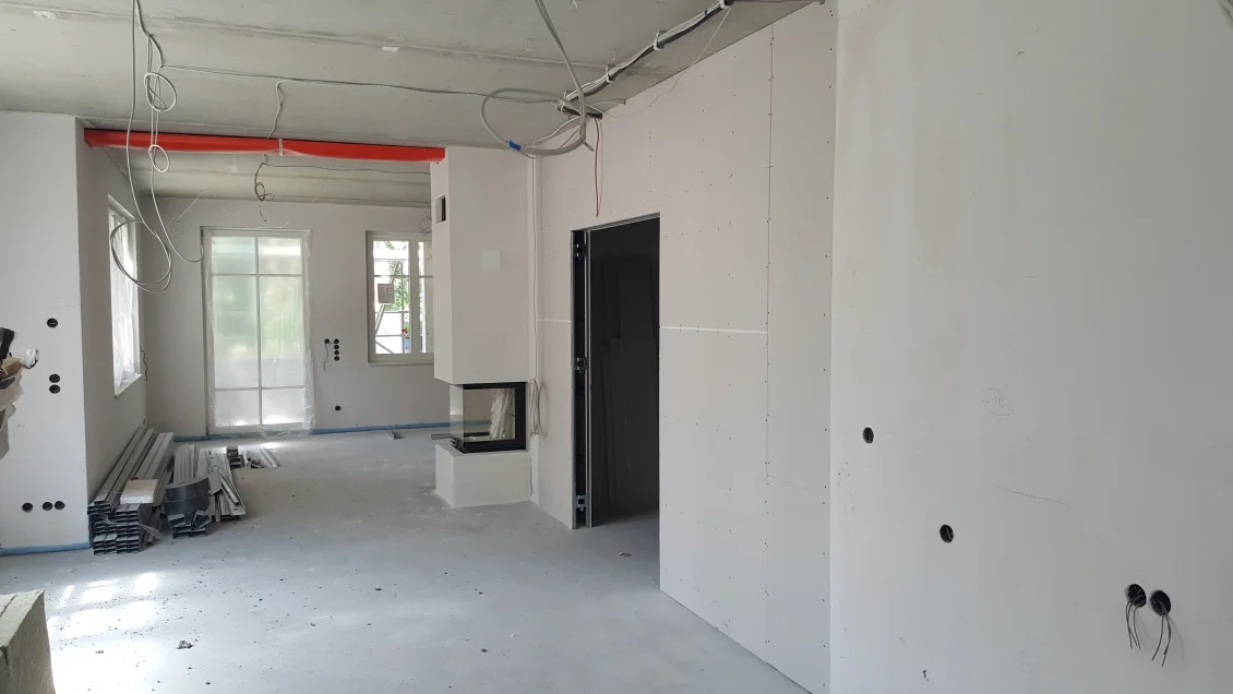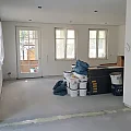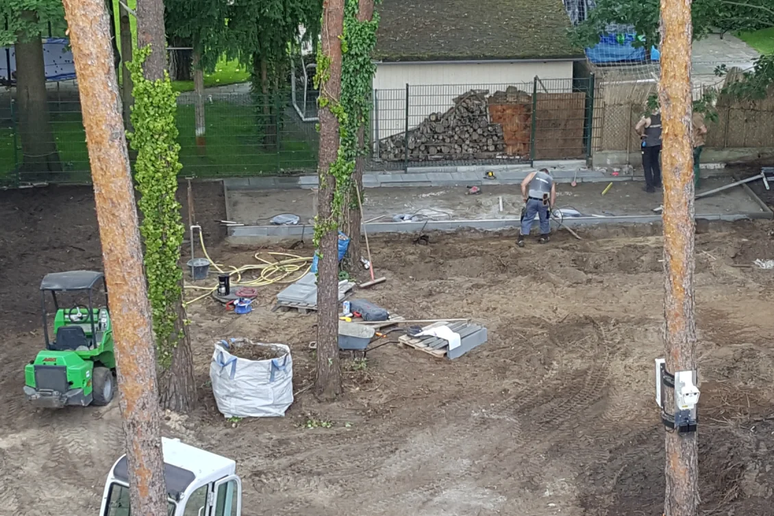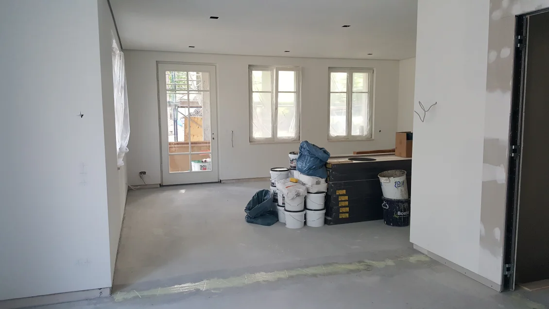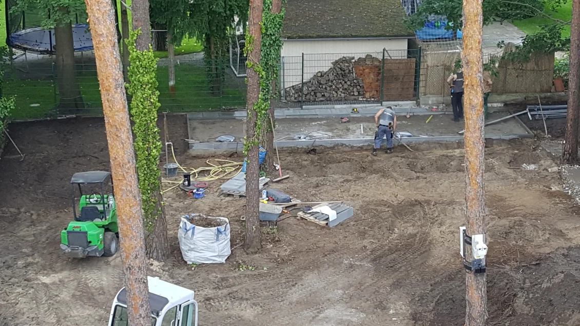 Im Erdgeschoss beginnen die Parkettarbeiten. Der Untergrund wird vorbereitet, damit die Eichendielen verlegt werden können. Damit die Gärtner größere Maschinen einsetzen können wurde der seitliche Giebel bereits geputzt und abgerüstet. Die Terrasse und Stellfläche des Gerätehauses ist bereits zu erkennen.
