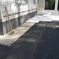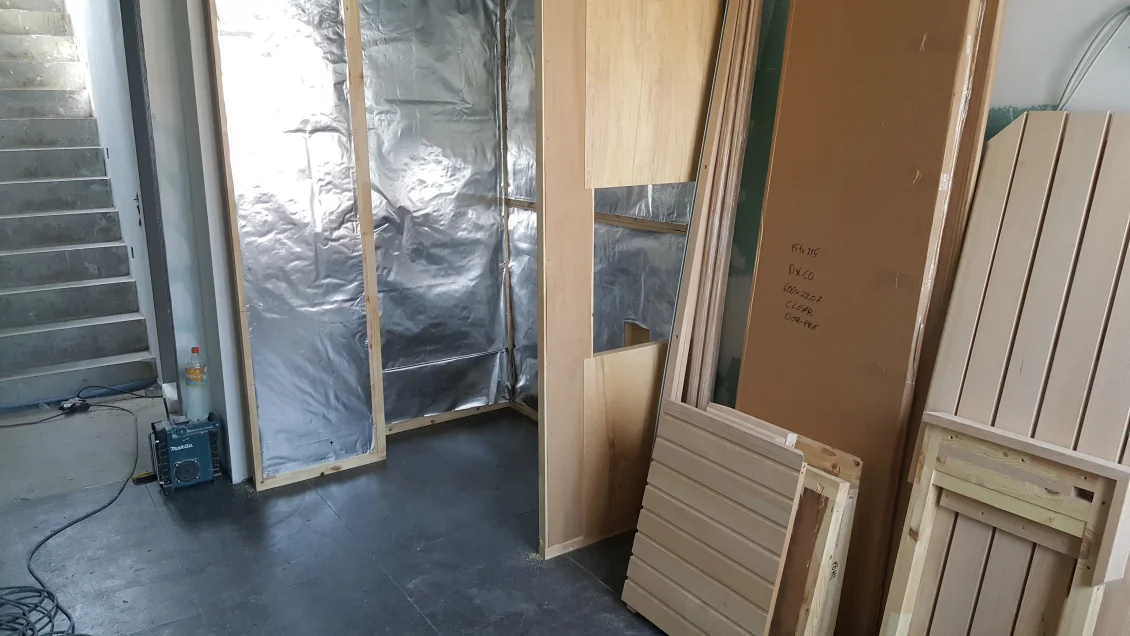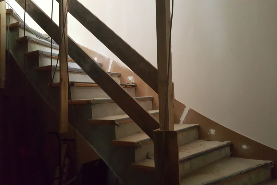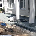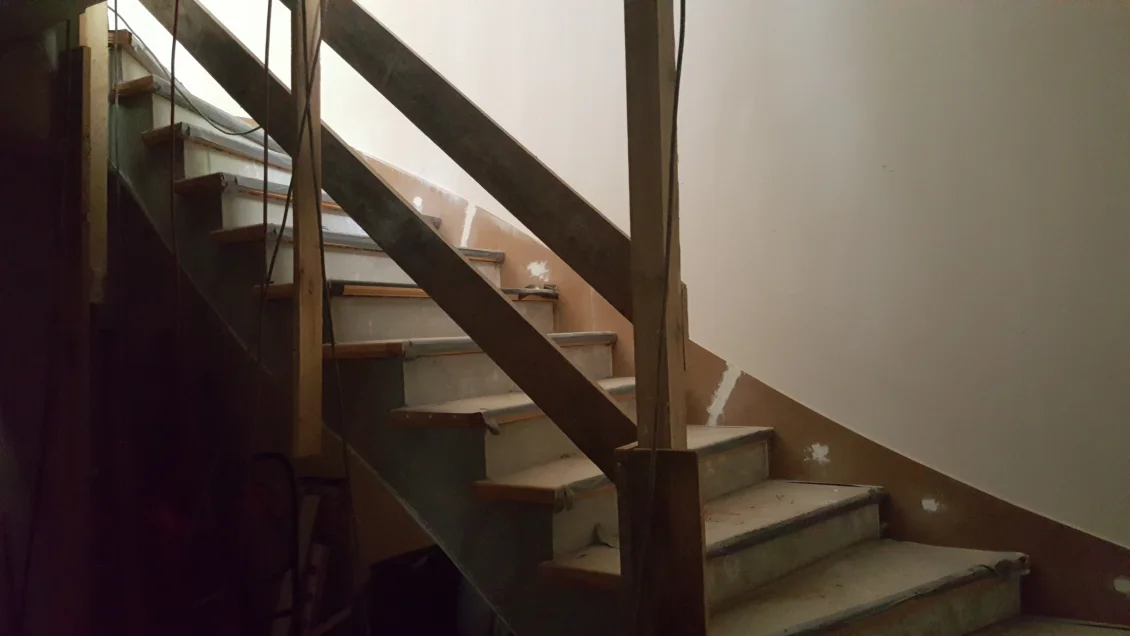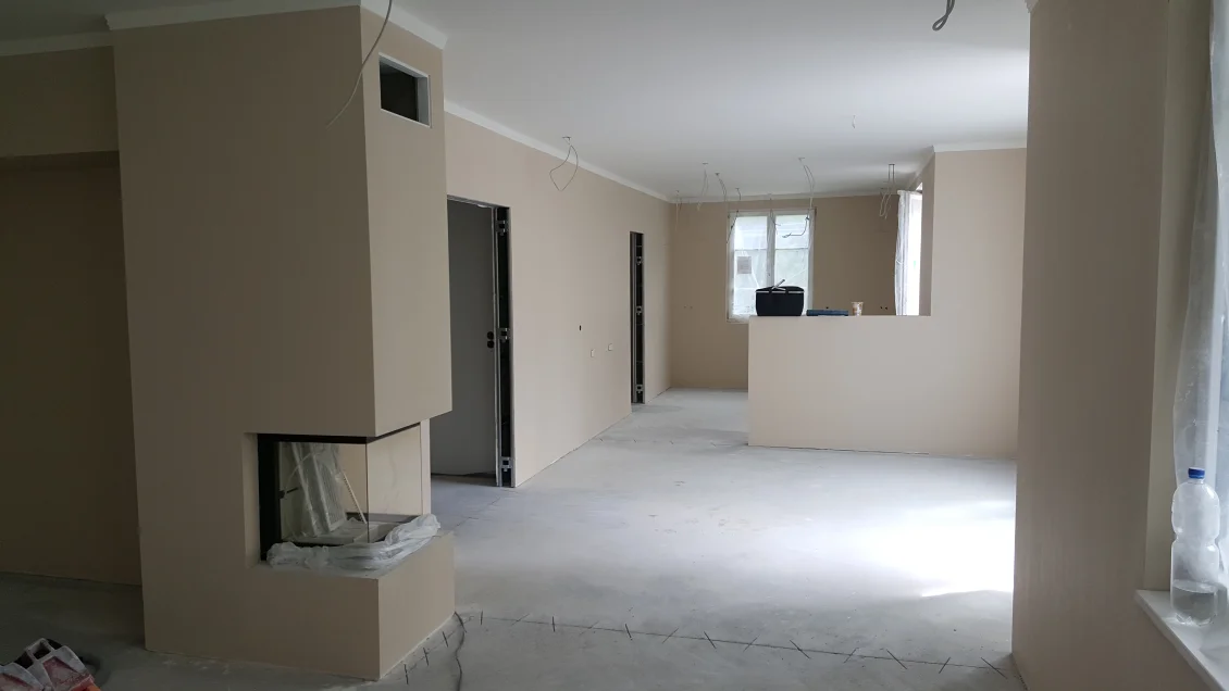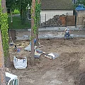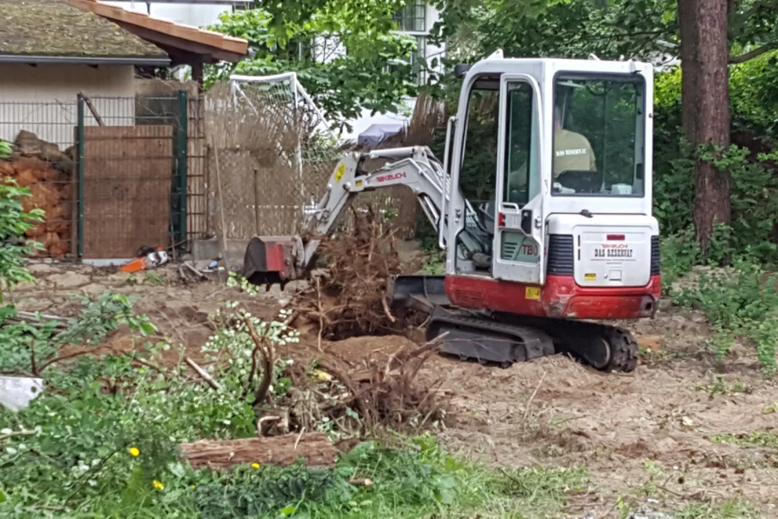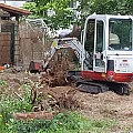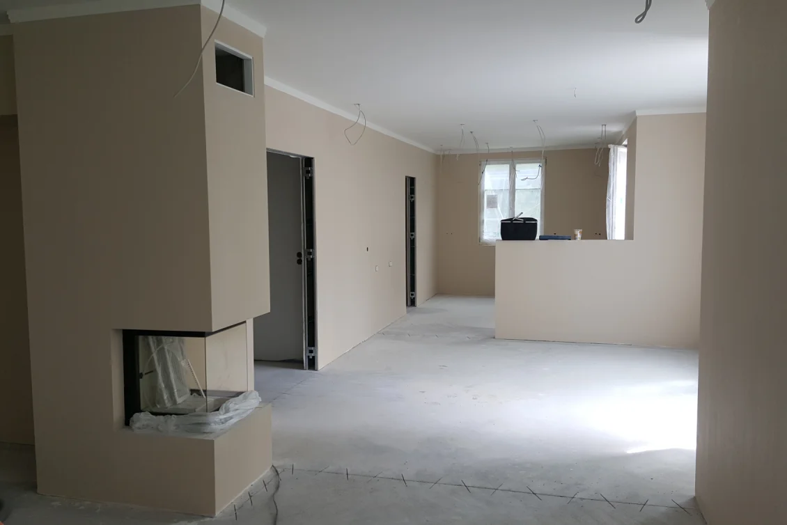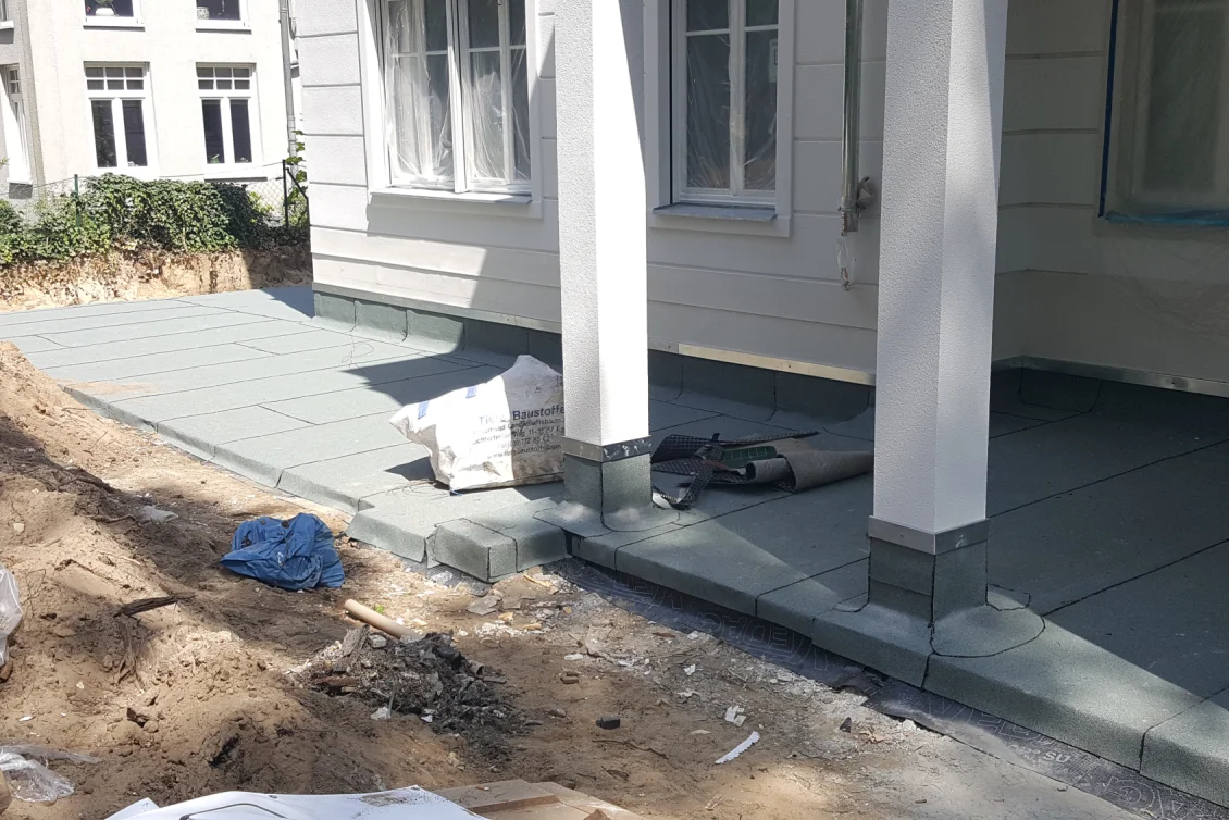 Im Erdgeschoss beginnen die Parkettarbeiten. Der Untergrund wird vorbereitet, damit die Eichendielen verlegt werden können. Damit die Gärtner größere Maschinen einsetzen können wurde der seitliche Giebel bereits geputzt und abgerüstet. Die Terrasse und Stellfläche des Gerätehauses ist bereits zu erkennen.