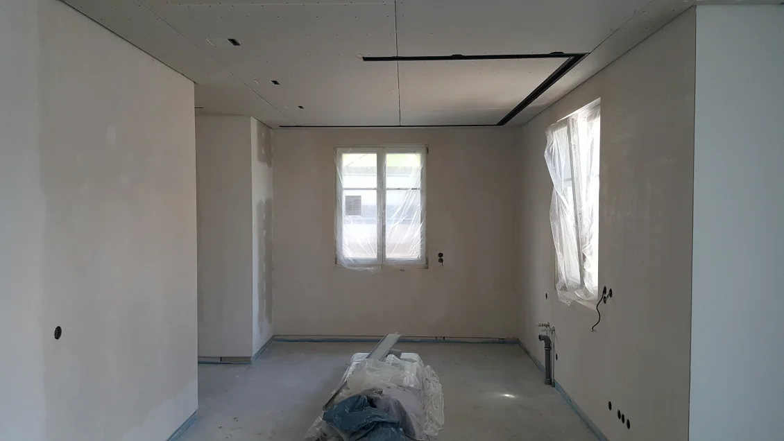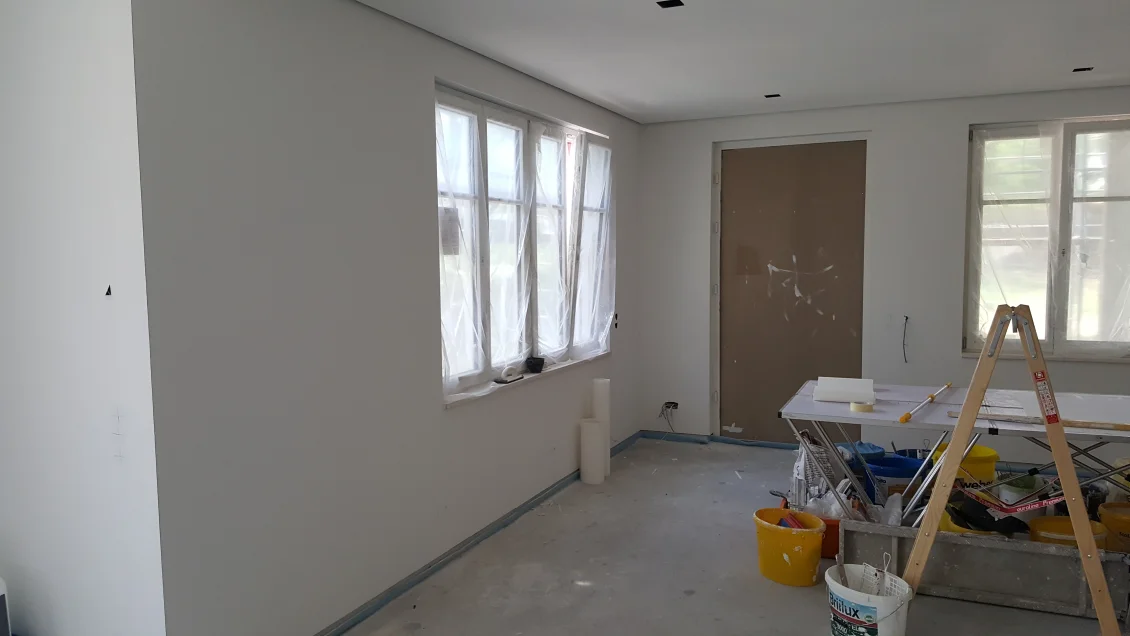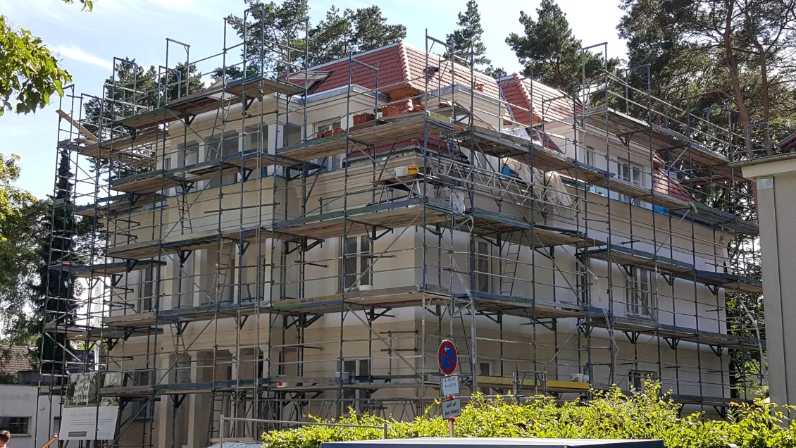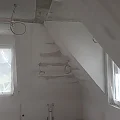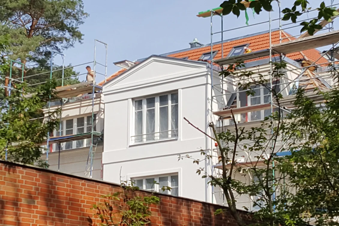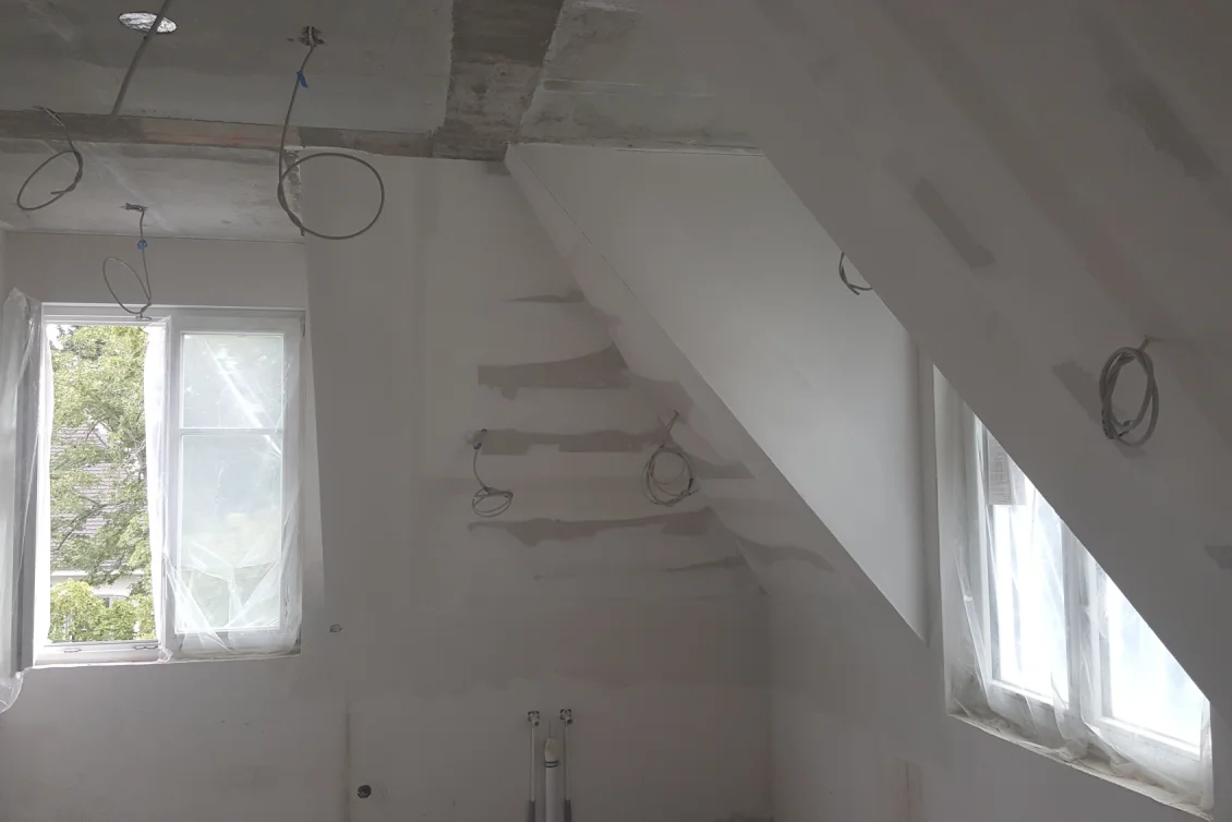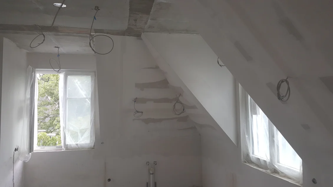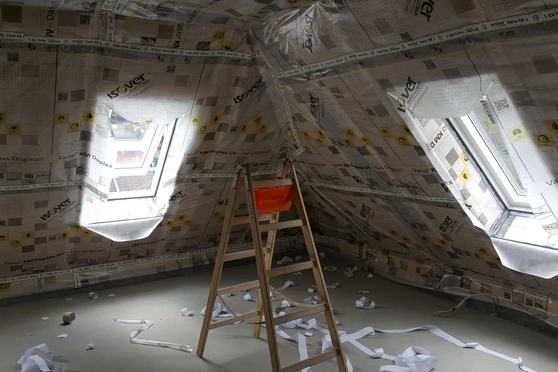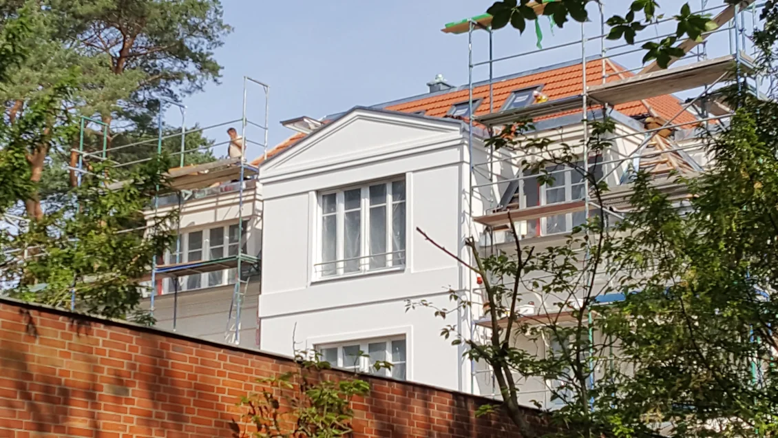 Die Fassadenflächen werden geputzt und beschichtet. Nach den jüngsten Unwettern hält diese Woche hoffentlich das Wetter, so dass in der nächsten Woche abgerüstet werden kann. Die gedämmten Dachschrägen werden mit einer Dampfbremse bekleidet – die Dichtigkeit wird durch einen “Blower-Door”-Test nachgewiesen. In den Wohnungen werden die ersten Anstriche aufgetragen.