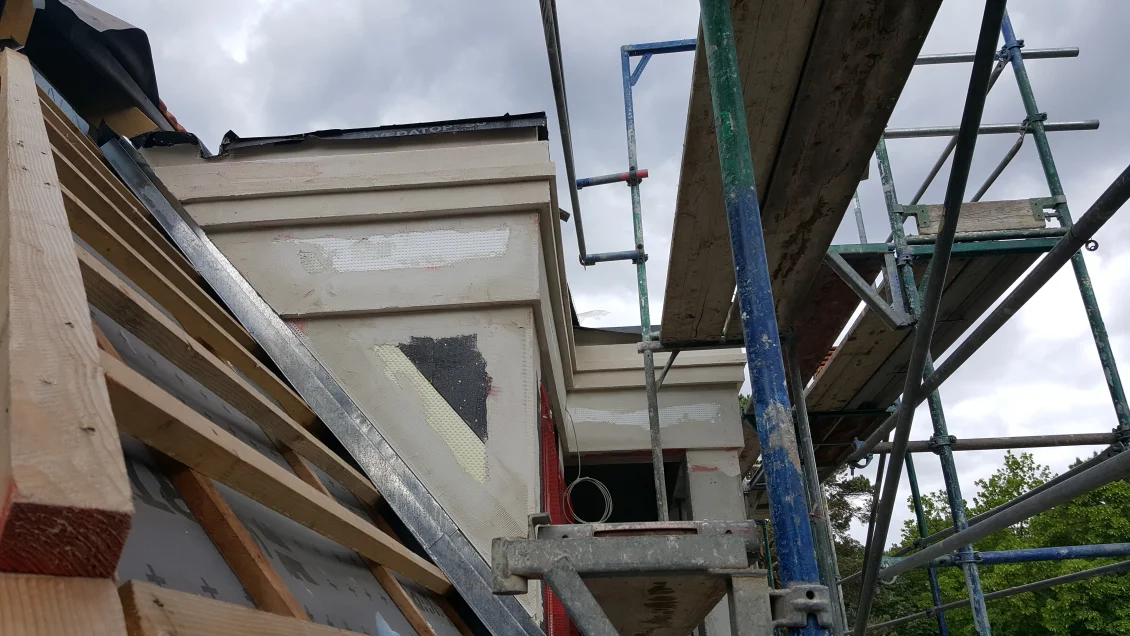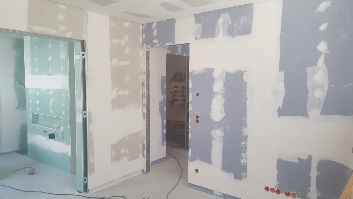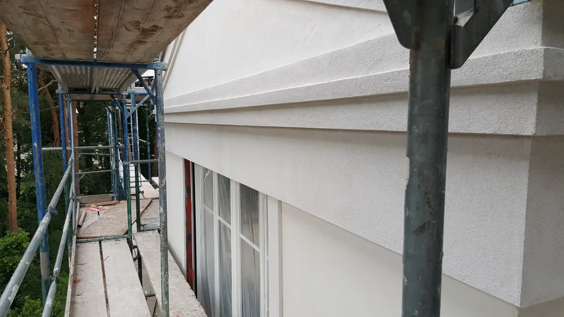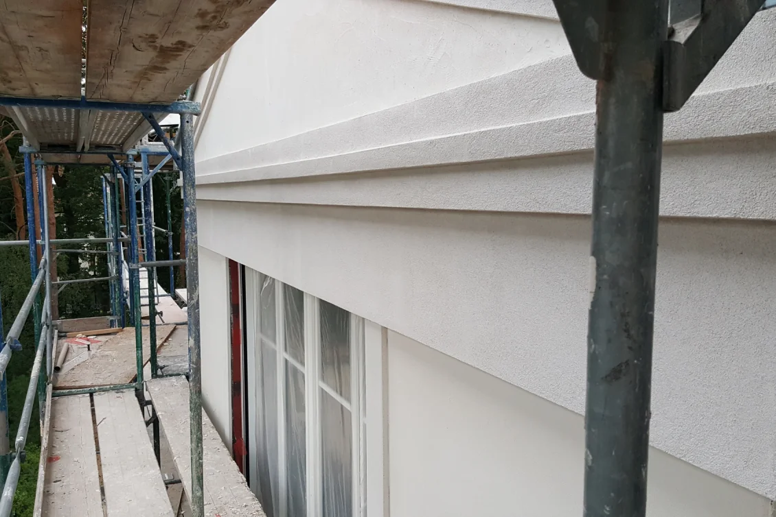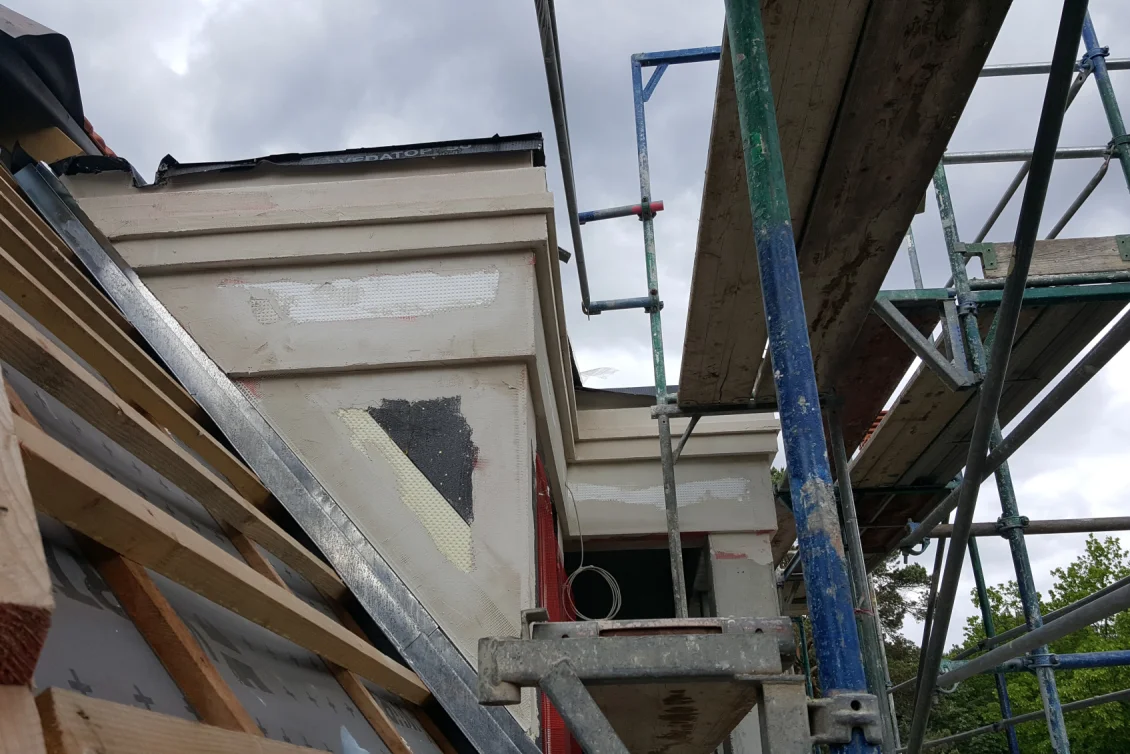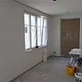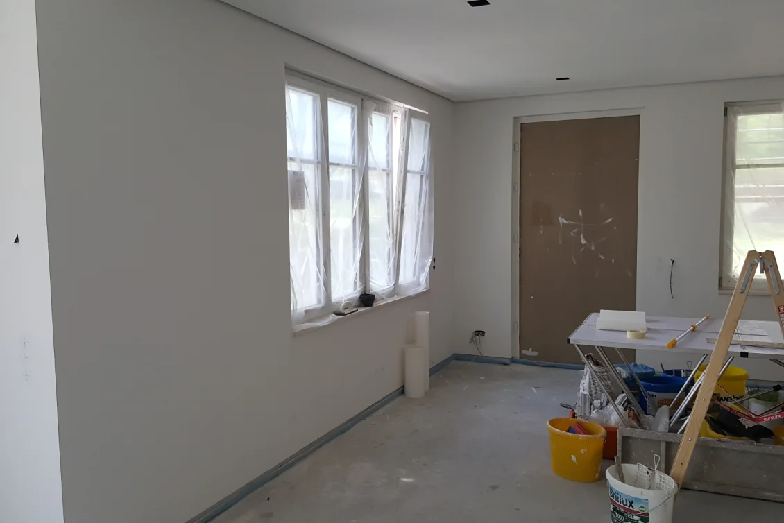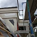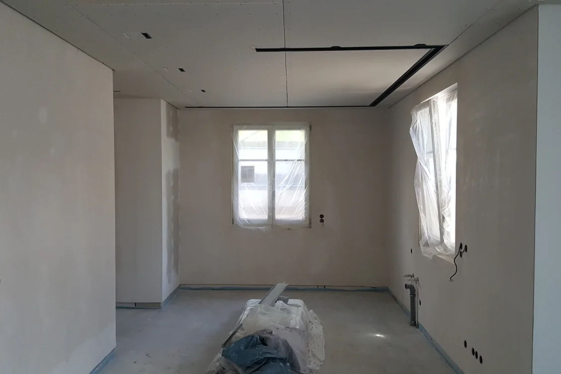 Die Fassadenflächen werden geputzt und beschichtet. Nach den jüngsten Unwettern hält diese Woche hoffentlich das Wetter, so dass in der nächsten Woche abgerüstet werden kann. Die gedämmten Dachschrägen werden mit einer Dampfbremse bekleidet – die Dichtigkeit wird durch einen “Blower-Door”-Test nachgewiesen. In den Wohnungen werden die ersten Anstriche aufgetragen.