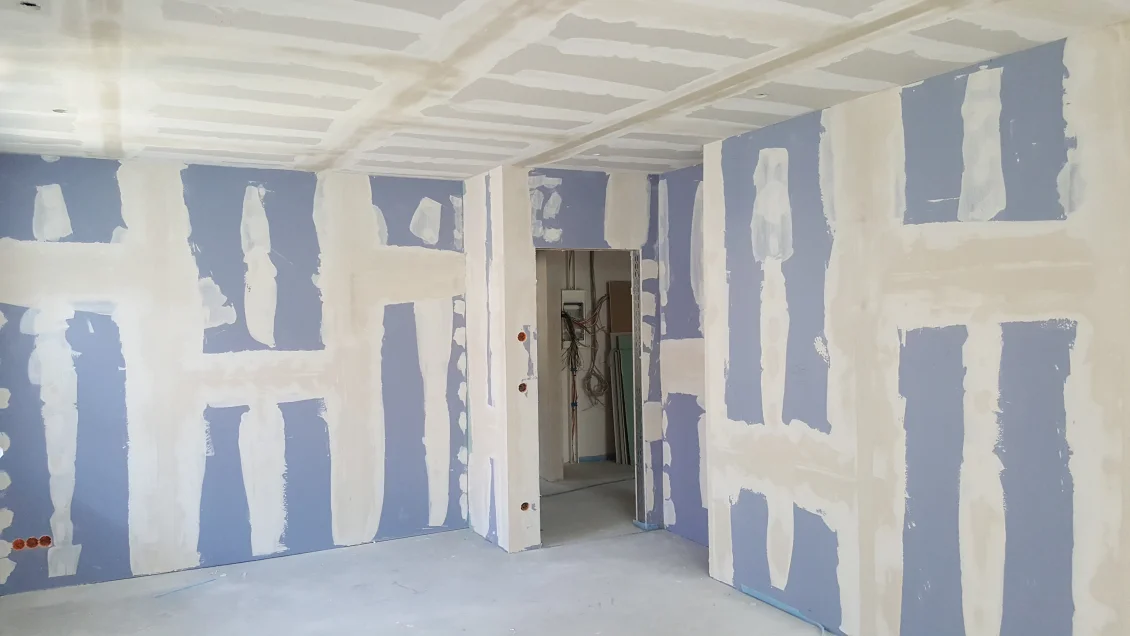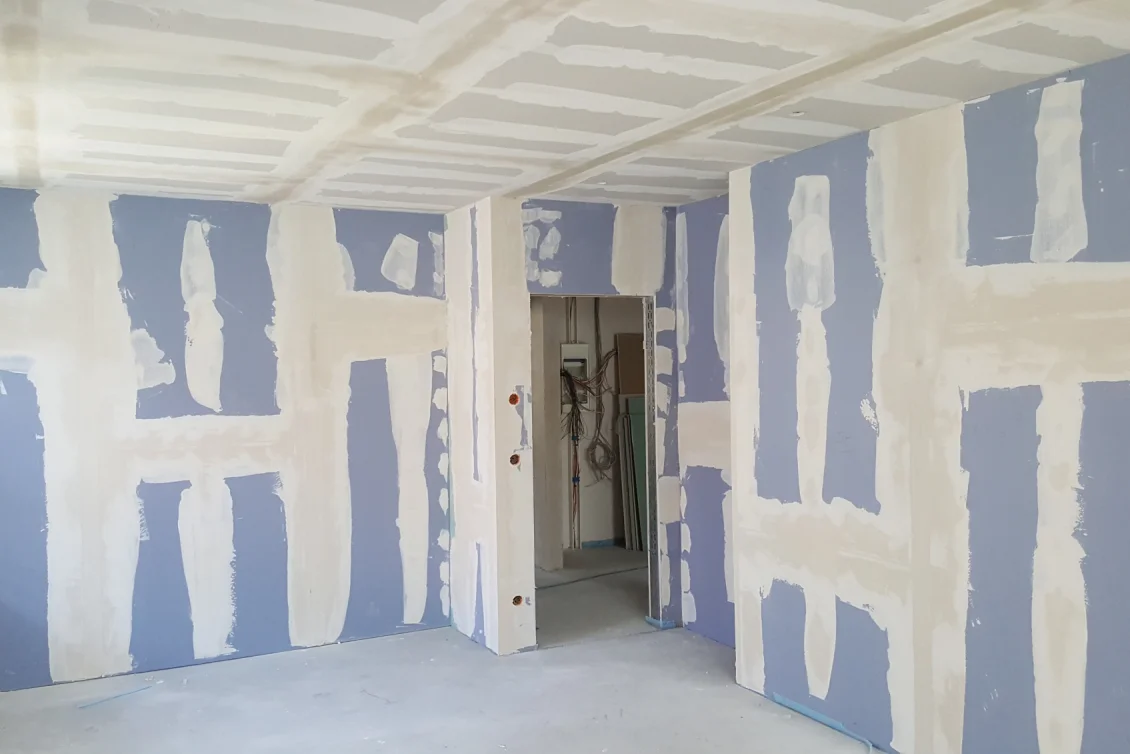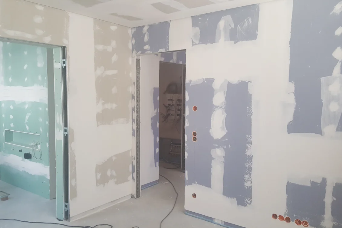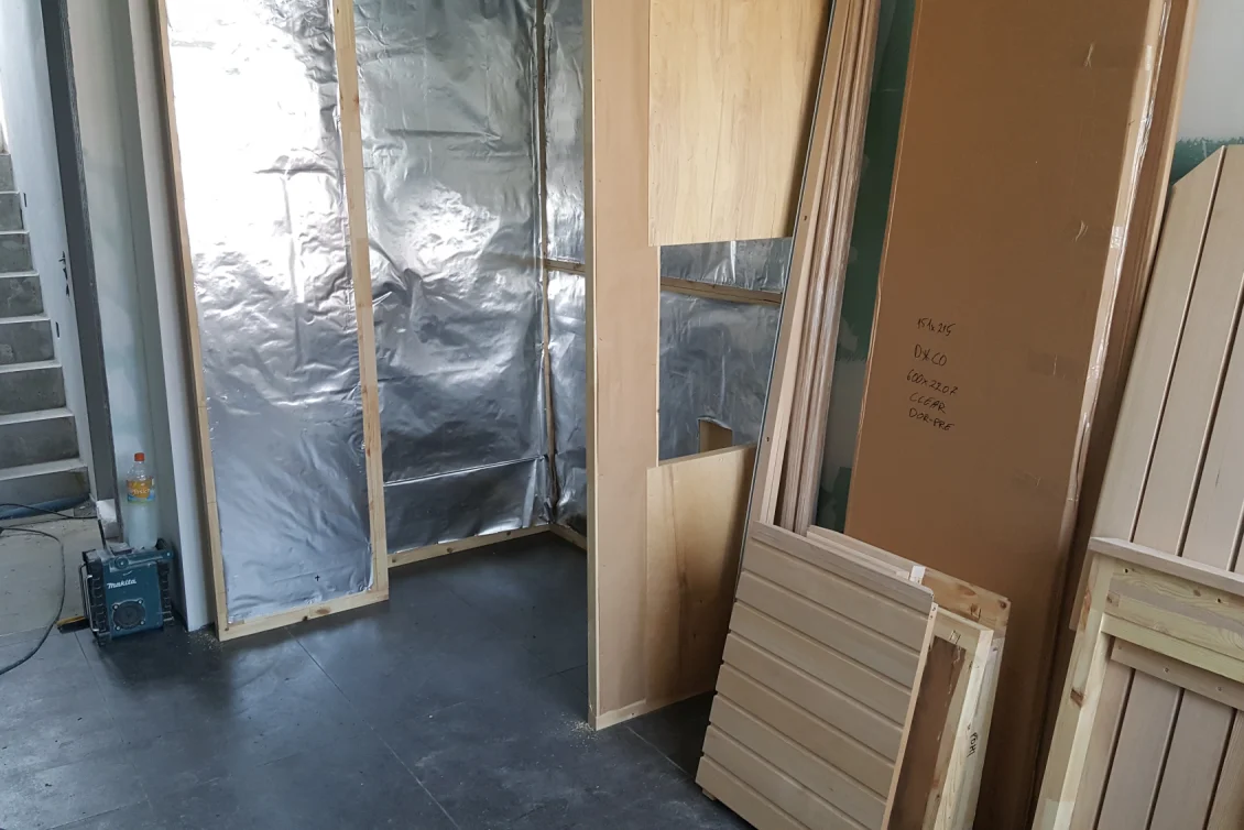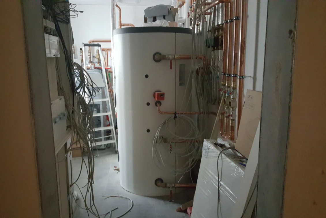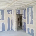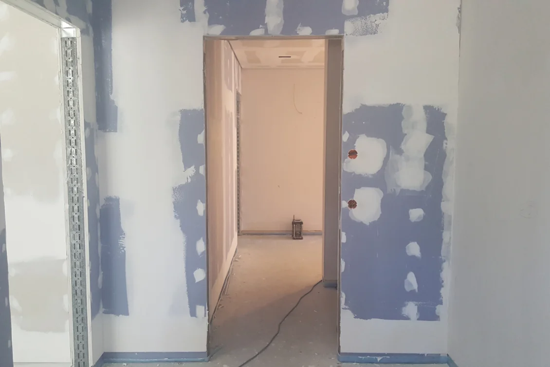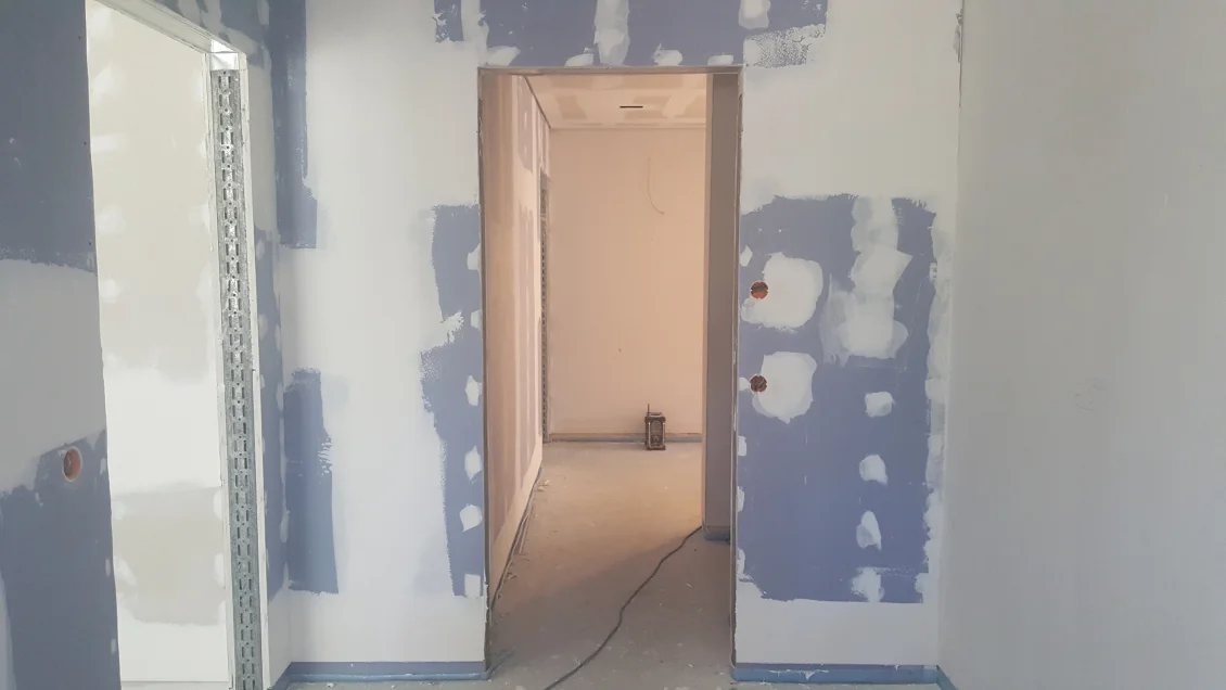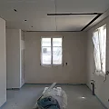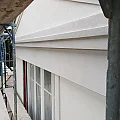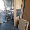 Die Fassadenflächen werden geputzt und beschichtet. Nach den jüngsten Unwettern hält diese Woche hoffentlich das Wetter, so dass in der nächsten Woche abgerüstet werden kann. Die gedämmten Dachschrägen werden mit einer Dampfbremse bekleidet – die Dichtigkeit wird durch einen “Blower-Door”-Test nachgewiesen. In den Wohnungen werden die ersten Anstriche aufgetragen.