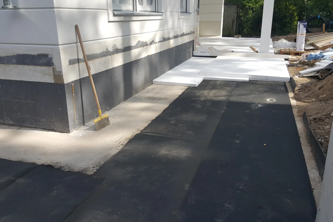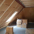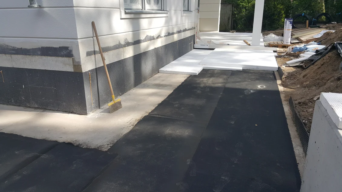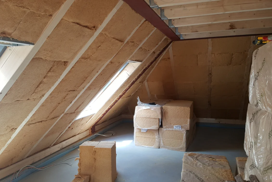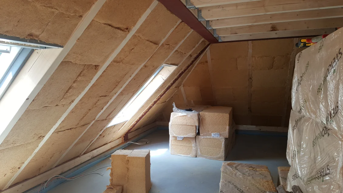 Die letzten Fassadenflächen werden armiert, so dass in der nächsten Woche geputzt werden kann und die Deckanstriche aufgebracht werden können. Im Dachgeschoss werden die Dachschrägen mit Holzwolle ausgedämmt, wodurch gegenüber Mineralwolle ein besserer sommerlicher Wärmeschutz erreicht wird. Im Garten ist bereits die Rigole angelegt, welche einen Teil der Dachentwässerung aufnimmt.