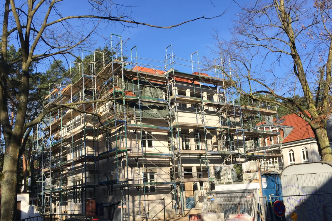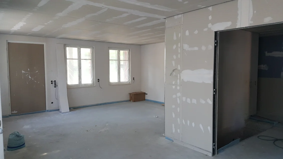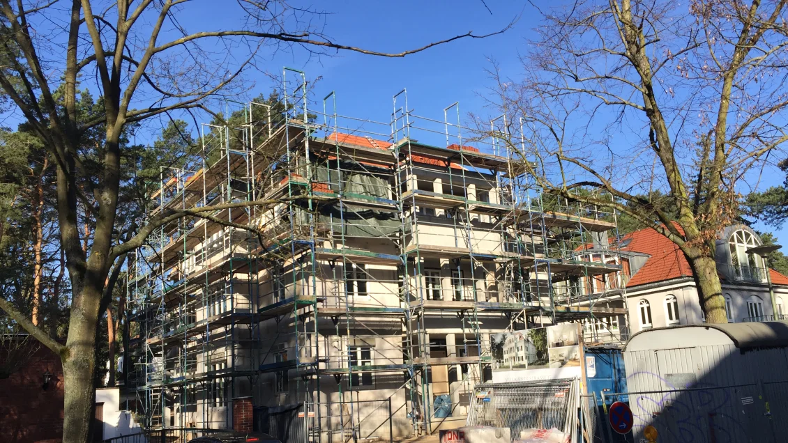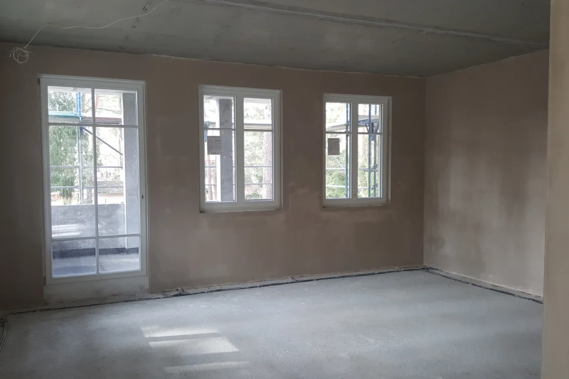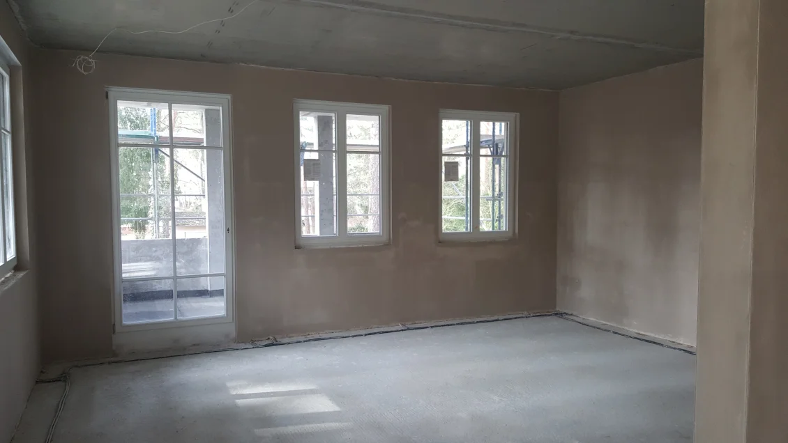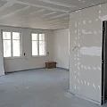 Die aufwändigen Details der Trockenbauarbeiten wurden abgeschlossen, so dass individuelle Einrichtungskonzepte, wie Wandnischen, Regale oder auch oberflächenbündige Spiegelschränke mit eingelassenenen Fliesenspiegeln, entstehen können. im Außenbereich wurde die Tiefgaragenrampe fertiggestellt.