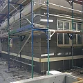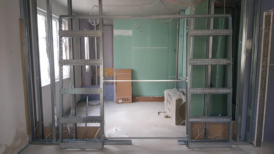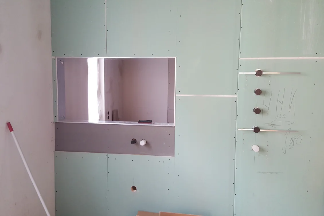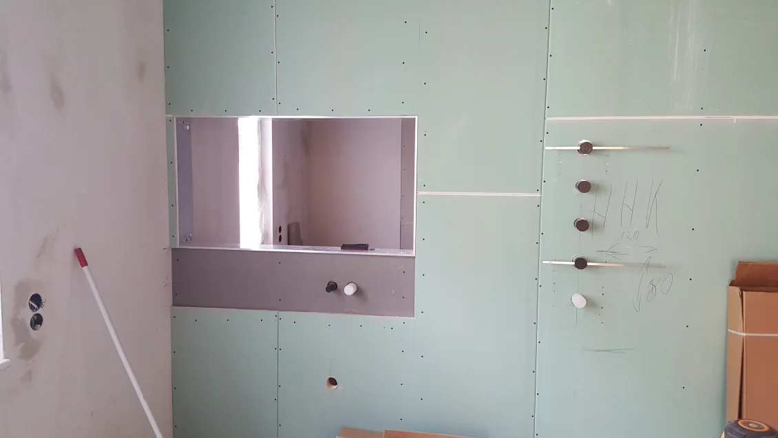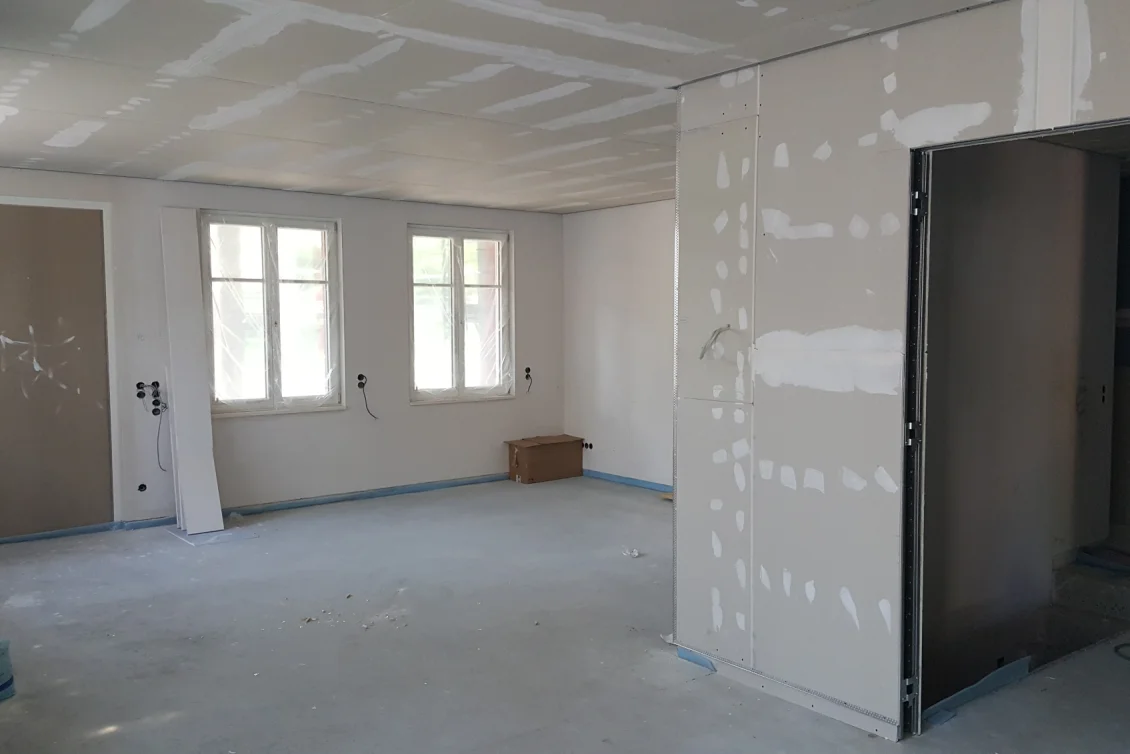 Die aufwändigen Details der Trockenbauarbeiten wurden abgeschlossen, so dass individuelle Einrichtungskonzepte, wie Wandnischen, Regale oder auch oberflächenbündige Spiegelschränke mit eingelassenenen Fliesenspiegeln, entstehen können. im Außenbereich wurde die Tiefgaragenrampe fertiggestellt.