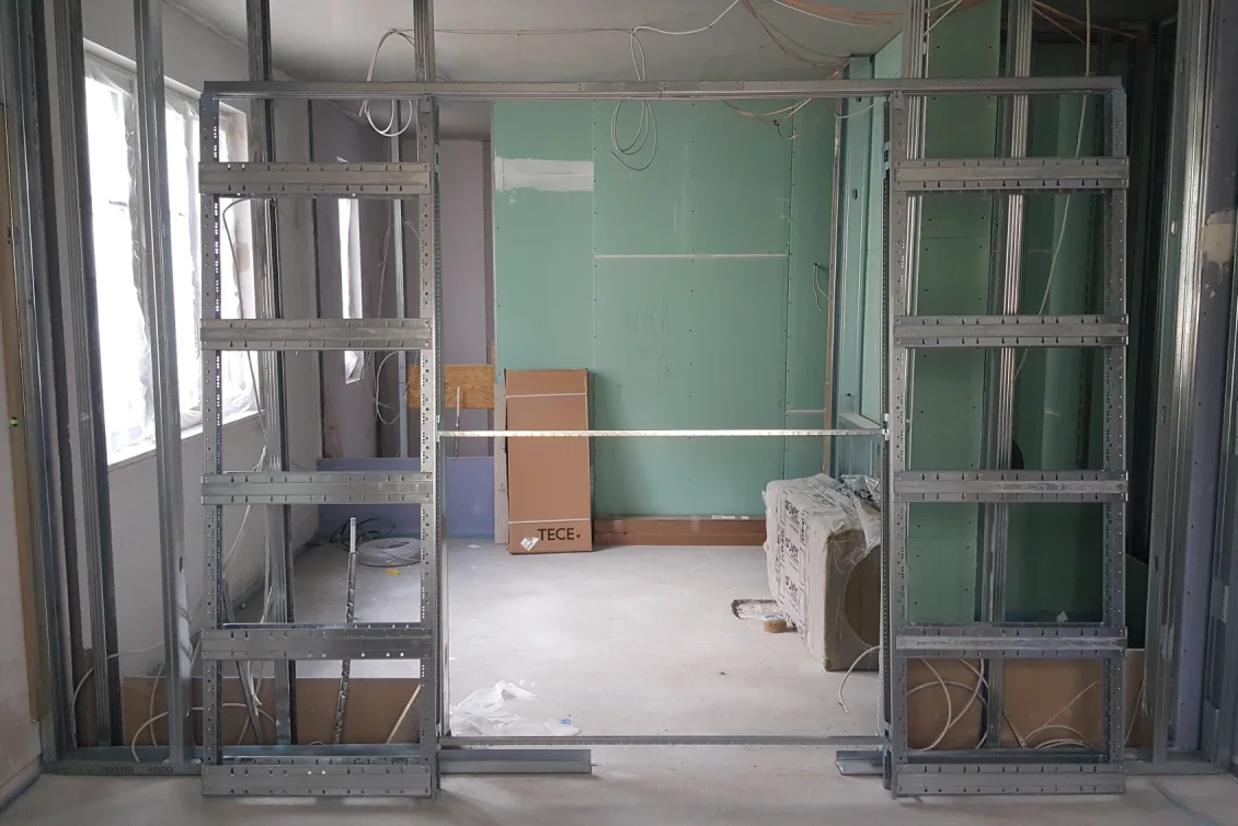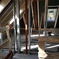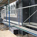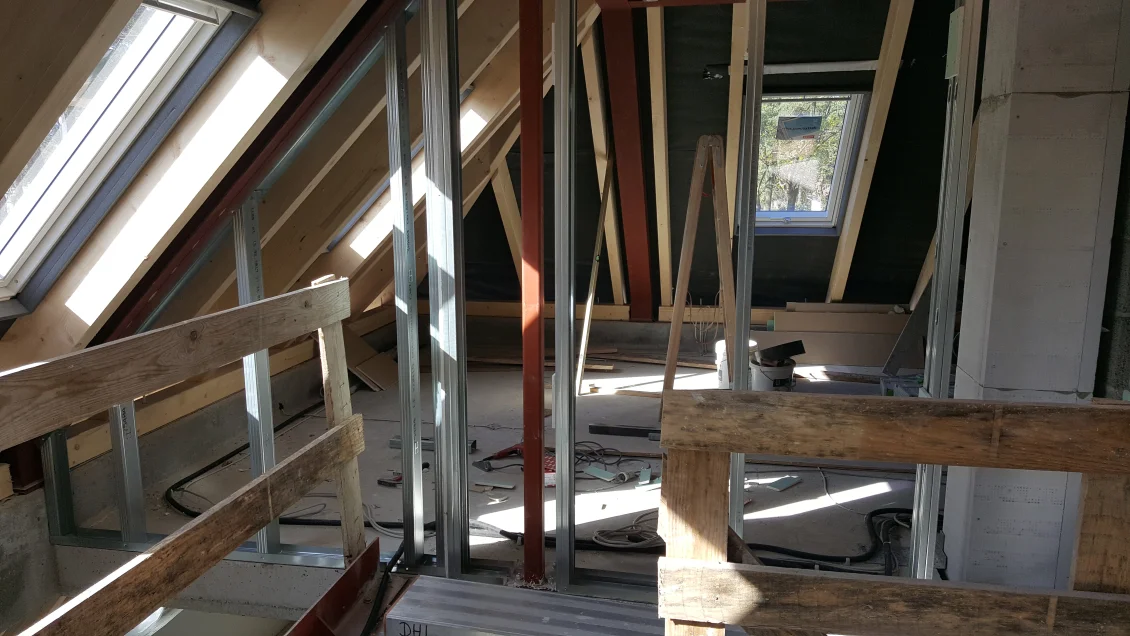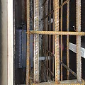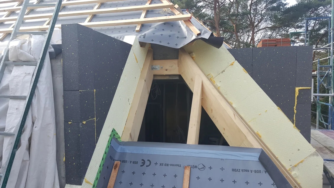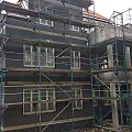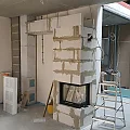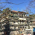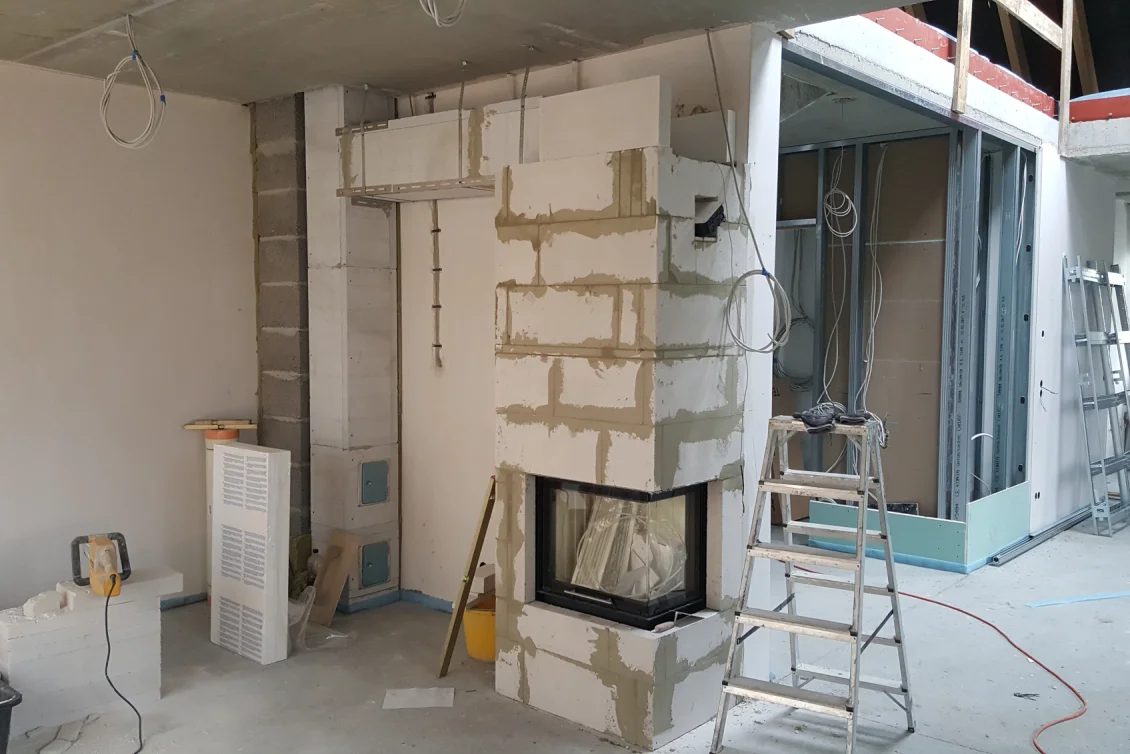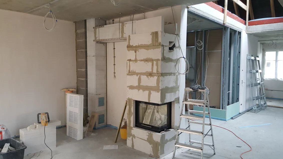 Die Kamine mit den Rauchrohrverzügen werden eingebaut. Gleichzeitig sind die Trockenbaukostruktionen der Schiebetüranlagen eingetroffen und werden jetzt montiert und in den Geschossen verbaut. Die Dämmung der Fassade ist nahezu abgeschlossen. Deutlich lassen sich noch die Brandriegel zur Vermeidung von Brandüberschlag erkennen.