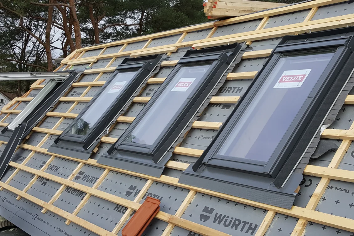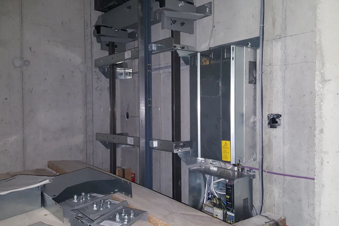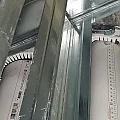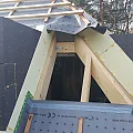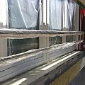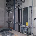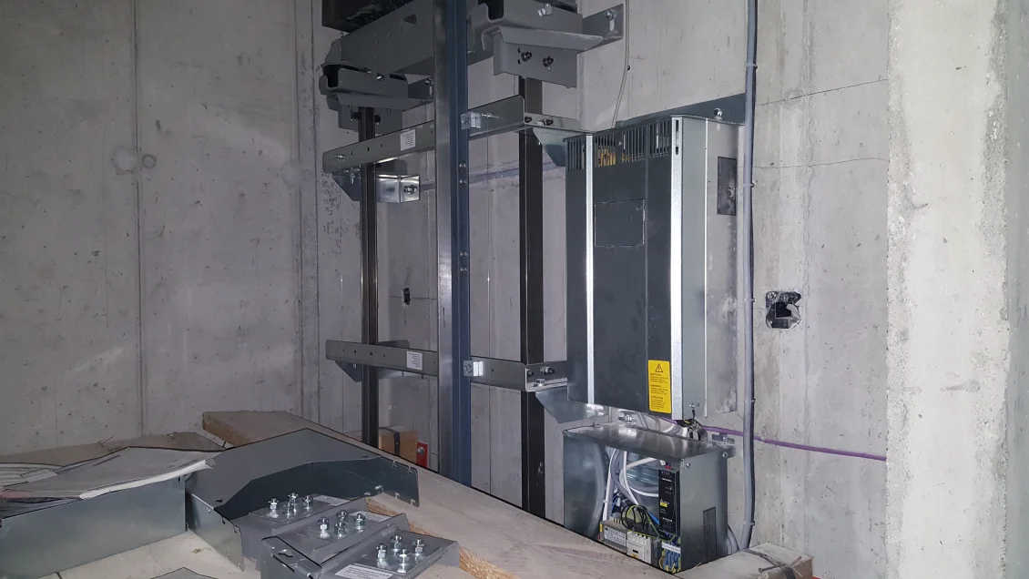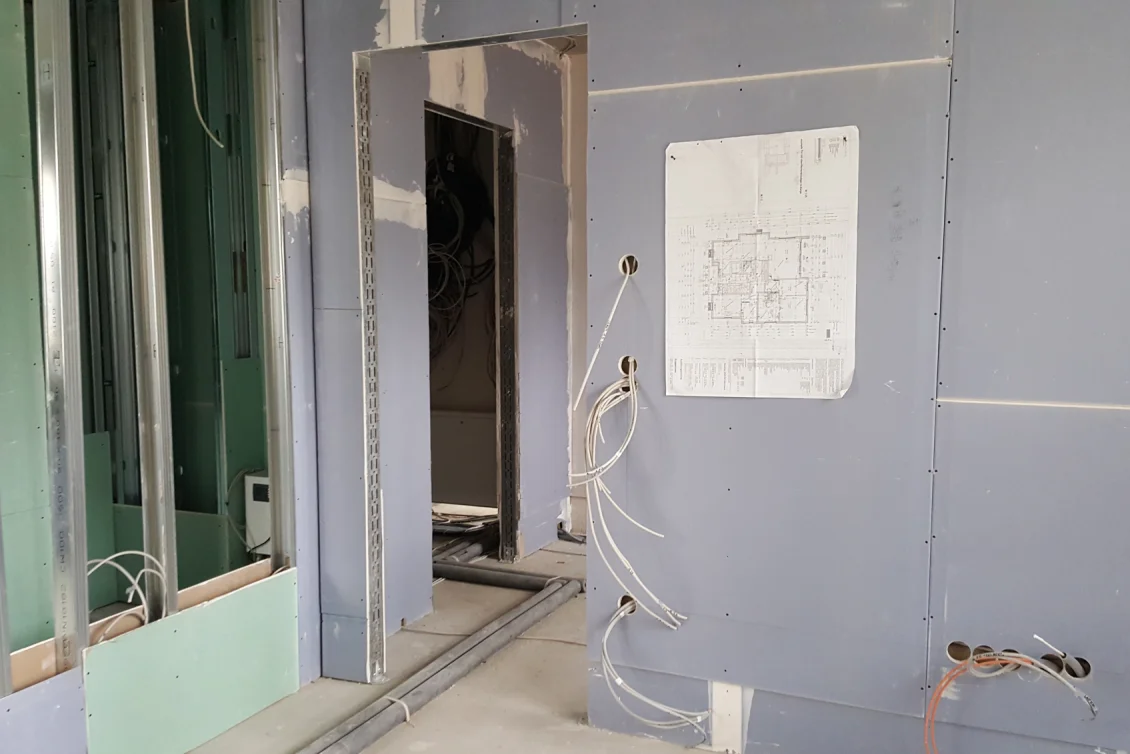 Die Kamine mit den Rauchrohrverzügen werden eingebaut. Gleichzeitig sind die Trockenbaukostruktionen der Schiebetüranlagen eingetroffen und werden jetzt montiert und in den Geschossen verbaut. Die Dämmung der Fassade ist nahezu abgeschlossen. Deutlich lassen sich noch die Brandriegel zur Vermeidung von Brandüberschlag erkennen.