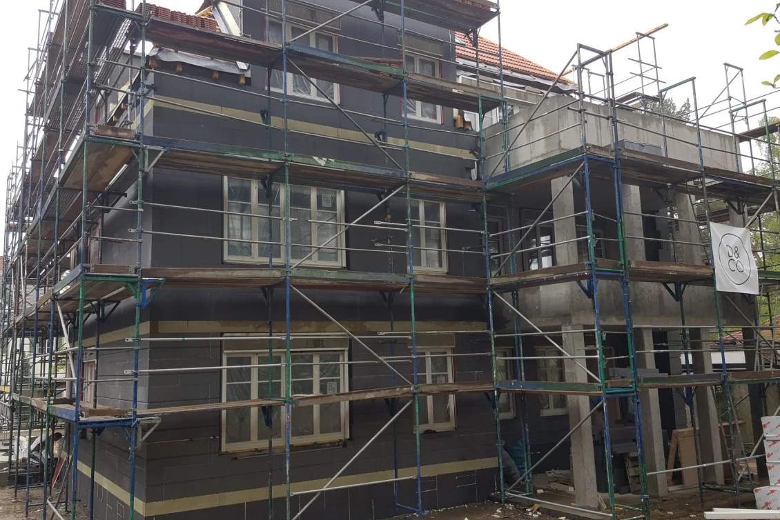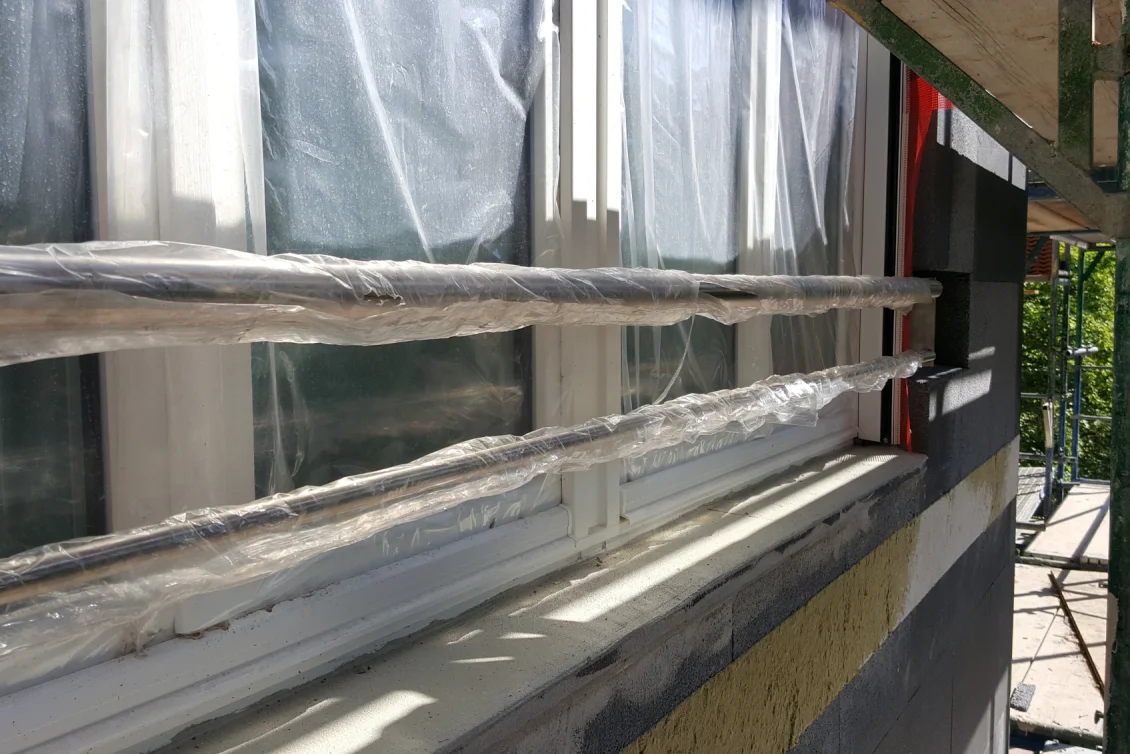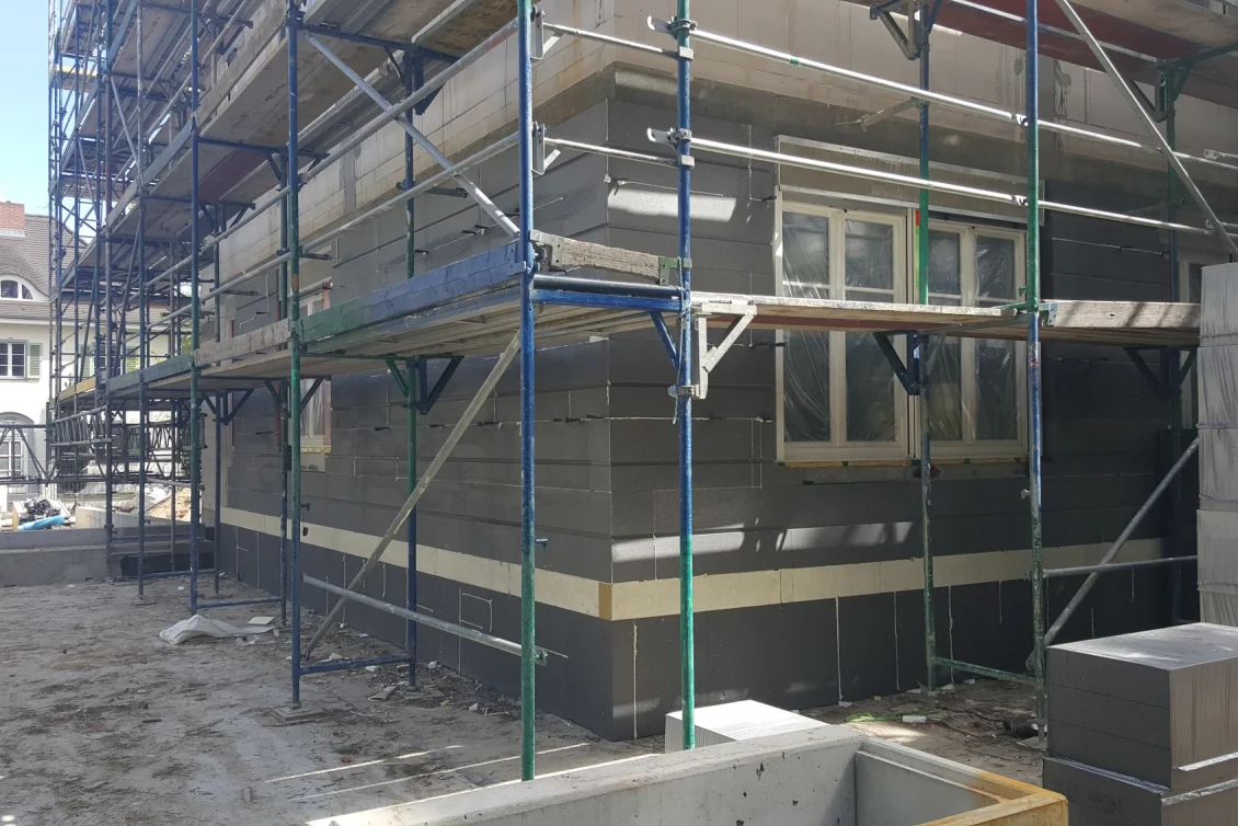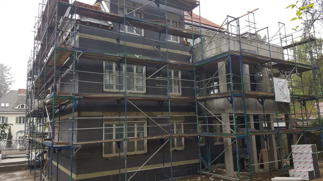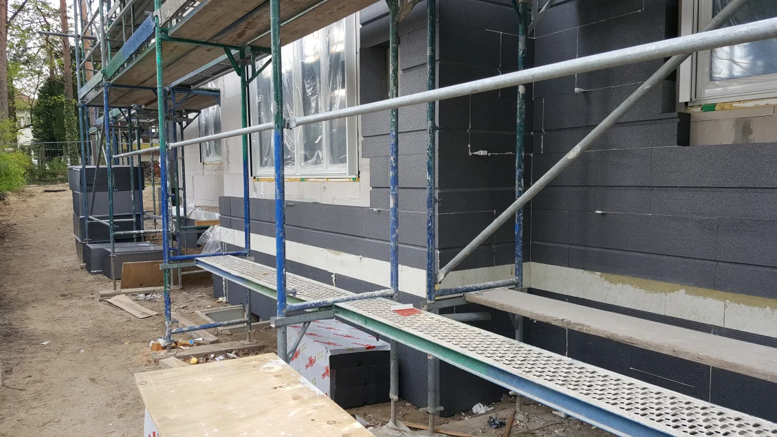 Die Fassade ist fertig gedämmt, so dass jetzt die Details ausgebildet werden. Mehr als 360 m Brüstungs-, Gurt- und Traufgesimse und 180 m Fensterfaschen werden angelegt. Zwischenzeitlich hat unser Schlosser auch die Absturzsicherungen vor die tiefen Fenster der Süd-Ost-Fassade montiert.