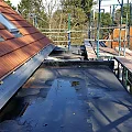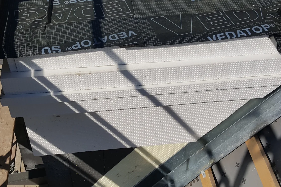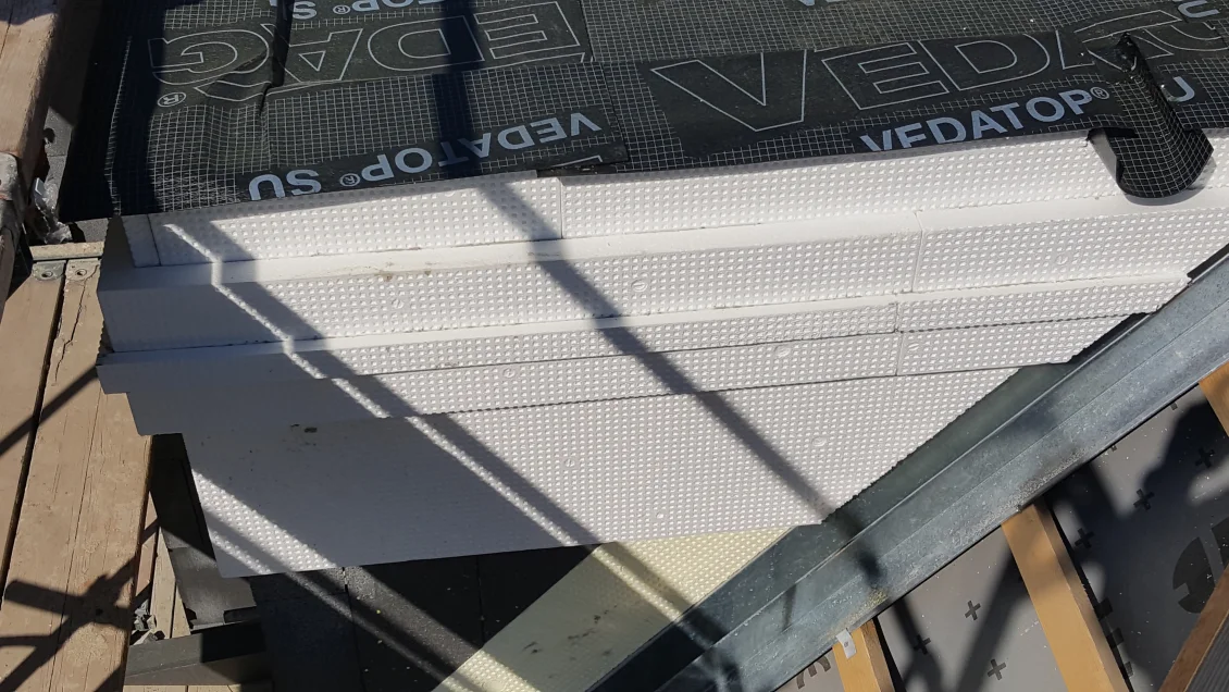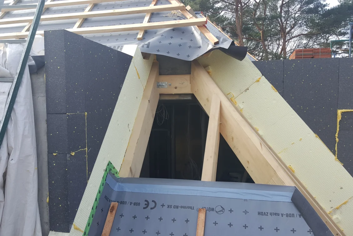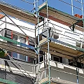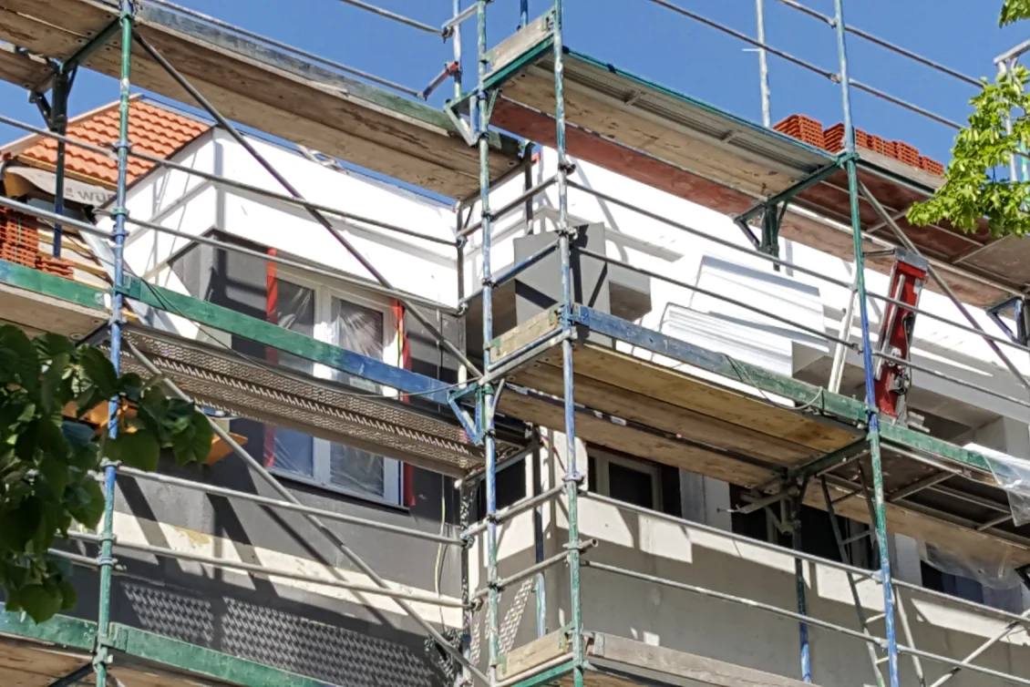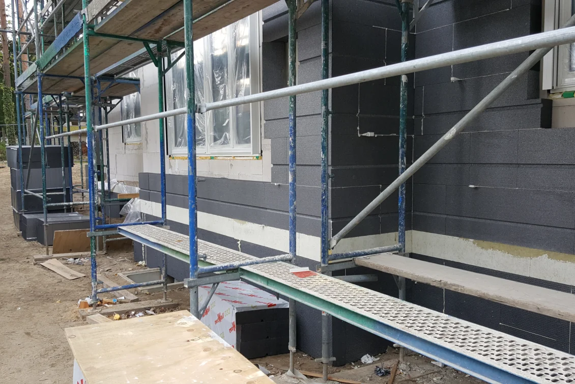 Die Fassade ist fertig gedämmt, so dass jetzt die Details ausgebildet werden. Mehr als 360 m Brüstungs-, Gurt- und Traufgesimse und 180 m Fensterfaschen werden angelegt. Zwischenzeitlich hat unser Schlosser auch die Absturzsicherungen vor die tiefen Fenster der Süd-Ost-Fassade montiert.