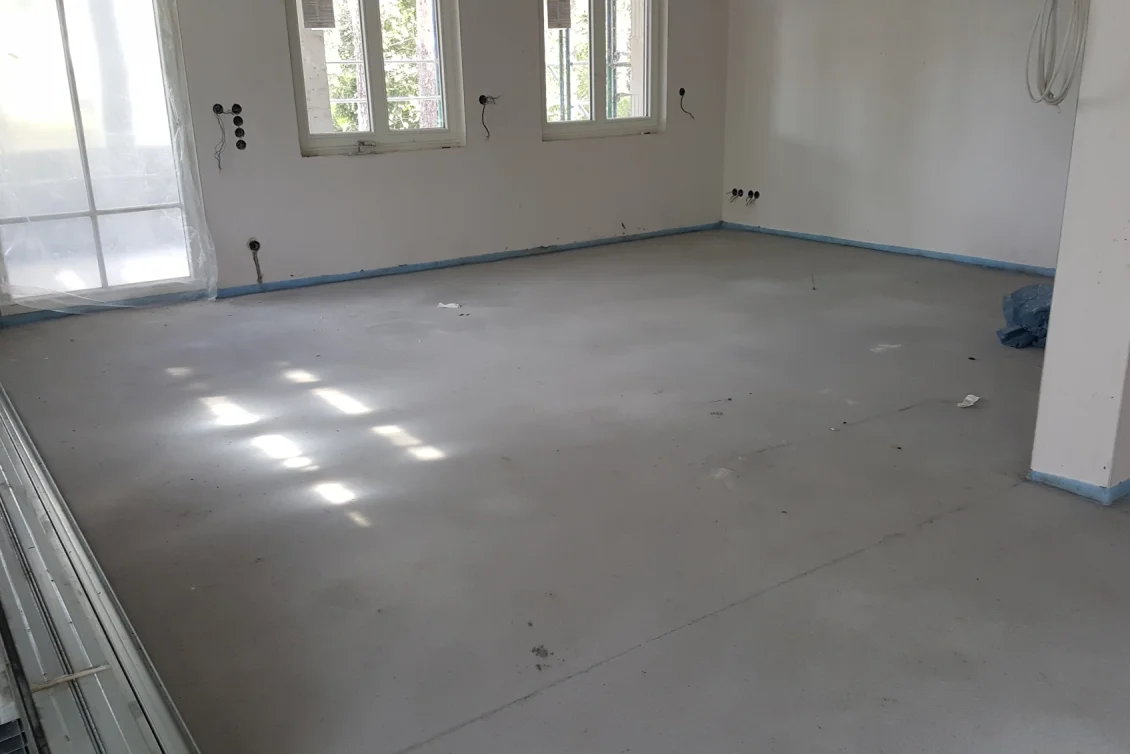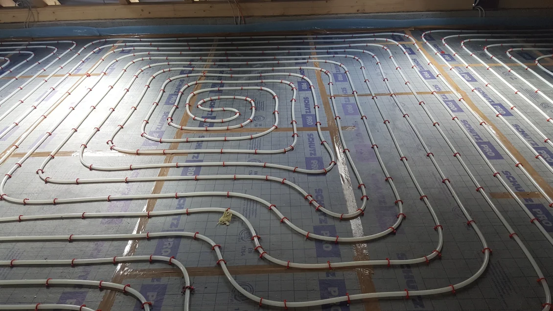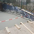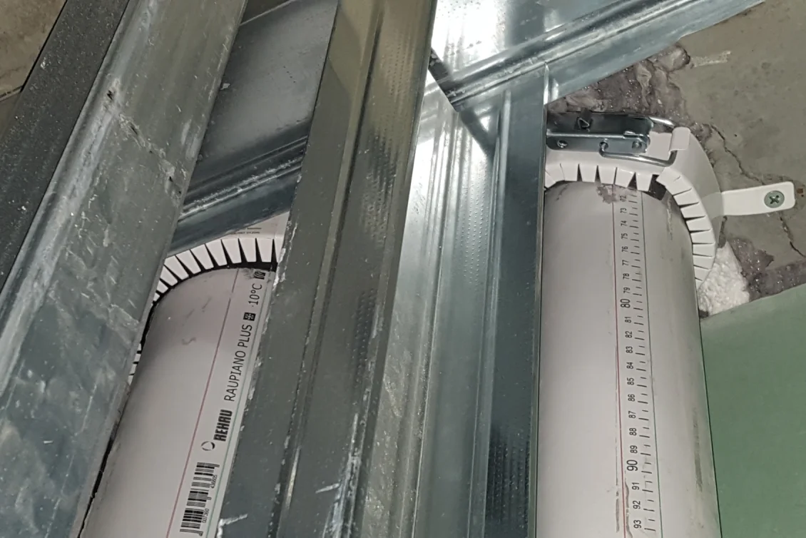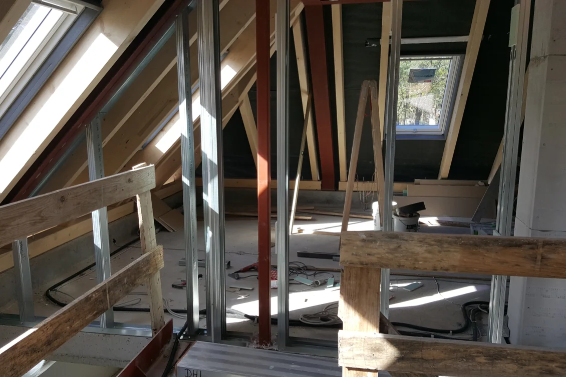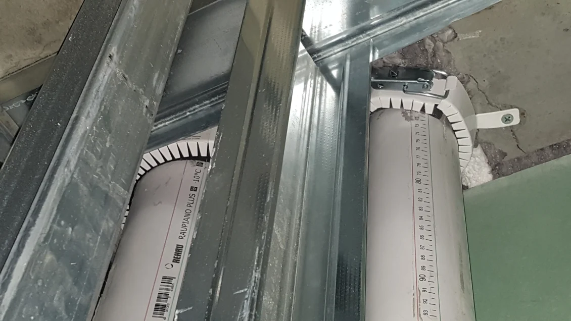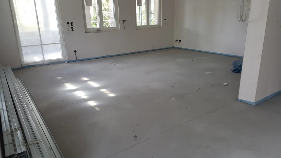 Die Rampe der Tiefgarage ist betoniert und hat auf der Oberfläche zur Rutschsicherung einen “Besenstrich” erhalten. Im Gebäude wird bereits in den unteren Geschossen die Fußbodenheizung verlegt, wärend im Spitzboden noch die letzten Installations- und Trockenbauarbeiten ausgeführt werden.