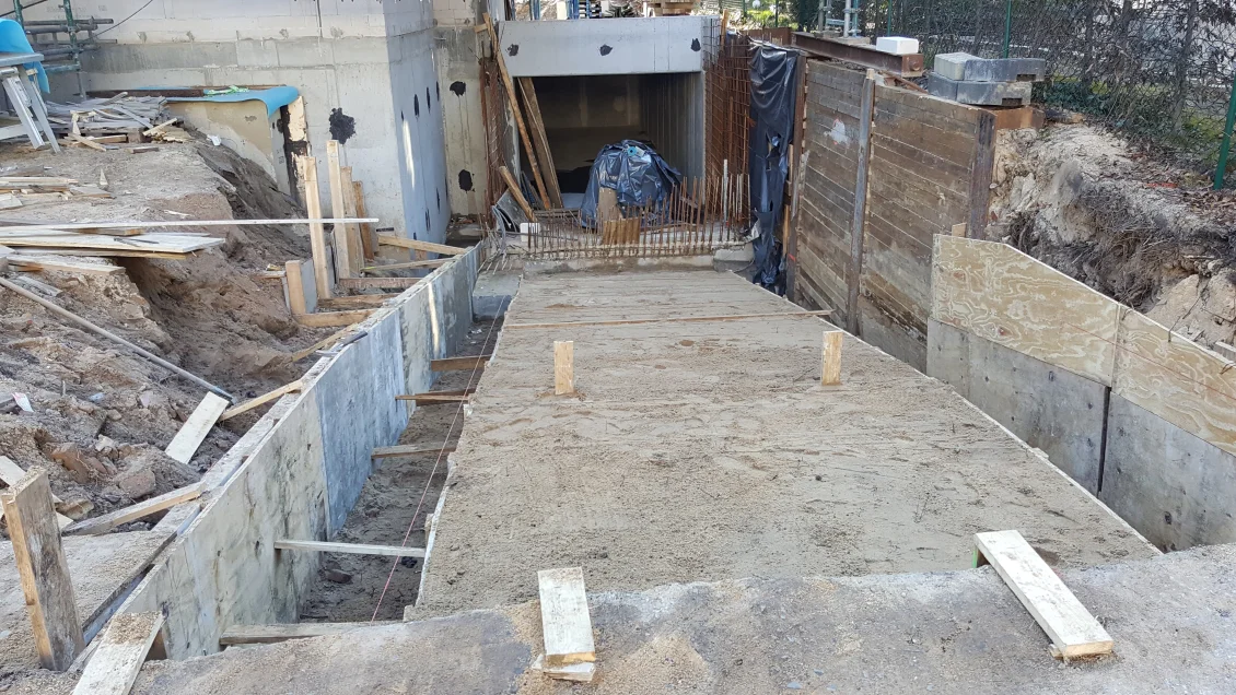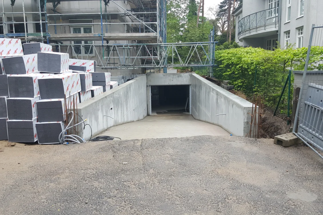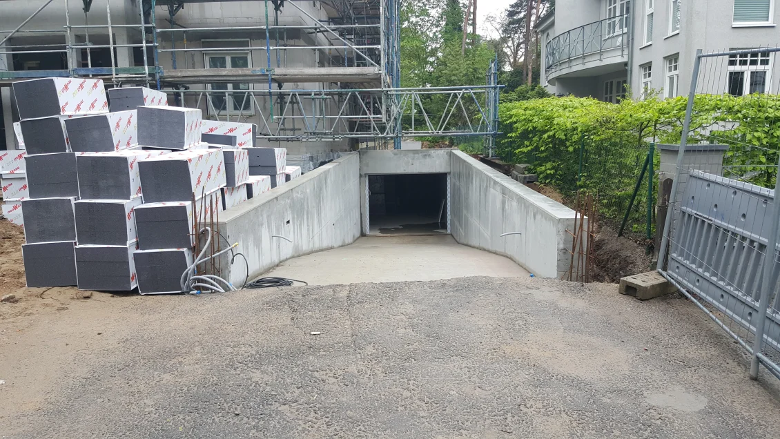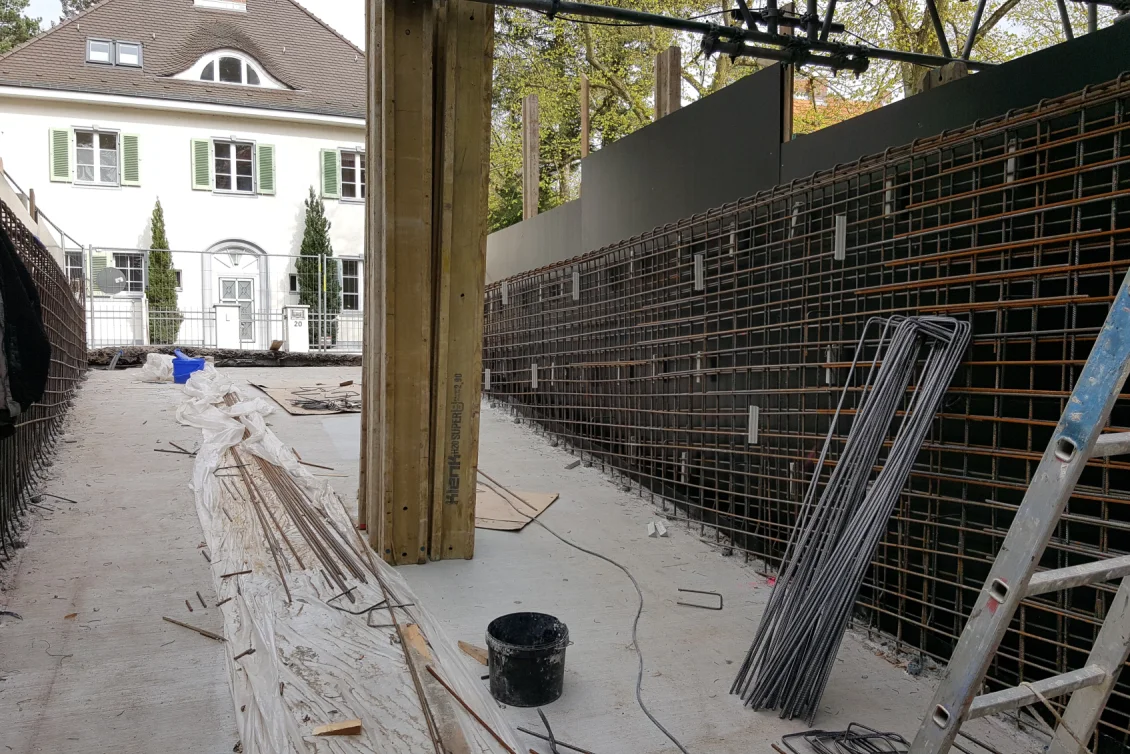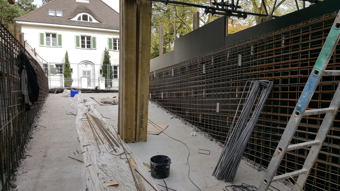Im Außenbereich wird die Tiefgaragenrampe mit Betonstahl bewehrt. Im Gebäude wurden die Schornsteine aufgemauert, die letzten Installationsleitungen verlegt und die Trockenbauwände bodenseitig abgestellt. Damit sind die Vorbereitungen zur Verlegung der Fußbodenheizung abgeschlossen.