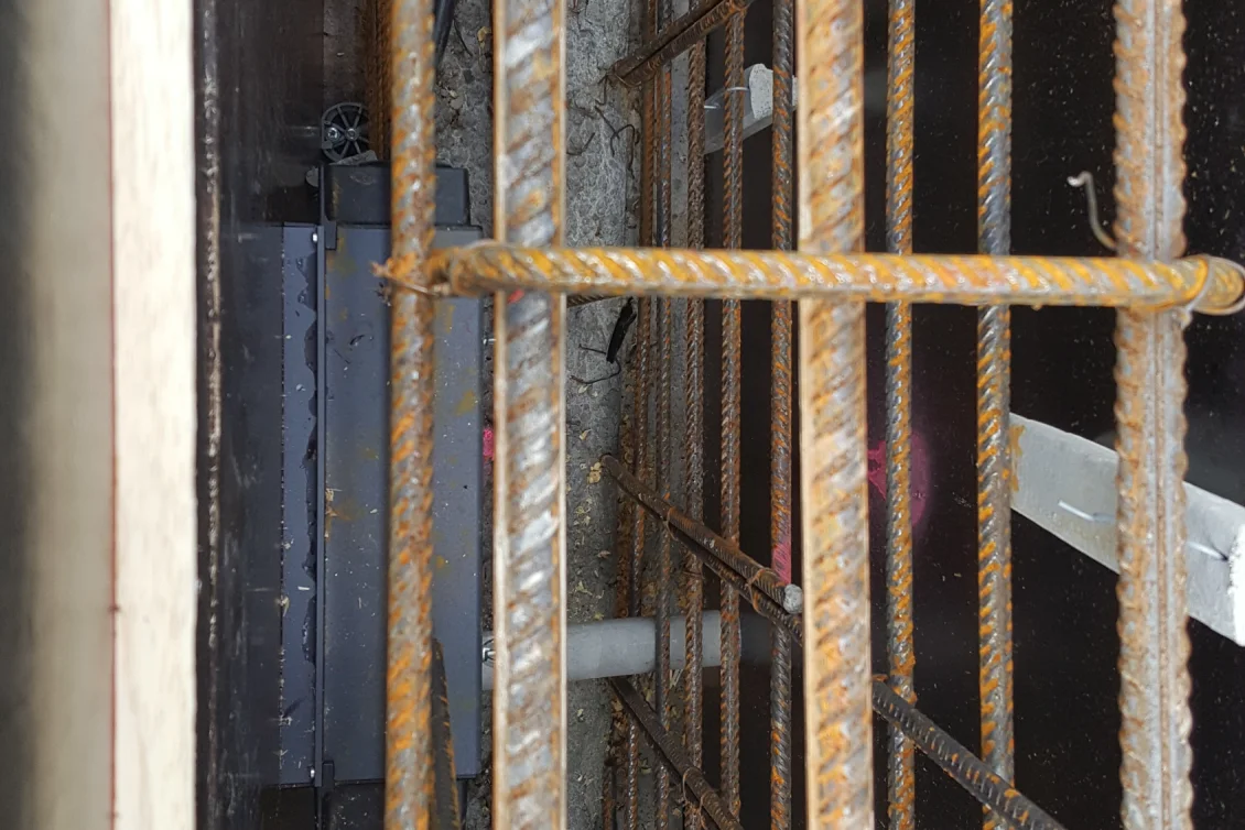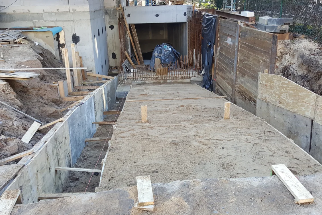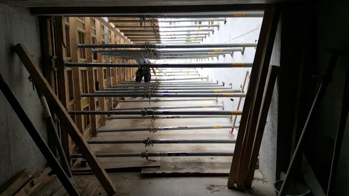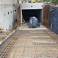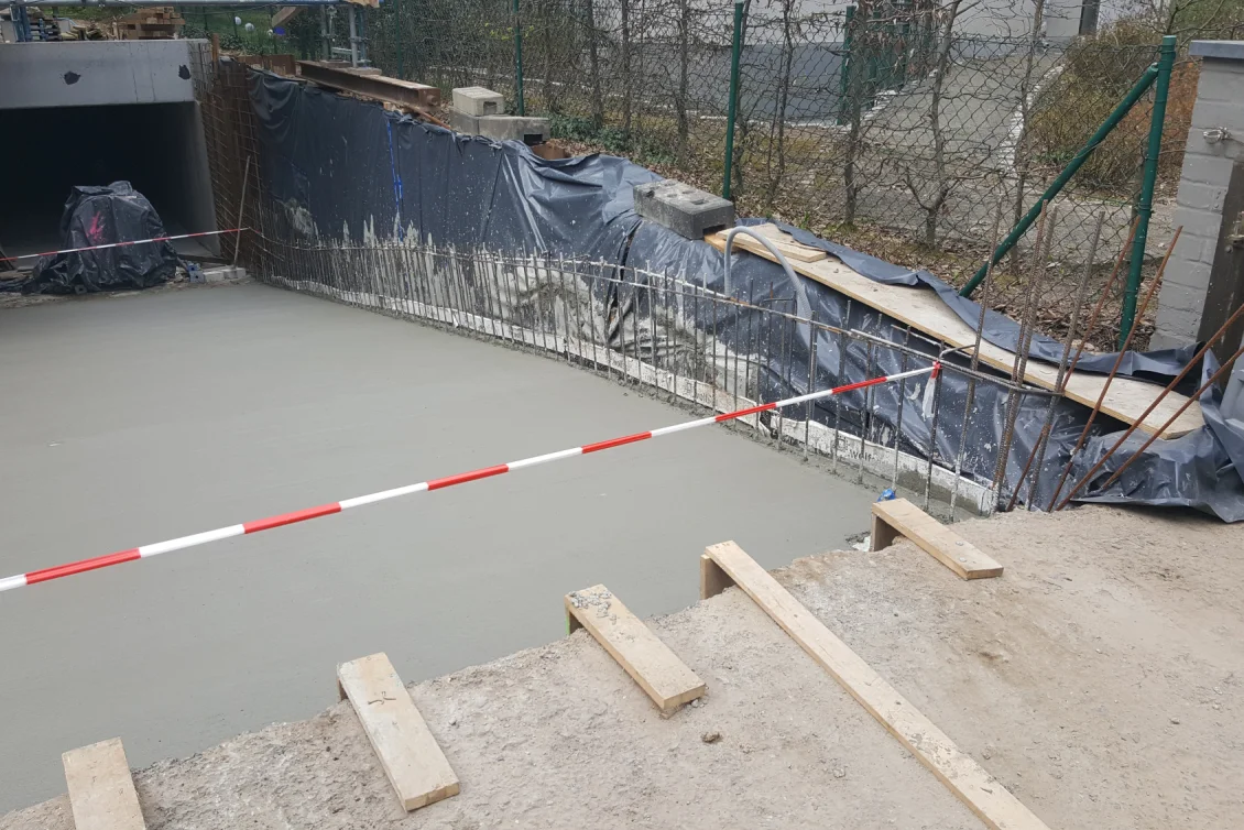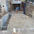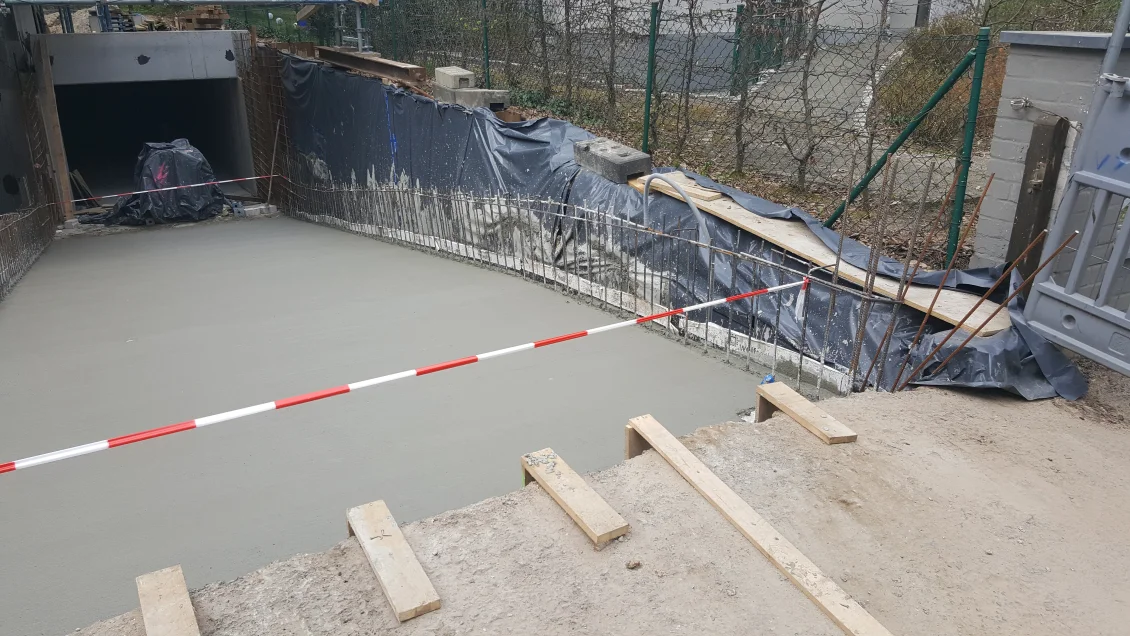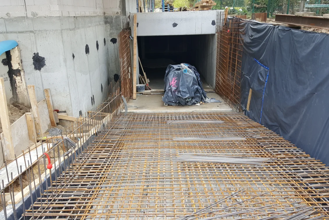 Im Außenbereich wird die Tiefgaragenrampe mit Betonstahl bewehrt. Im Gebäude wurden die Schornsteine aufgemauert, die letzten Installationsleitungen verlegt und die Trockenbauwände bodenseitig abgestellt. Damit sind die Vorbereitungen zur Verlegung der Fußbodenheizung abgeschlossen.