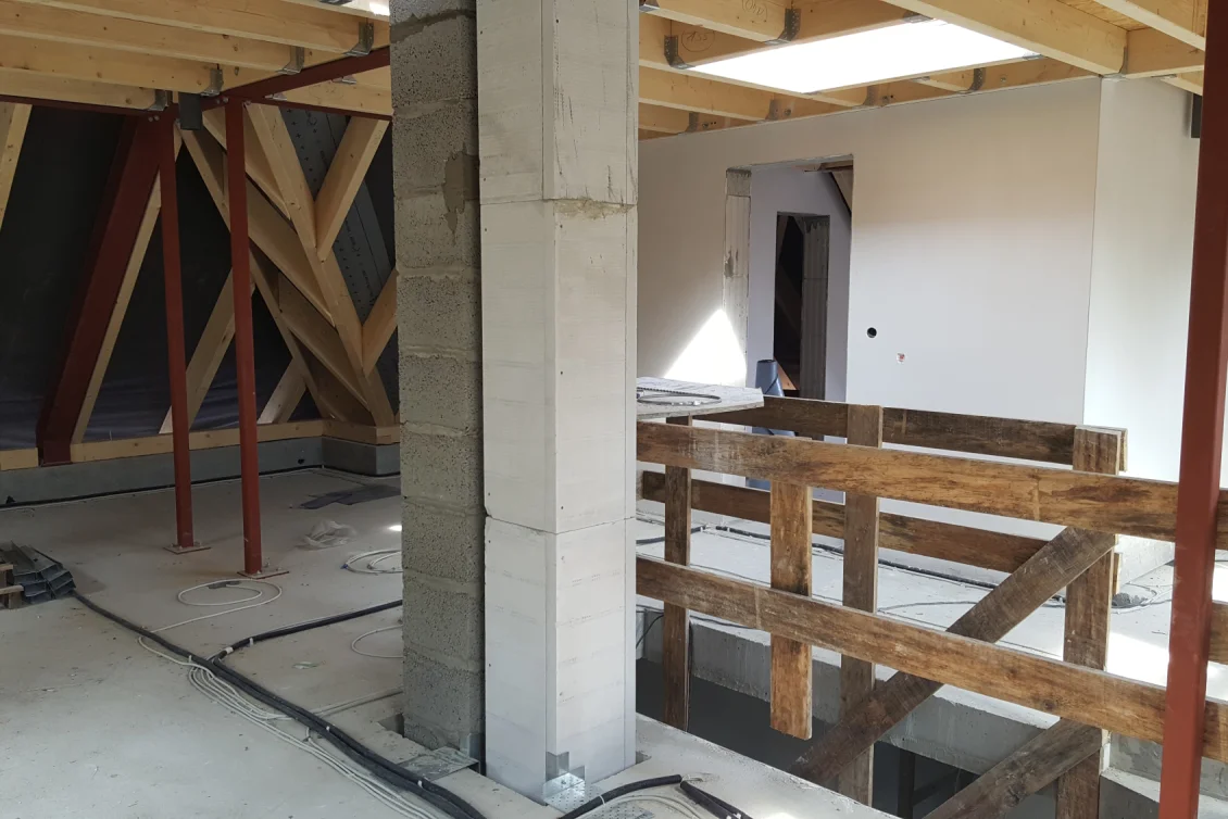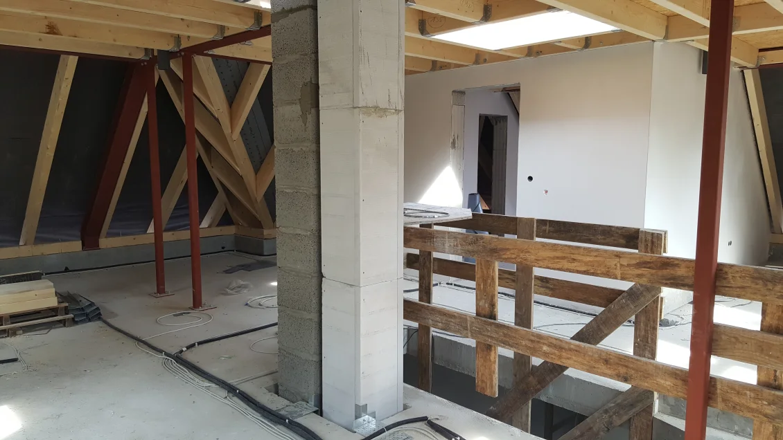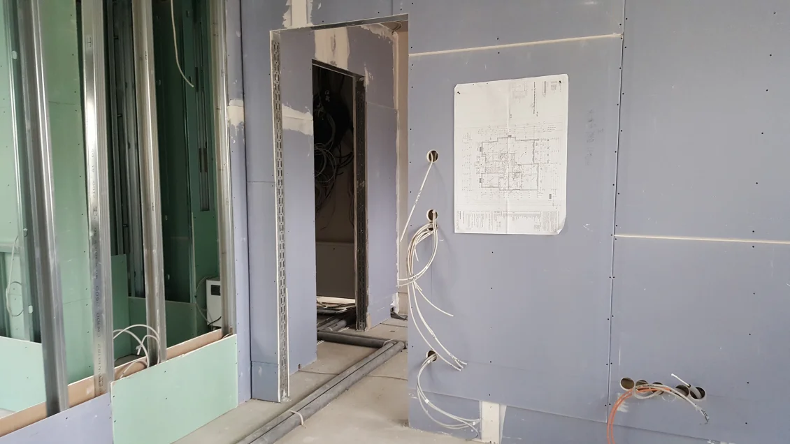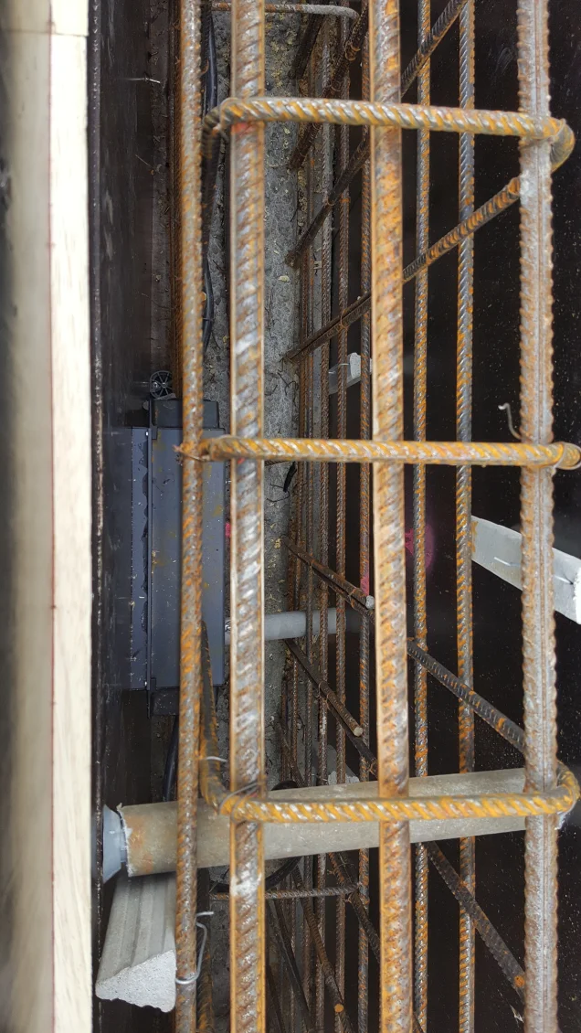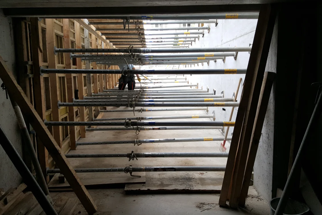 Im Außenbereich wird die Tiefgaragenrampe mit Betonstahl bewehrt. Im Gebäude wurden die Schornsteine aufgemauert, die letzten Installationsleitungen verlegt und die Trockenbauwände bodenseitig abgestellt. Damit sind die Vorbereitungen zur Verlegung der Fußbodenheizung abgeschlossen.